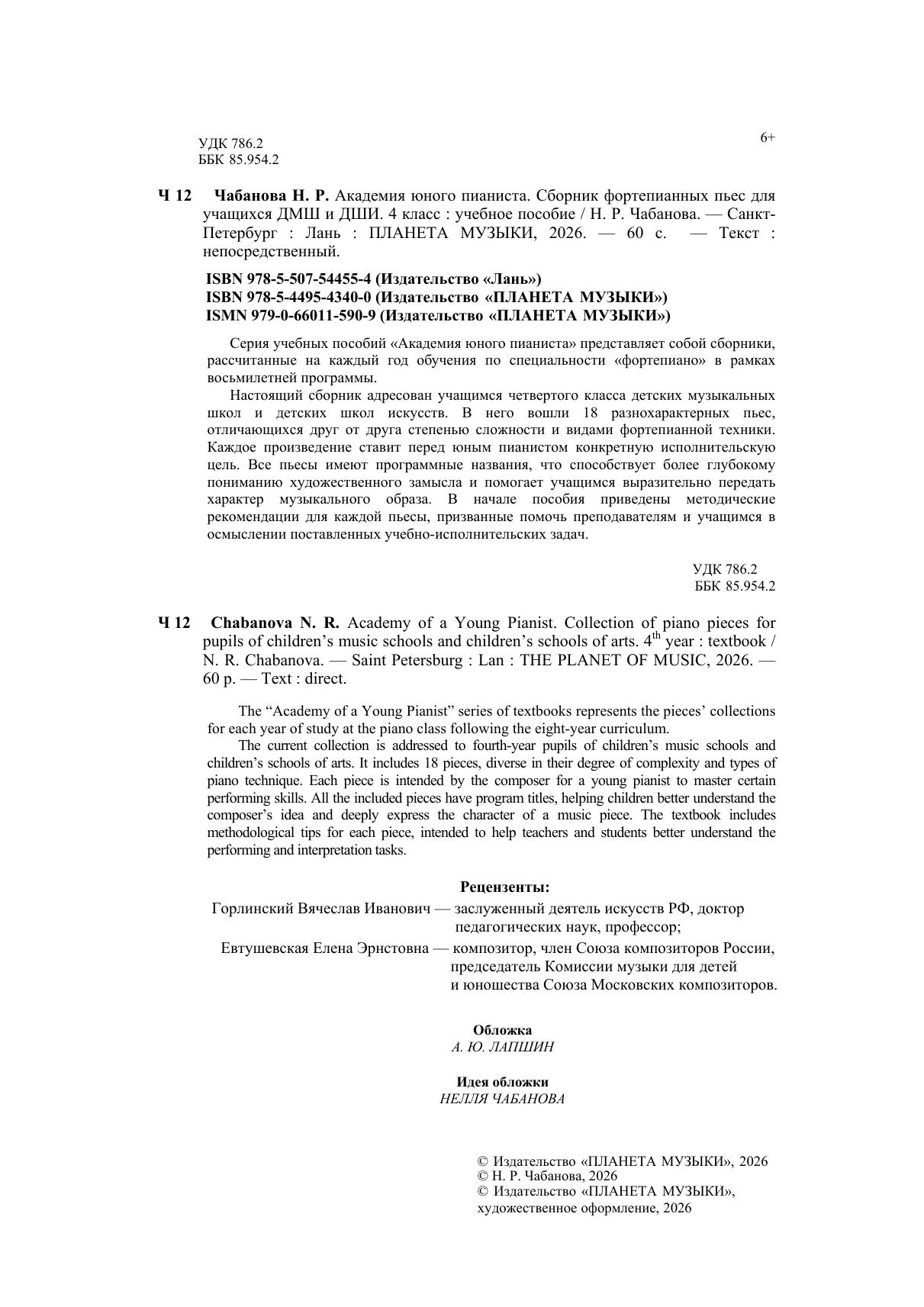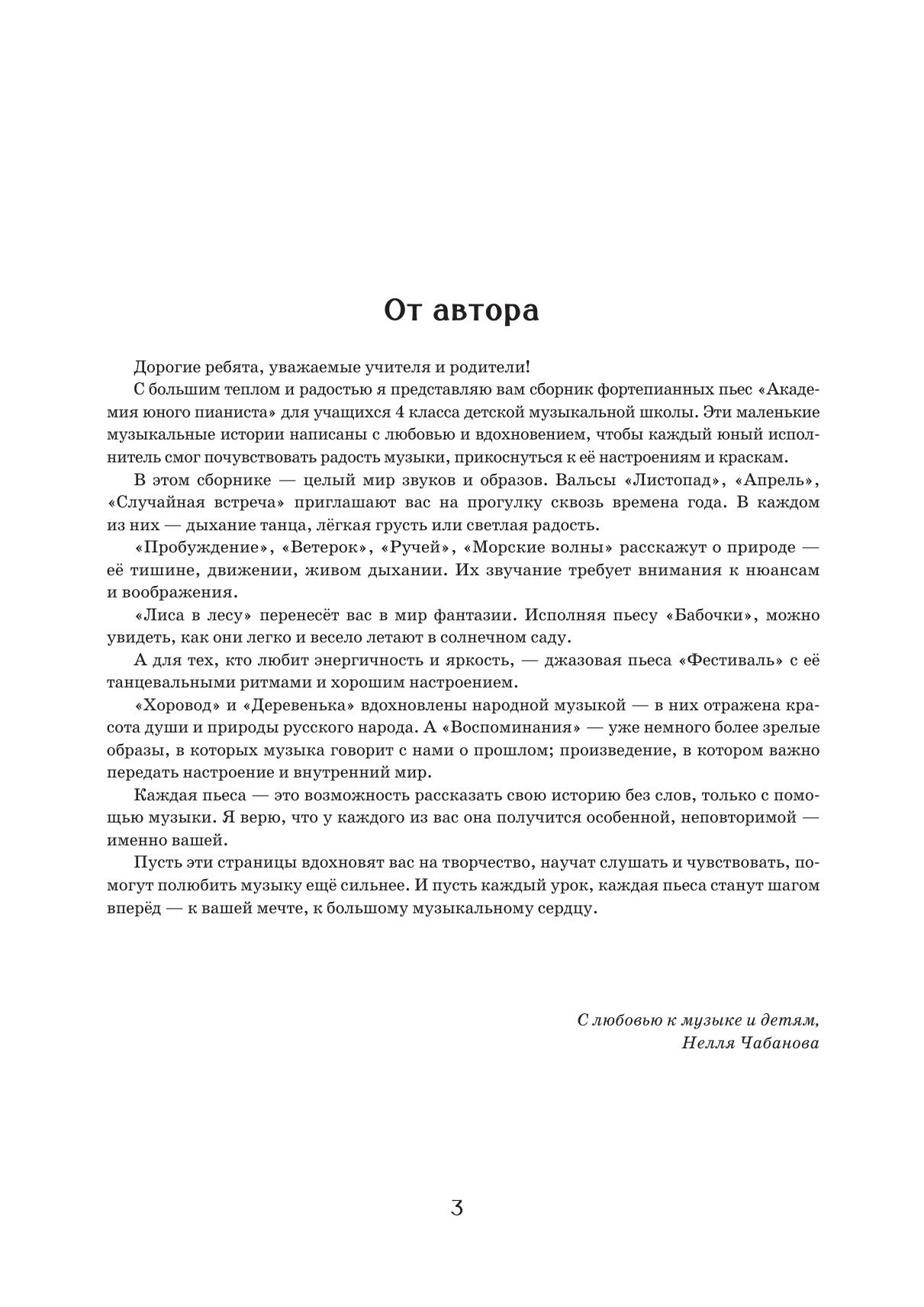 Серия учебных пособий «Академия юного пианиста» представляет собой сборники, рассчитанные на каждый год обучения по специальности «фортепиано» в рамках восьмилетней программы. Настоящий сборник адресован учащимся четвертого класса детских музыкальных школ и детских школ искусств. В него вошли 18 разнохарактерные пьесы, отличающиеся друг от друга степенью сложности и видами фортепианной техники. Каждое произведение ставит перед юным пианистом конкретную исполнительскую цель. Все пьесы имеют программные названия, что способствует более глубокому пониманию художественного замысла и помогает учащимся выразительно передать характер музыкального образа. В начале пособия приведены методические рекомендации для каждой пьесы, призванные помочь преподавателям и учащимся в осмыслении поставленных учебно-исполнительских задач. The “Academy of a Young Pianist” series of textbooks represents the pieces’ collections for each year of study at the piano class following the eight-year curriculum. The current collection is addressed to fourth-year pupils of children’s music schools and children’s schools of arts. It includes 18 pieces, diverse in their degree of complexity and types of piano technique. Each piece is intended by the composer for a young pianist to master certain performing skills. All the included pieces have program titles, helping children better understand the composer’s idea and deeply express the character of a music piece. The textbook includes methodological tips for each piece, intended to help teachers and students better understand the performing and interpretation tasks.