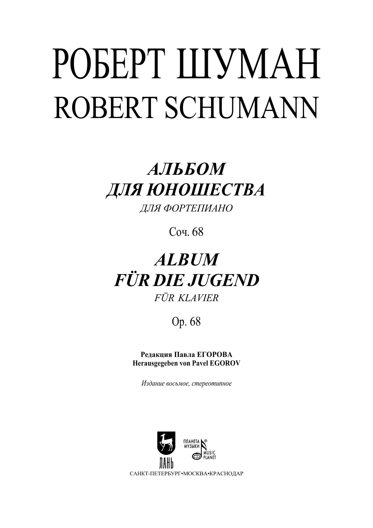 Прошло чуть более 150 лет с тех пор, как появилось одно из самых популярных сочинений великого немецкого композитора-романтика Роберта Шумана — «Альбом для юношества». Музыка эта и в наше время волнует творческое воображение юных музыкантов. Вряд ли найдется известный пианист, который в юности не встретился бы с этим произведением. «Альбом для юношества» известен во множестве редакций. Нынешнее издание в своем роде уникально. Это — наиболее полное из когда-либо предпринимавшихся в нашей стране изданий. Впервые в России выходят в свет одиннадцать пьес, которые были созданы композитором для «Альбома», но по разным причинам не вошли в него при жизни автора. Их вы найдете в конце сборника. Там же приведены «Жизненные правила для молодых музыкантов» Р. Шумана в переводе другого великого композитора — П. И. Чайковского. Мы уверены, что «Альбом для юношества» в редакции П. Г. Егорова и О. В. Лосевой заинтересует не только юных пианистов, которым он изначально адресован, но и музыкантов-профессионалов. It has been a little more than 150 years since one of the most popular works by the great German romantic composer Robert Schumann, «Album for the Young», appeared. This music and in our time is concerned with the creative imagination of young musicians. It is unlikely that there will be a well-known pianist who, in his youth, would not have come across this work. «Album for the Young» is known in a variety of editions. The current edition of its kind is unique. This is the most complete edition ever published in our country. For the first time in Russia, eleven plays are published, which were created by the composer for «Album», but for various reasons did not enter into it during the author's lifetime. You will find them at the end of the collection. There are also «Life Rules for Young Musicians» by R. Schumann translated by another great composer, P. I. Tchaikovsky. We are sure that the «Album for Young» in the editorship of P. G. Egorov and O. V. Loseva will be of inter