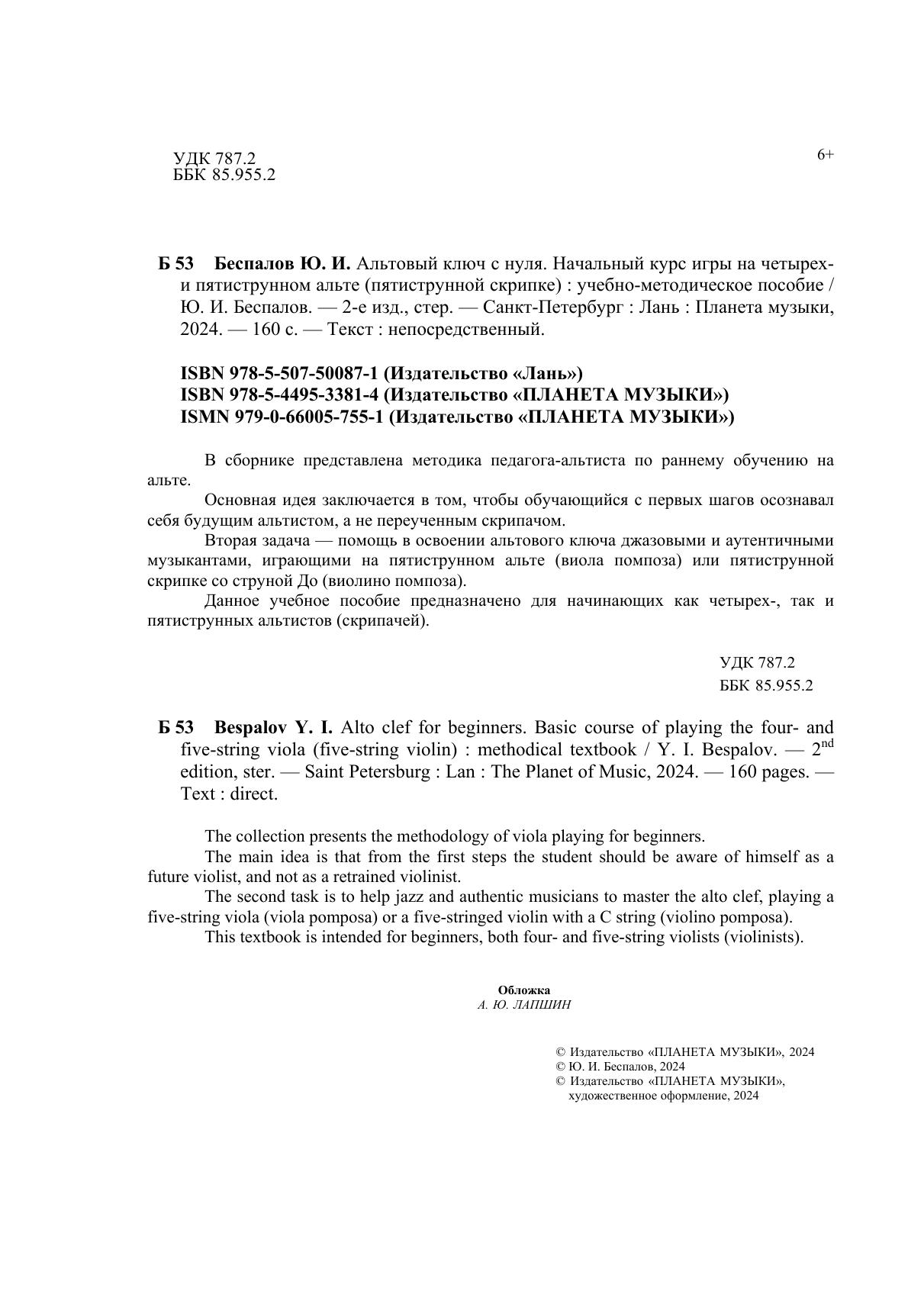 В сборнике представлена методика педагога-альтиста по раннему обучению на альте. Основная идея заключается в том, чтобы обучающийся с первых шагов осознавал себя будущим альтистом, а не переученным скрипачом-неудачником. Вторая задача - помощь в освоении альтового ключа джазовыми и аутентичными музыкантами, играющими на пятиструнном альте - виола помпоза или пятиструнной скрипке со струной До- виолино помпоза. Данное учебное пособие предназначено для начинающих как четырех, так и пятиструнных альтистов -скрипачей.