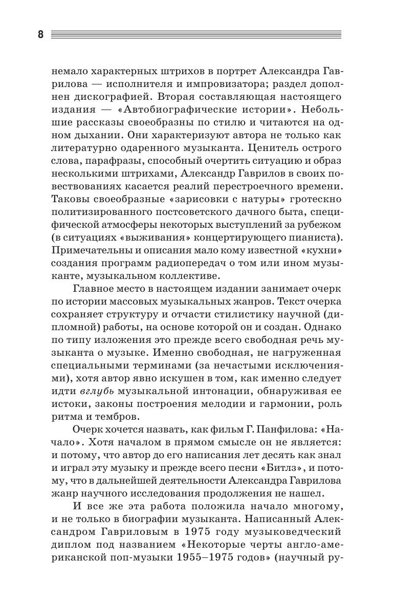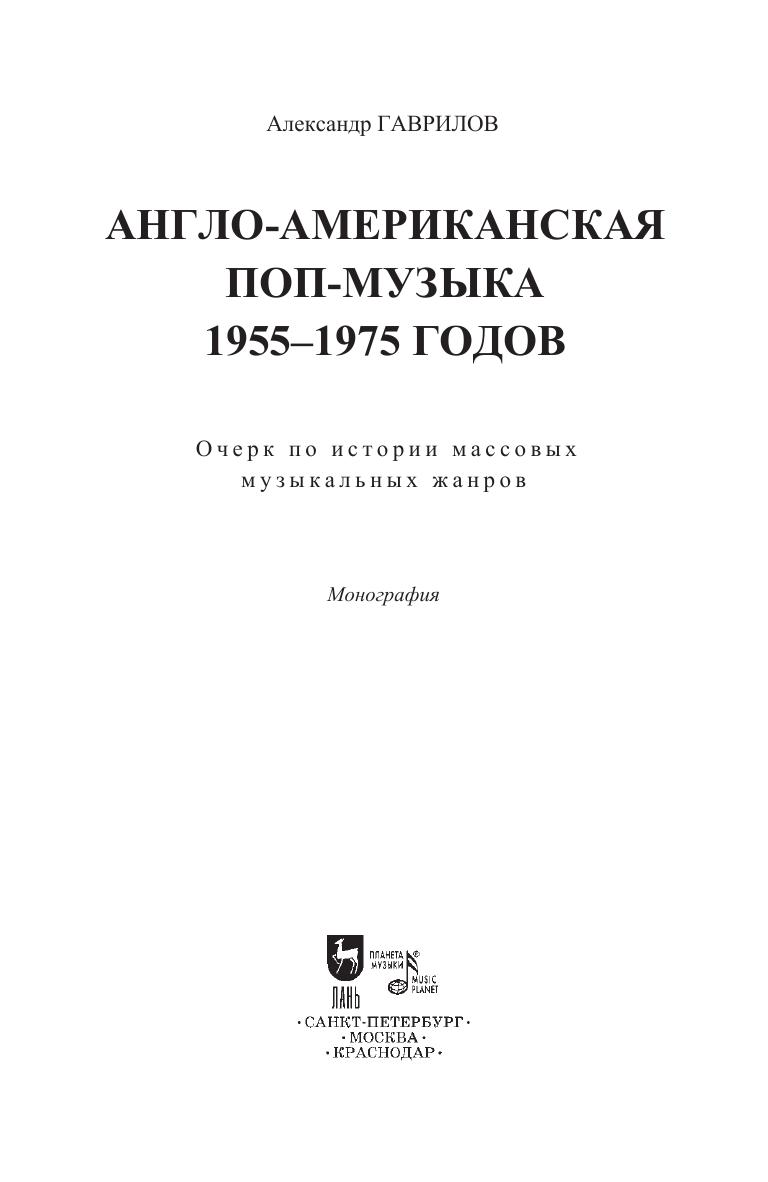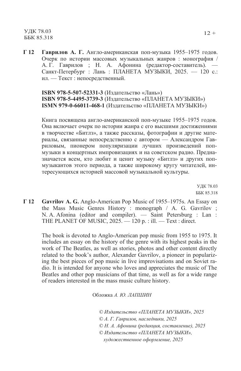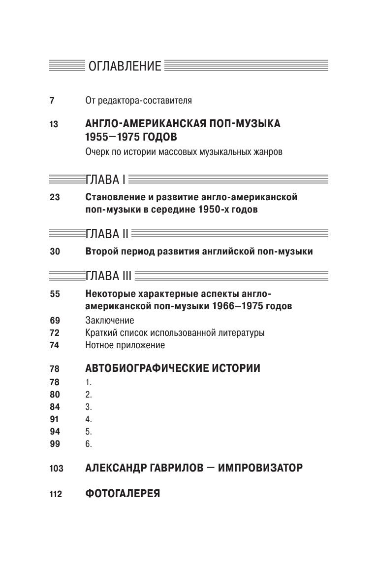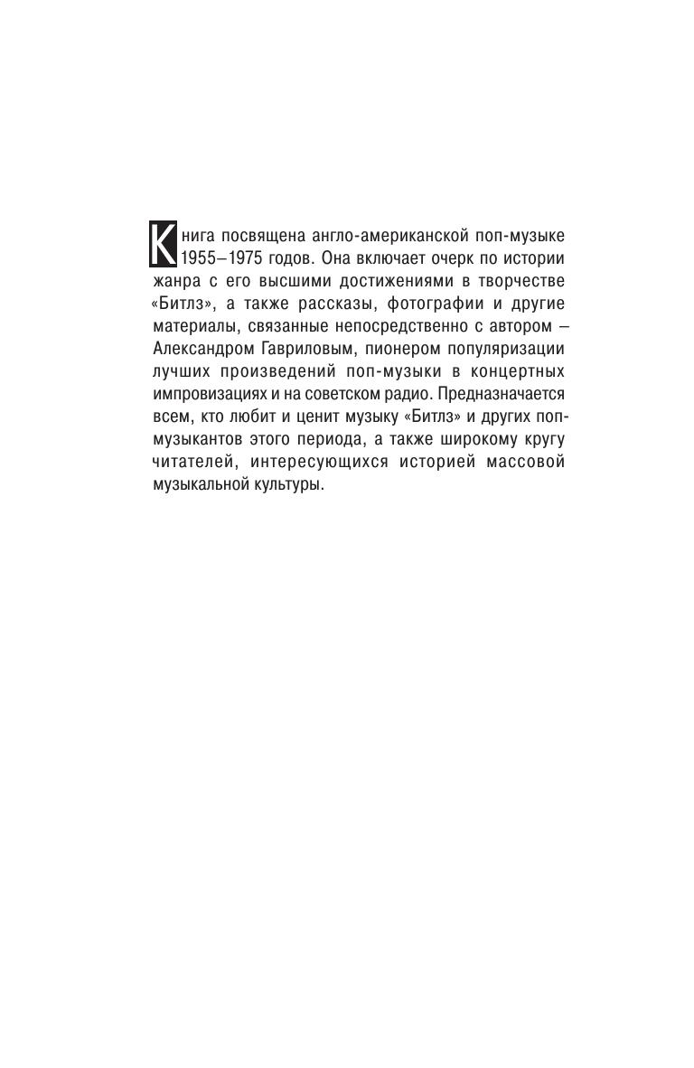 Книга посвящена англо-американской поп-музыке 1955–1975 годов. Она включает очерк по истории жанра с его высшими достижениями в творчестве Битлз, а также рассказы, фотографии и другие материалы, связанные непосредственно с автором — Александром Гавриловым, «пионером» популяризации лучших произведений поп-музыки в концертных импровизациях и на советском радио. Предназначается всем, кто любит и ценит музыку Битлз и других поп-музыкантов этого периода, а также широкому кругу читателей, интересующихся историей массовой музыкальной культуры. The book is devoted to Anglo-American pop music from 1955 to 1975. It includes an essay on the history of the genre with its highest peaks in the work of The Beatles, as well as stories, photos and other content directly related to the book’s author, Alexander Gavrilov, a pioneer in popularizing the best pieces of pop music in live improvisations and on Soviet radio. It is intended for anyone who loves and appreciates the music of The Beatles and other pop musicians of that time, as well as for a wide range of readers interested in the mass music culture history.