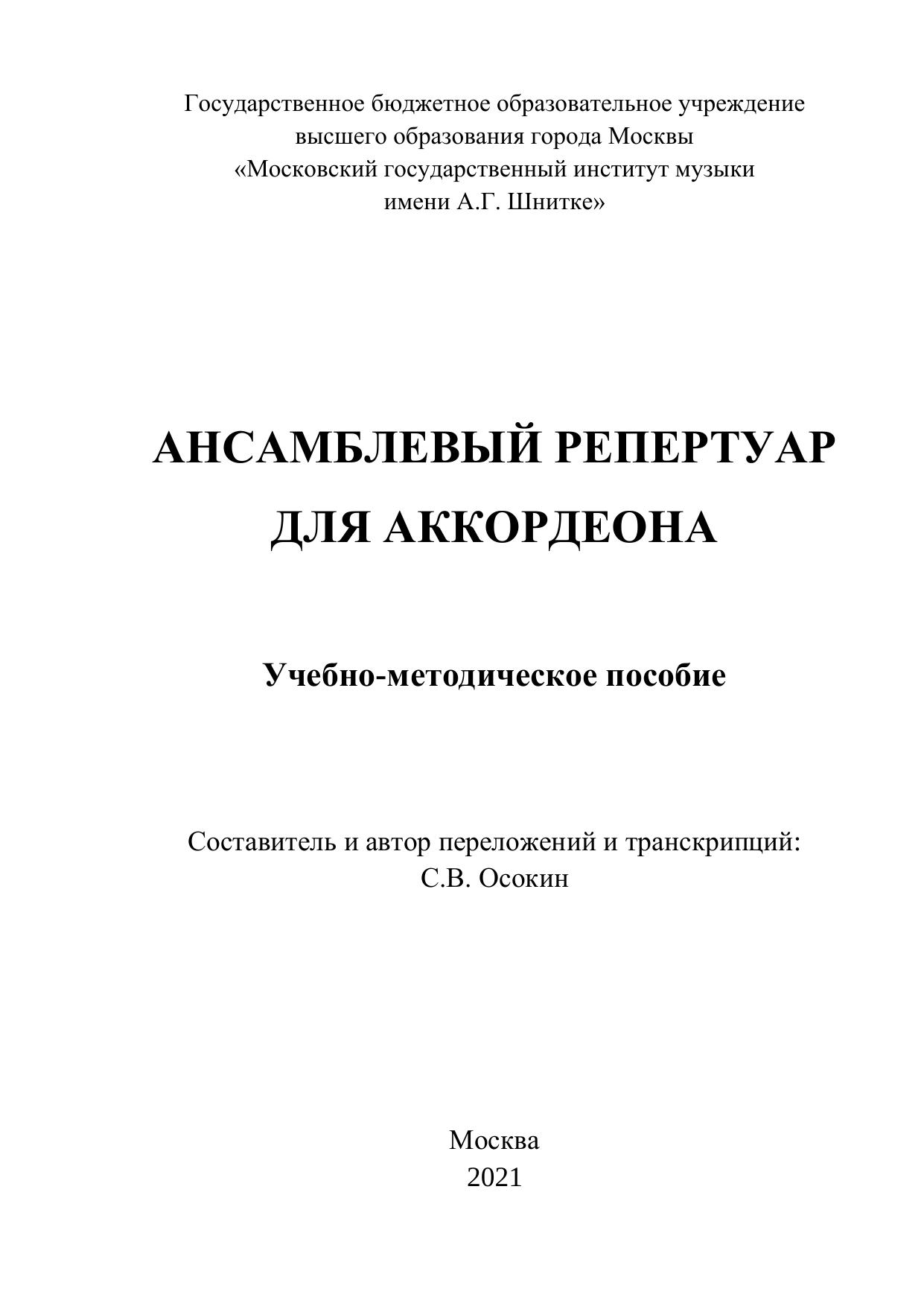 Настоящее учебно-методическое пособие для аккордеона содержит методические рекомендации по исполнению ансамблевых сочинений и включает новые транскрипции, переложения музыкальных произведений зарубежных, русских и советских композиторов для ансамбля с участием аккордеона. Издание адресовано студентам средних и высших образовательных учреждений с целью совершенствования ансамблевого исполнительского мастерства, формирования профессиональных компетенций.