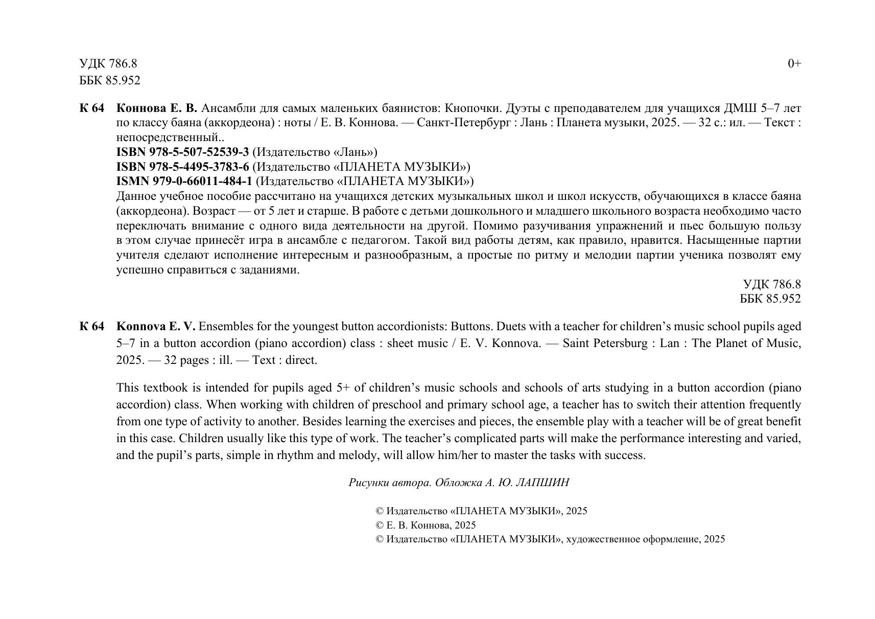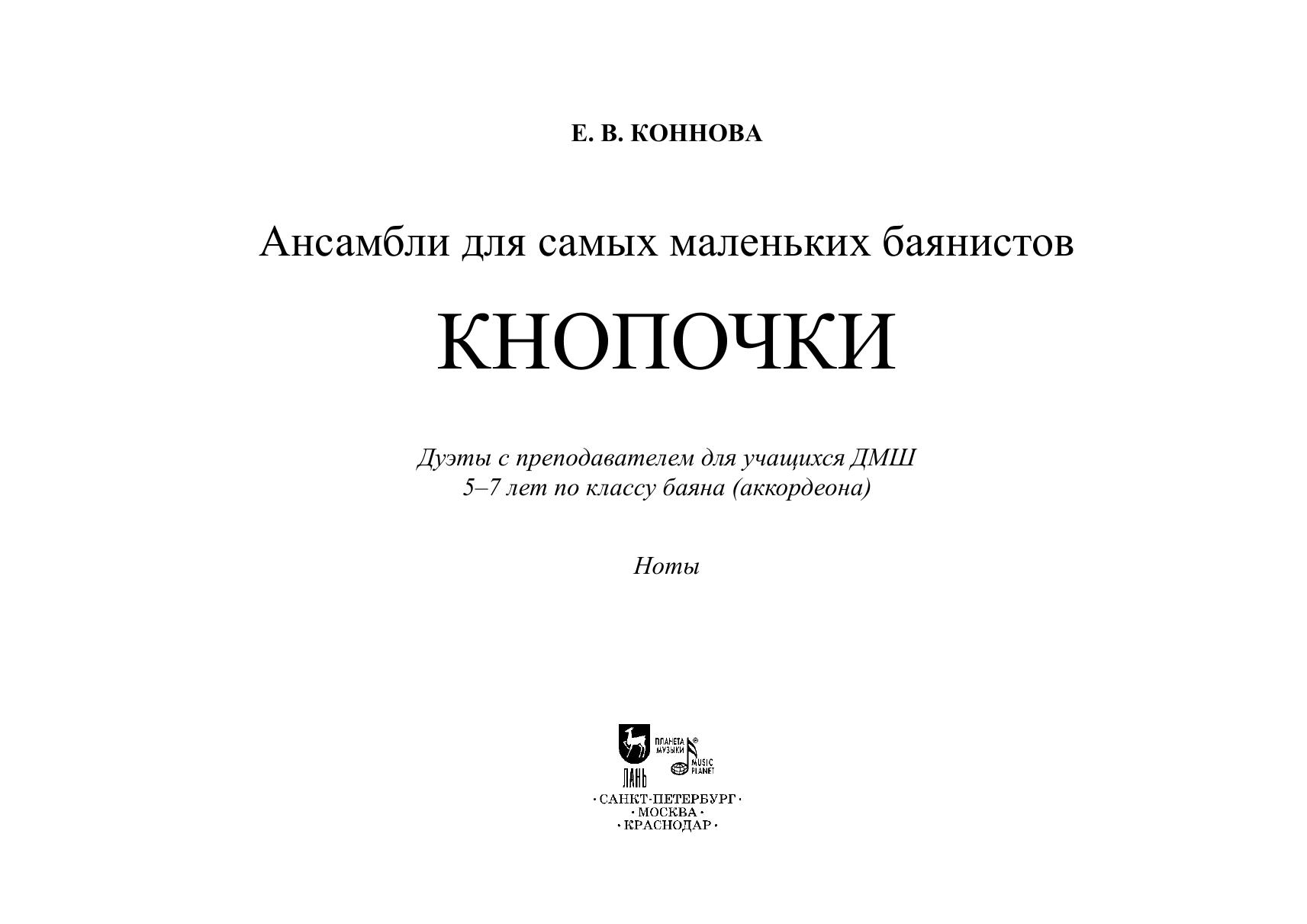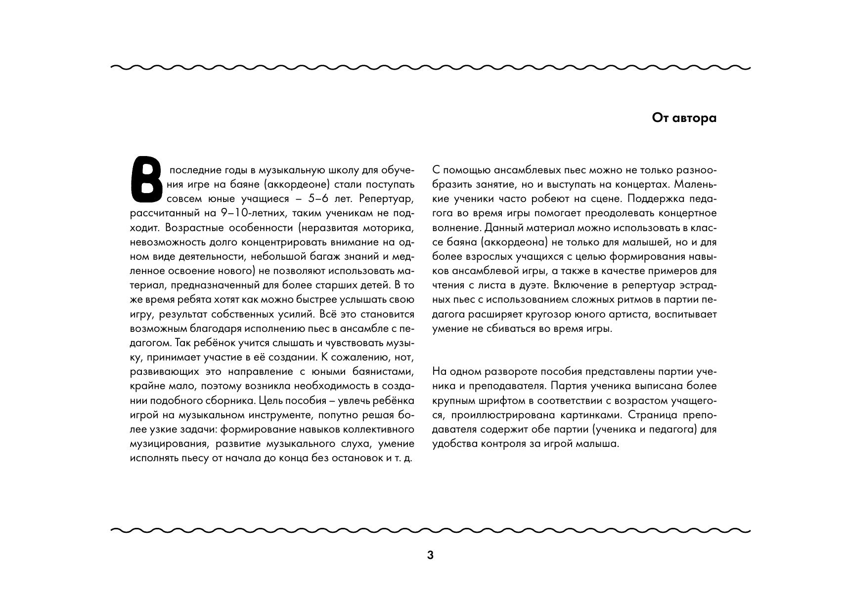 Данное учебное пособие рассчитано на учащихся детских музыкальных школ и школ искусств, обучающихся в классе баяна (аккордеона). Возраст – от 5 лет и старше. В работе с детьми младшего школьного и дошкольного возраста необходимо часто переключать внимание с одного вида деятельности на другой. Помимо разучивания упражнений и пьес большую пользу в этом случае принесёт игра в ансамбле с педагогом. Такой вид работы детям, как правило, нравится. Насыщенные партии учителя сделают исполнение интересным и разнообразным, а простые по ритму и мелодии партии ученика позволят ему успешно справиться с заданиями. This textbook is intended for pupils aged 5+ of children’s music schools and schools of arts studying in a button accordion (piano accordion) class. When working with children of preschool and primary school age, a teacher has to switch their attention frequently from one type of activity to another. Besides learning the exercises and pieces, the ensemble play with a teacher will be of great benefit in this case. Children usually like this type of work. The teacher’s complicated parts will make the performance interesting and varied, and the pupil’s parts, simple in rhythm and melody, will allow him/her to master the tasks with success.
