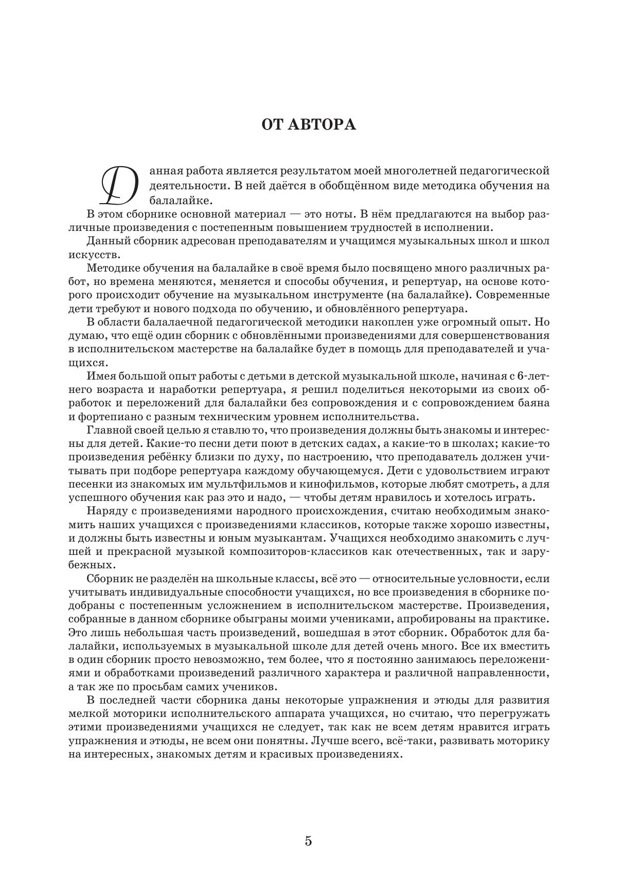 Данный сборник адресован преподавателям и учащимся музыкальных школ и школ искусств. В него входят пьесы-ключи для начинающих учащихся с постепенным расширением исполнительского диапазона по мере изучения нот детьми. Начальные пьесы написаны с лёгким аккомпанементом для баяна и фортепиано с учётом, чтобы дети сами могли аккомпанировать друг другу. В дальнейшем пьесы усложняются, усложняется и аккомпанемент. В сборник входят пьесы ранее не входившие в программу обучения балалаечников по новой предпрофильной программе обучения.
