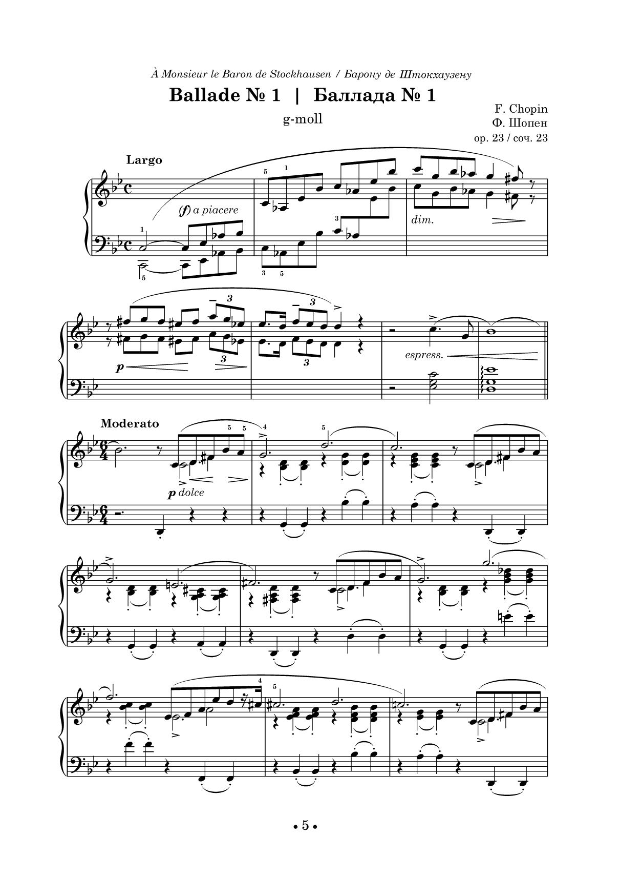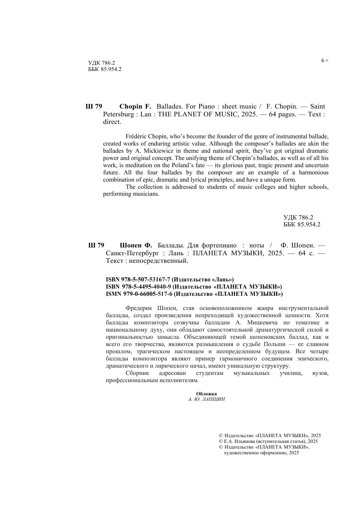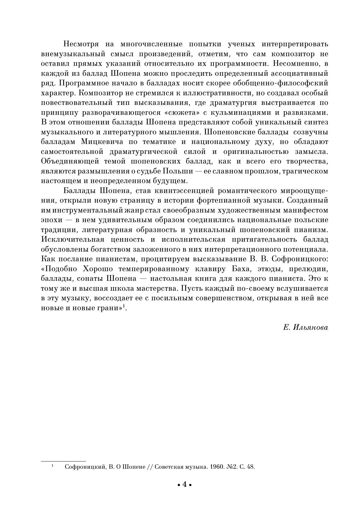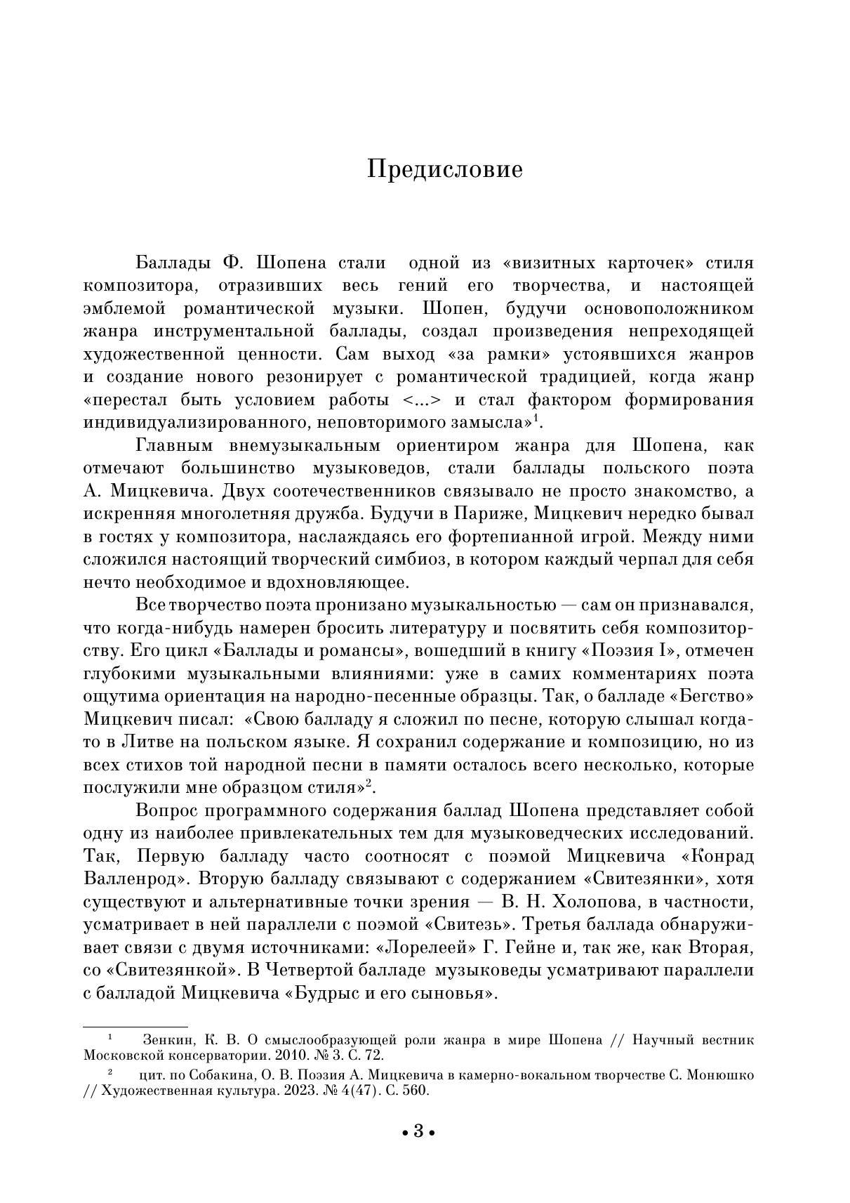 Фредерик Шопен, став основоположником жанра инструментальной баллады, создал произведения непреходящей художественной ценности. Хотя баллады композитора созвучны балладам А. Мицкевича по тематике и национальному духу, они обладают самостоятельной драматургической силой и оригинальностью замысла. Объединяющей темой шопеновских баллад, как и всего его творчества, являются размышления о судьбе Польши — ее славном прошлом, трагическом настоящем и неопределенном будущем. Все четыре баллады композитора являют пример гармоничного соединения эпического, драматического и лирического начал, имеют уникальную структуру. Сборник адресован студентам музыкальных училищ, вузов, профессиональным исполнителям. Frédéric Chopin, who’s become the founder of the genre of instrumental ballade, created works of enduring artistic value. Although the composer’s ballades are akin the ballades by A. Mickiewicz in theme and national spirit, they’ve got original dramatic power and original concept. The unifying theme of Chopin’s ballades, as well as of all his work, is meditation on the Poland’s fate — its glorious past, tragic present and uncertain future. All the four ballades by the composer are an example of a harmonious combination of epic, dramatic and lyrical principles, and have a unique form. The collection is addressed to students of music colleges and higher schools, performing musicians.