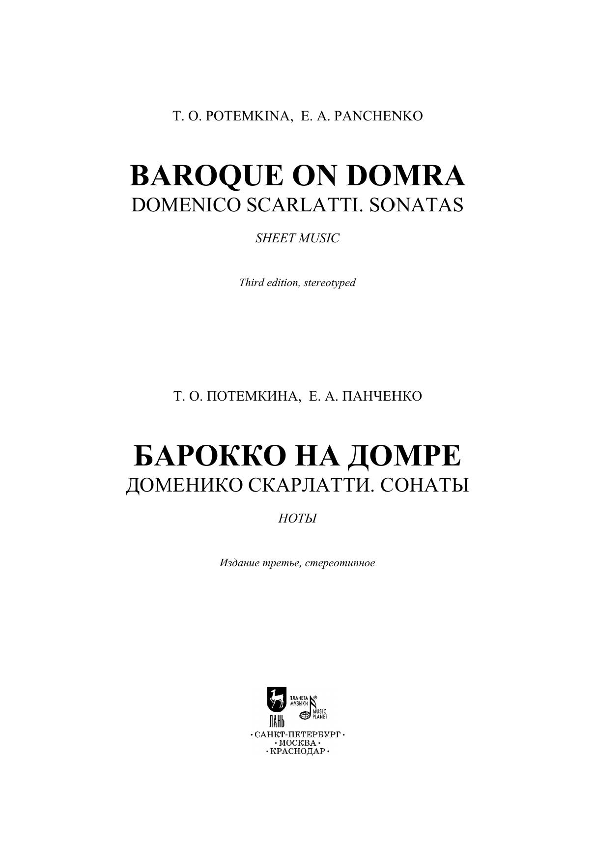 В сборник вошли семь сонат Доменико Скарлатти в переложении для домры и фортепиано известной петербургской домристки Татьяны Потемкиной. Партия клавира отредактирована композитором-мультиинструменталистом Елизаветой Панченко. Новизна данных переложений заключается, в опыте подхода к оригинальным текстам с позиций исторически информированного исполнительства. Сохранён «чистый» текст без редактуры динамики и штрихов, как это и было в основном принято в европейской музыке 17-18 вв. Сонаты, являясь ярким примером музыки эпохи барокко, расширят концертный репертуар домриста и служат хорошим материалом для развития профессионального исполнительства.