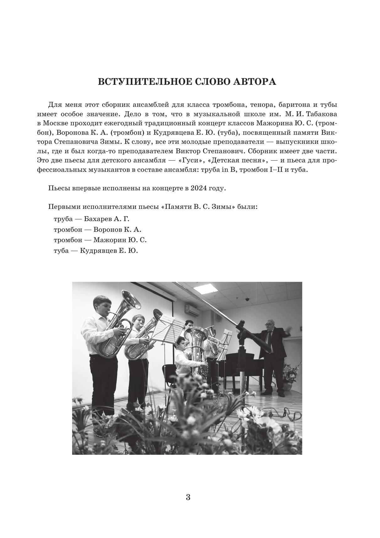 Сборник ансамблей для класса тромбона, тенора, баритона и тубы, посвященный памяти преподавателя ГБУДО г. Москвы «Детская музыкальная школа имени М.И. Табакова» по классу тубы и тромбона Зиме Виктору Степановичу (1940-2020) для преподавателей и учащихся ДМШ И ДШИ. The collection of ensembles for the trombone, tenor, baritone and tuba classes, dedicated to the memory of Viktor Stepanovich Zima (1940–2020), the teacher of the State Budgetary Educational Institution of Additional Education “The M.I. Tabakov Children’s Music School” (Moscow) of the tuba and trombone class, for teachers and students of children’s music schools and children’s schools of arts.