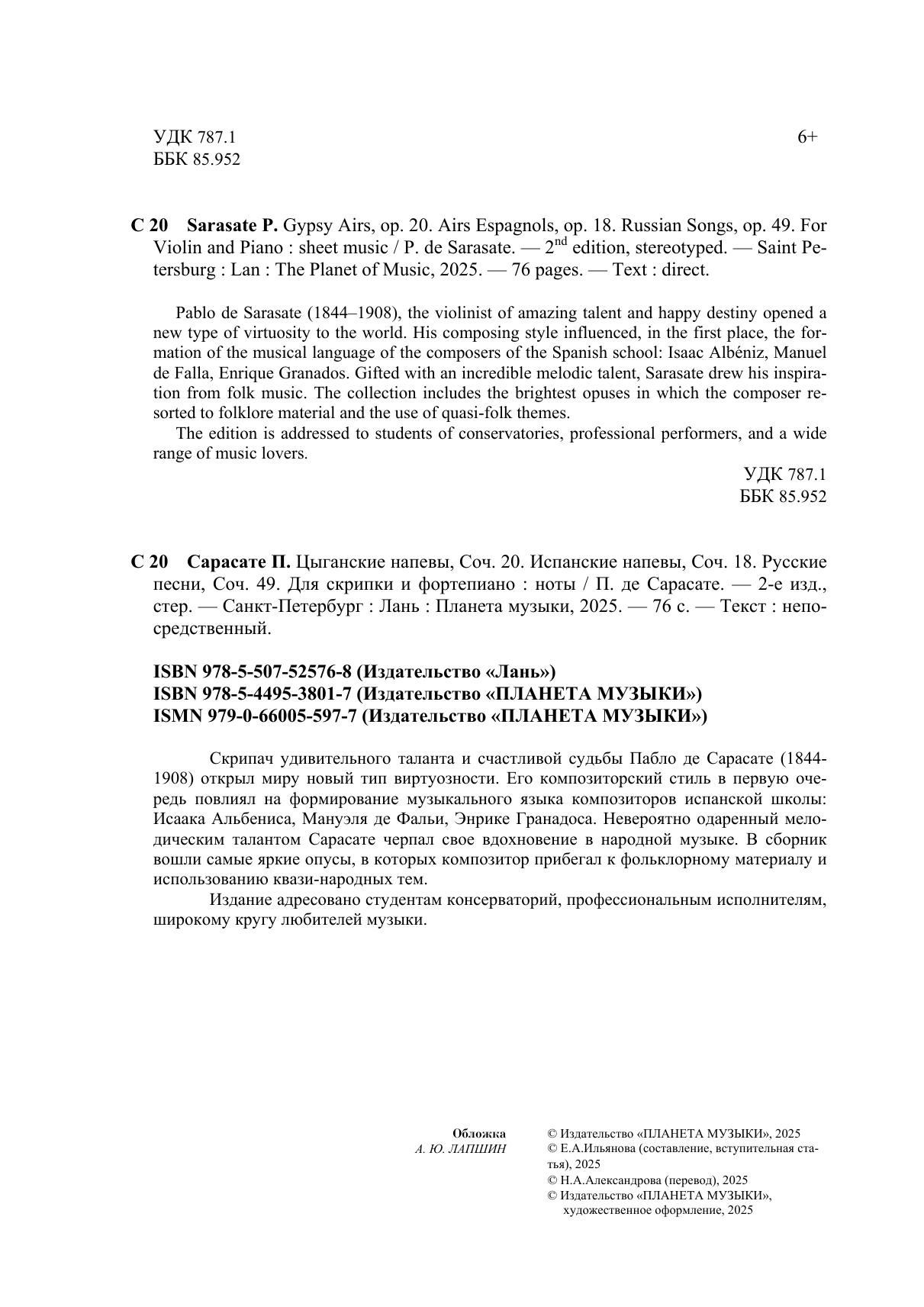 Скрипач удивительного таланта и счастливой судьбы Пабло де Сарасате (1844-1908) открыл миру новый тип виртуозности. Его композиторский стиль в первую очередь повлиял на формирование музыкального языка композиторов испанской школы: Исаака Альбениса, Мануэля де Фальи, Энрике Гранадоса. Невероятно одаренный мелодическим талантом Сарасате черпал свое вдохновение в народной музыке. В сборник вошли самые яркие опусы, в которых композитор прибегал к фольклорному материалу и использованию квази-народных тем. Издание адресовано студентам консерваторий, профессиональным исполнителям, широкому кругу любителей музыки.