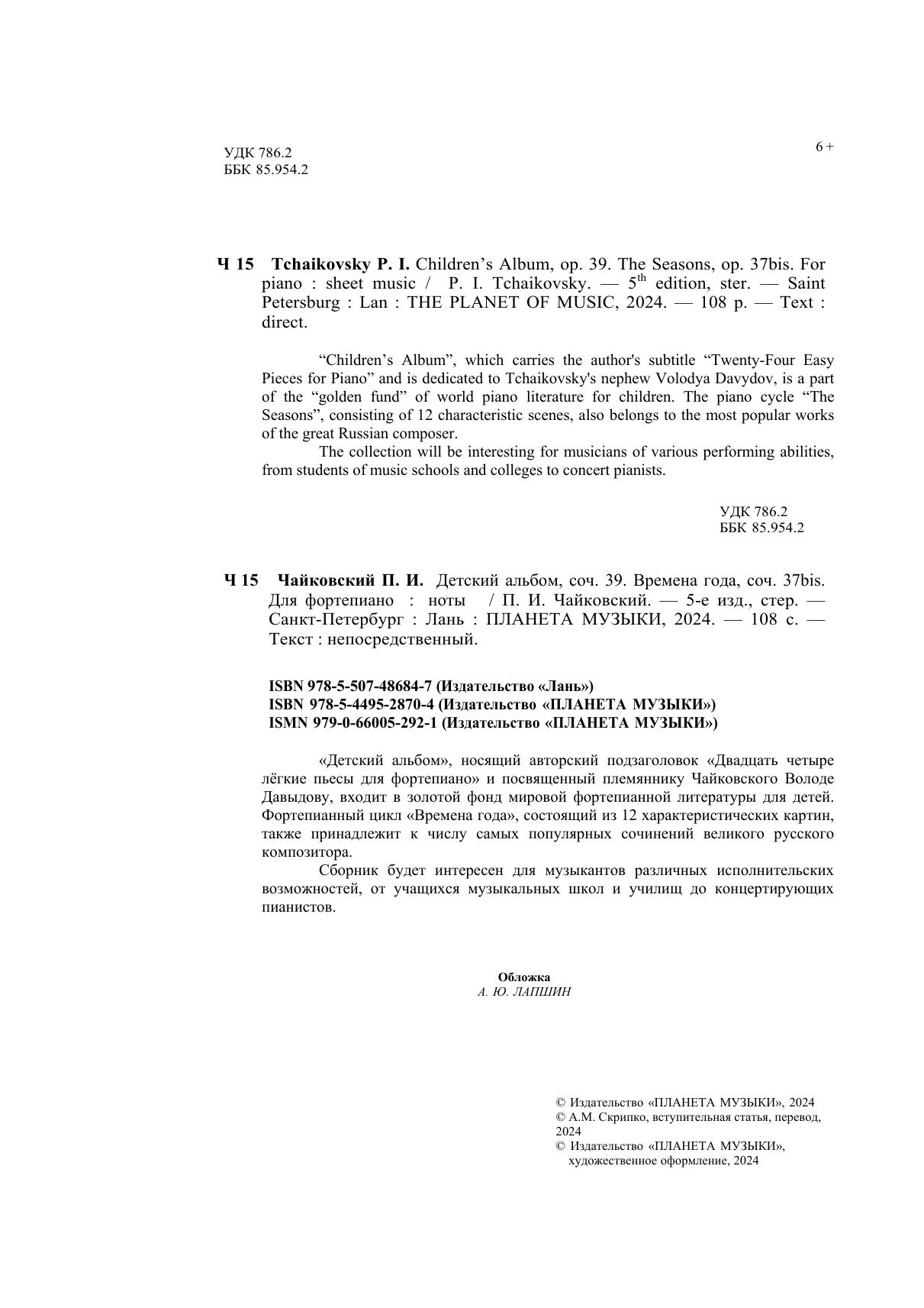 «Детский альбом», носящий авторский подзаголовок «Двадцать четыре лёгкие пьесы для фортепиано» и посвященный племяннику Чайковского Володе Давыдову, входит в золотой фонд мировой фортепианной литературы для детей. Фортепианный цикл «Времена года», состоящий из 12 характеристических картин, также принадлежит к числу самых популярных сочинений великого русского композитора. Сборник будет интересен для музыкантов различных исполнительских возможностей, от учащихся музыкальных школ и училищ до концертирующих пианистов. “Children’s Album”, which carries the author's subtitle "Twenty-Four Easy Pieces for Piano" and is dedicated to Tchaikovsky's nephew Volodya Davydov, enters the golden fund of world piano literature for children. The piano cycle "The Seasons", consisting of 12 characteristic scenes, also belongs to the most popular works of the great Russian composer. The collection will be interesting for musicians of various performing abilities, from students of music schools and colleges to concert pianists.