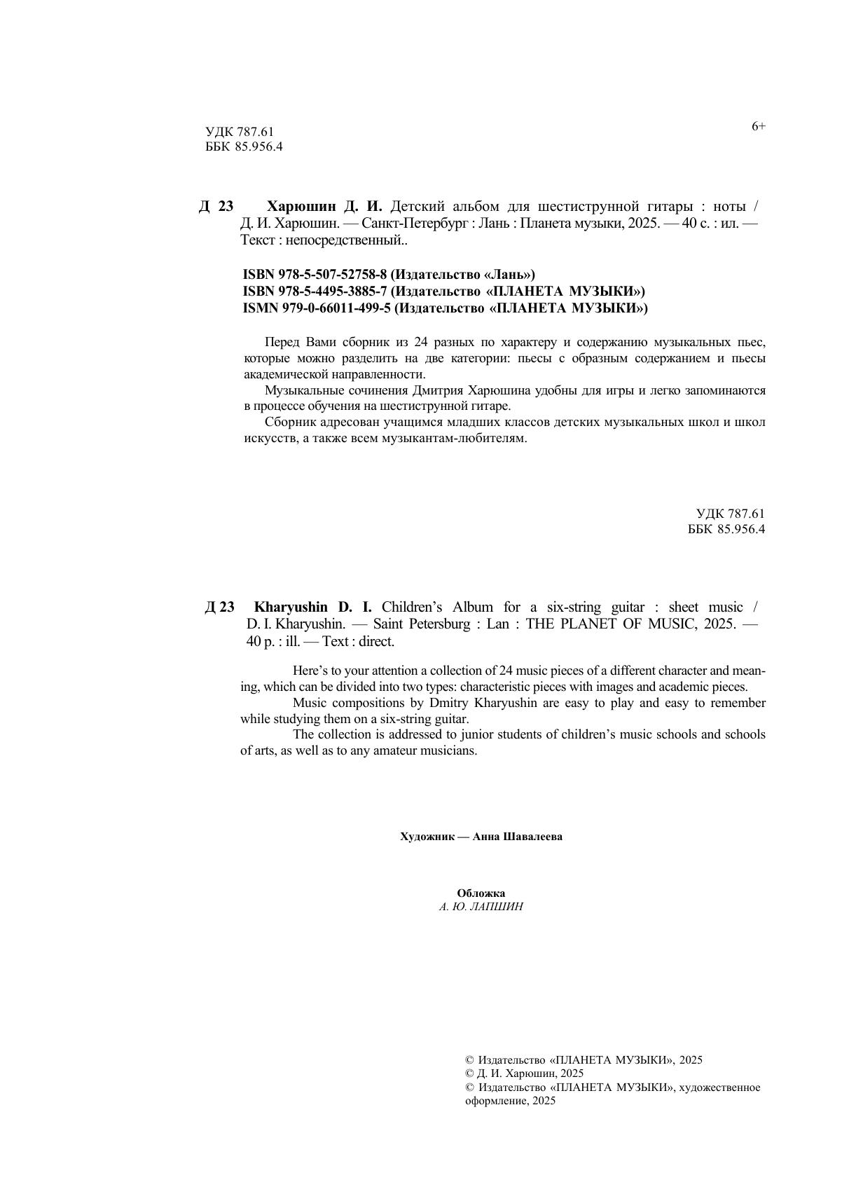 Перед Вами сборник из двадцати разных по характеру и содержанию музыкальных пьес, которые можно разделить на две категории: пьесы с образным содержанием и пьесы академической направленности. Музыкальные сочинения Дмитрия Харюшина удобны для игры и легко запоминаются в процессе обучения на шестиструнной гитаре. Сборник адресован учащимся младших классов детских музыкальных школ и школ искусств, а также всем музыкантам-любителям. Here’s to your attention a collection of 24 music pieces of a different character and meaning, which can be divided into two types: characteristic pieces with images and academic pieces. Music compositions by Dmitry Kharyushin are easy to play and easy to remember while studying them on a six-string guitar. The collection is addressed to junior students of children’s music schools and schools of arts, as well as to any amateur musicians.