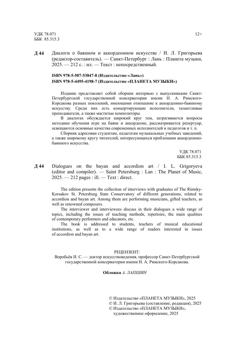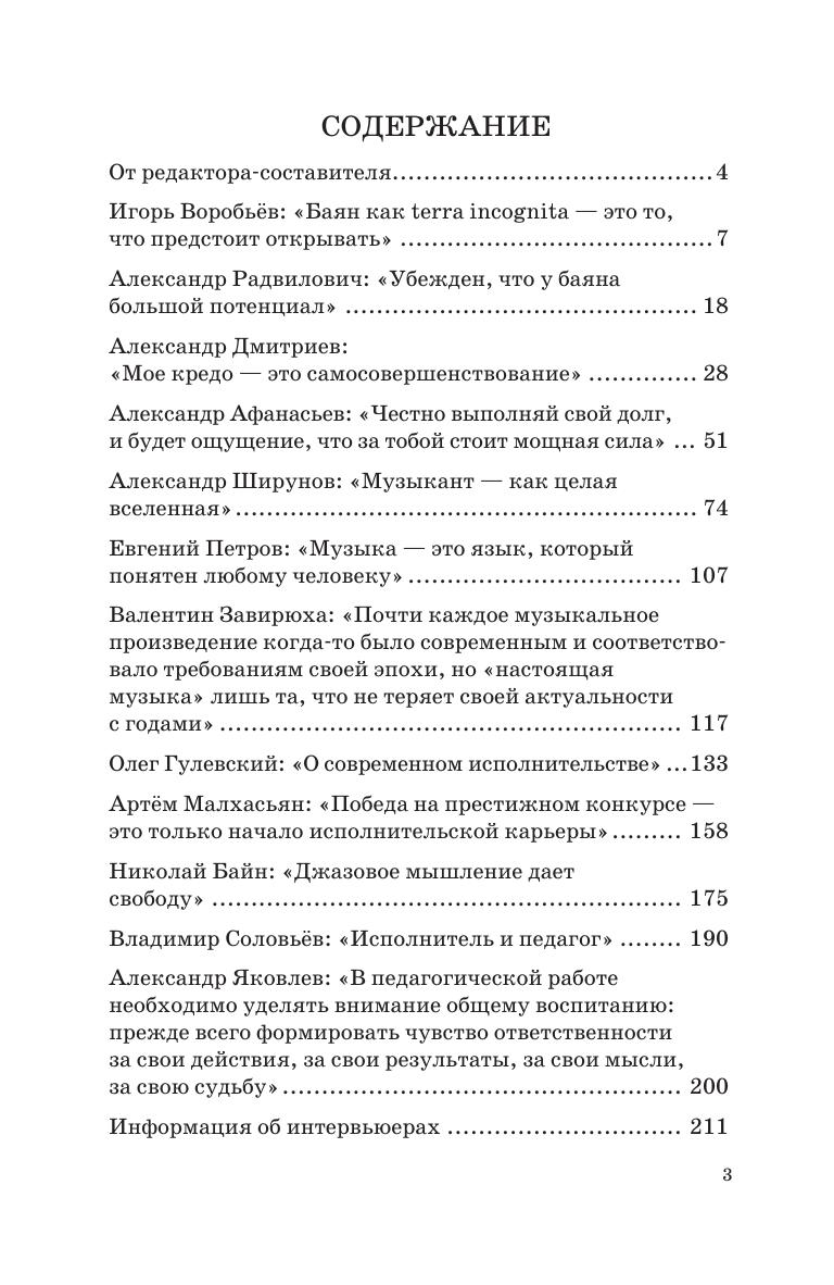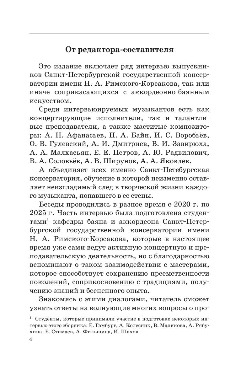 Издание представляет собой сборник интервью с выпускниками Санкт-Петербургской государственной консерватории имени Н. А. Римского-Корсакова разных поколений, имеющих отношение к аккордеонно-баянному искусству. Среди них есть концертирующие исполнители, талантливые преподаватели, а также маститые композиторы. В диалогах обсуждается широкий круг тем, затрагивают вопросы методики обучения, репертуар, основные качества современных исполнителей и педагогов и т. п. Сборник адресован студентам, педагогам музыкальных учебных заведений, а также широкому кругу читателей, интересующихся проблемами аккордеонно-баянного искусства. The edition presents the collection of interviews with graduates of the St. Petersburg State Conservatory of different generations, related to bayan and accordion art. Among them are performing musicians, gifted teachers, as well as renowned composers. The interviewer and interviewees discuss in their dialogues a wide range of topics, including the issues of teaching methods, repertoire, the main qualities of contemporary performers and educators, etc. The book is addressed to students, teachers of musical educational institutions, as well as to a wide range of readers interested in issues of accordion and bayan art.