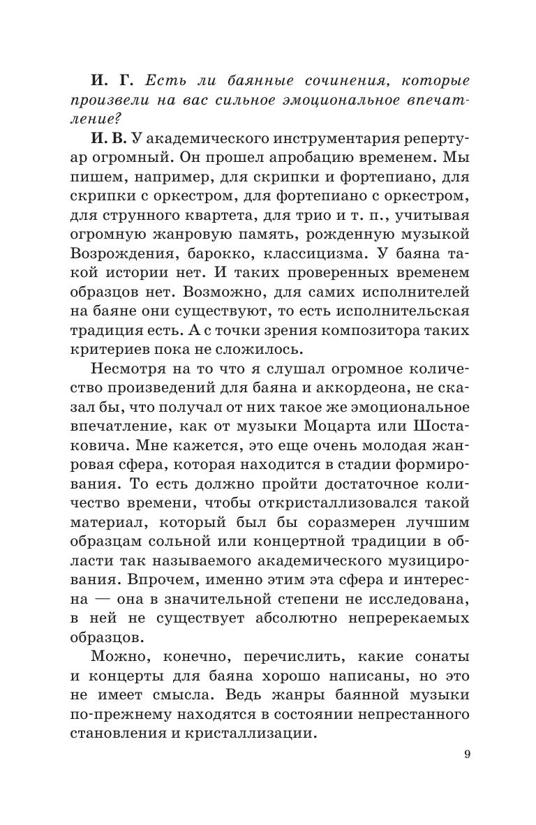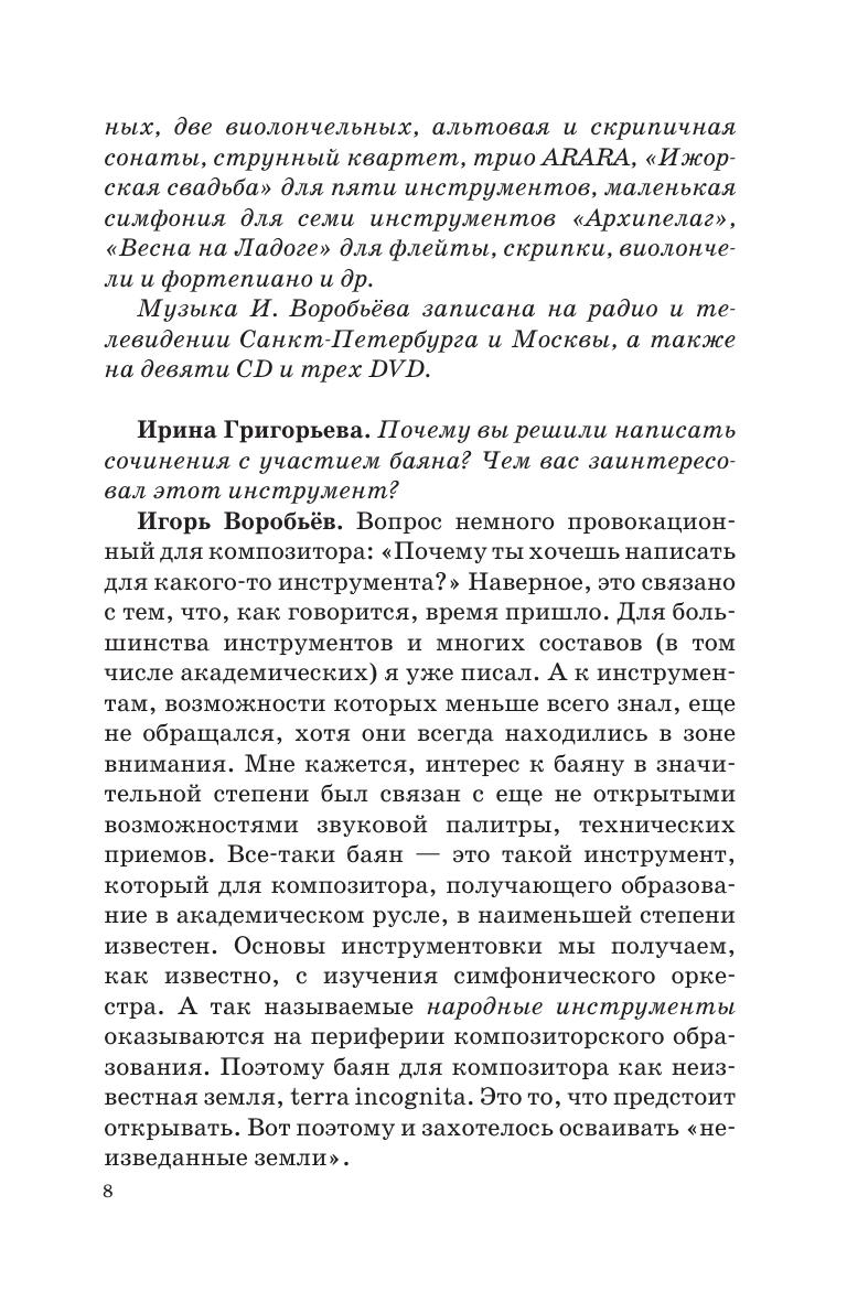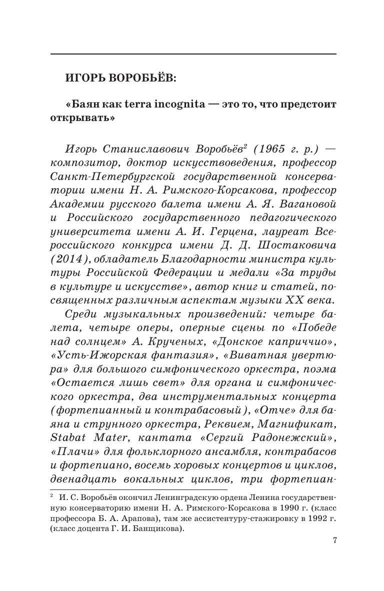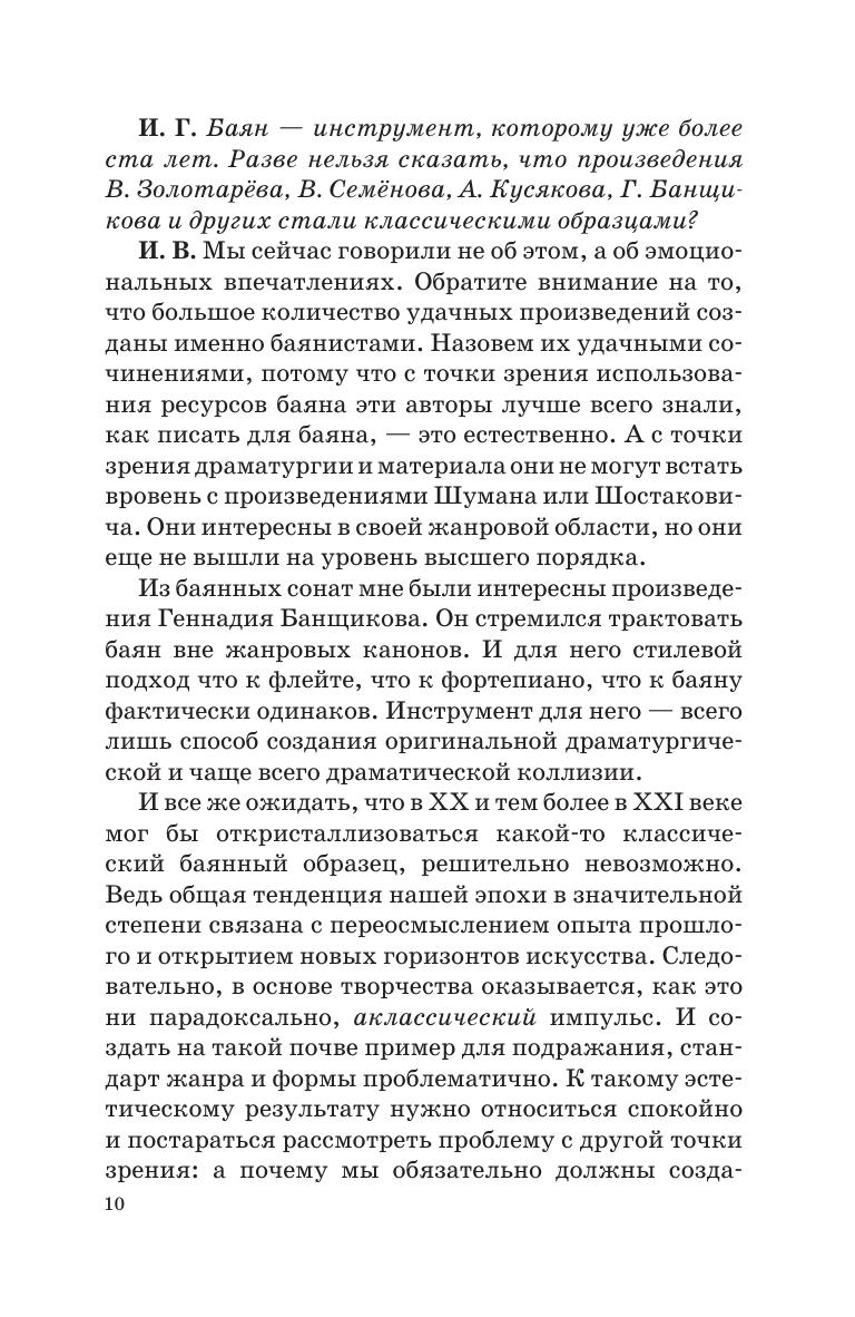 Издание представляет собой сборник интервью с выпускниками Санкт-Петербургской государственной консерватории имени Н. А. Римского-Корсакова разных поколений, имеющих отношение к аккордеонно-баянному искусству. Среди них есть концертирующие исполнители, талантливые преподаватели, а также маститые композиторы. В диалогах обсуждается широкий круг тем, затрагивают вопросы методики обучения, репертуар, основные качества современных исполнителей и педагогов и т. п. Сборник адресован студентам, педагогам музыкальных учебных заведений, а также широкому кругу читателей, интересующихся проблемами аккордеонно-баянного искусства. The edition presents the collection of interviews with graduates of the St. Petersburg State Conservatory of different generations, related to bayan and accordion art. Among them are performing musicians, gifted teachers, as well as renowned composers. The interviewer and interviewees discuss in their dialogues a wide range of topics, including the issues of teaching methods, repertoire, the main qualities of contemporary performers and educators, etc. The book is addressed to students, teachers of musical educational institutions, as well as to a wide range of readers interested in issues of accordion and bayan art.