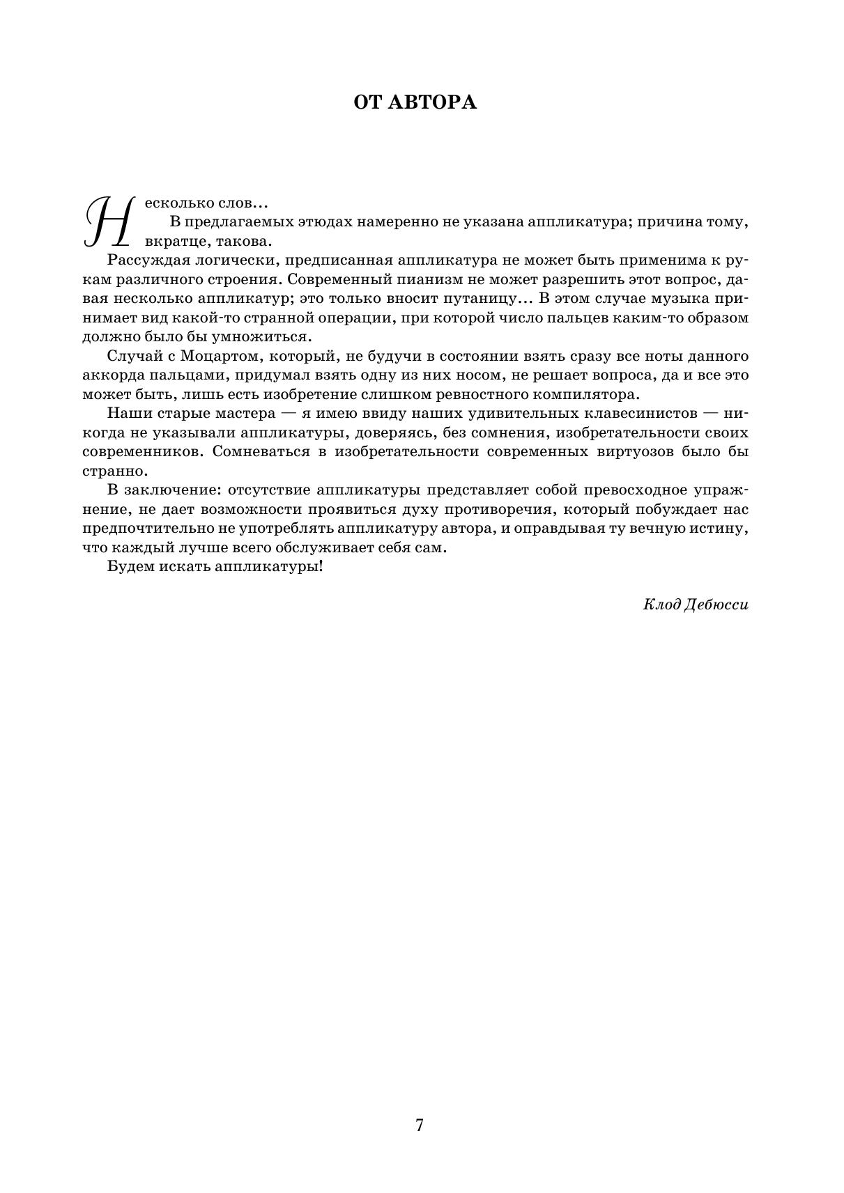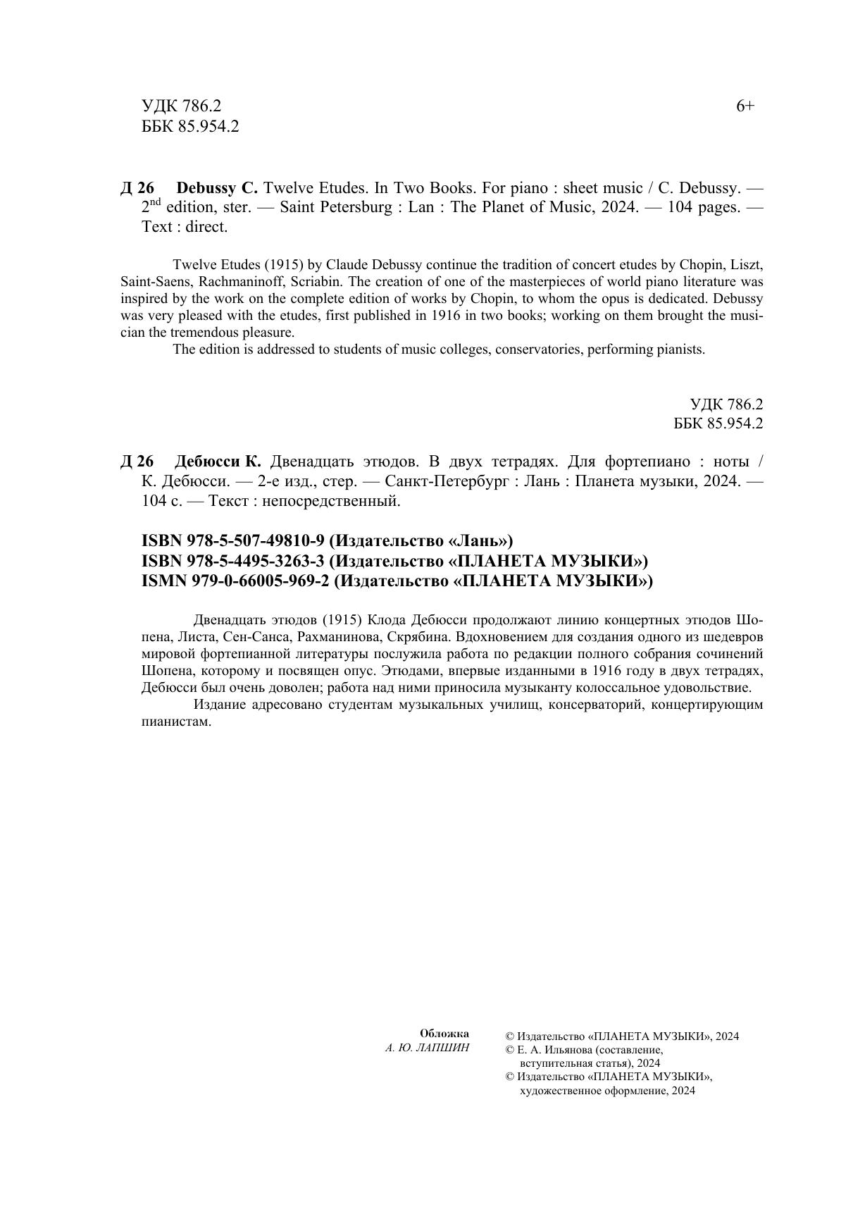 Двенадцать этюдов (1915) Клода Дебюсси продолжают линию концертных этюдов Шопена, Листа, Сен-Санса, Рахманинова, Скрябина. Вдохновением для создания одного из шедевров мировой фортепианной литературы послужила работа по редакции полного собрания сочинений Шопена, которому и посвящен опус. Этюдами, впервые изданными в 1916 году в двух тетрадях, Дебюсси был очень доволен, работа над ними приносила музыканту колоссальное удовольствие. Издание адресовано студентам музыкальных училищ, консерваторий, концертирующим пианистам. Twelve Etudes (1915) by Claude Debussy continue the tradition of concert etudes by Chopin, Liszt, Saint-Saens, Rachmaninoff, Scriabin. The creation of one of the masterpieces of world piano literature was inspired by the work on the complete edition of works by Chopin, to whom the opus is dedicated. Debussy was very pleased with the etudes, first published in 1916 in two books, working on them brought the musician the tremendous pleasure. The edition is addressed to students of music colleges, conservatories, performing pianists.