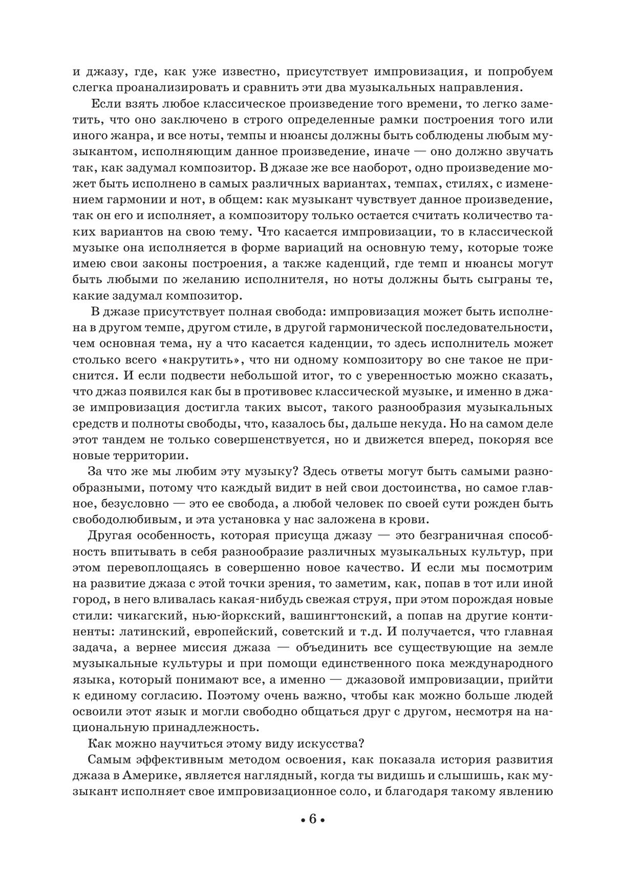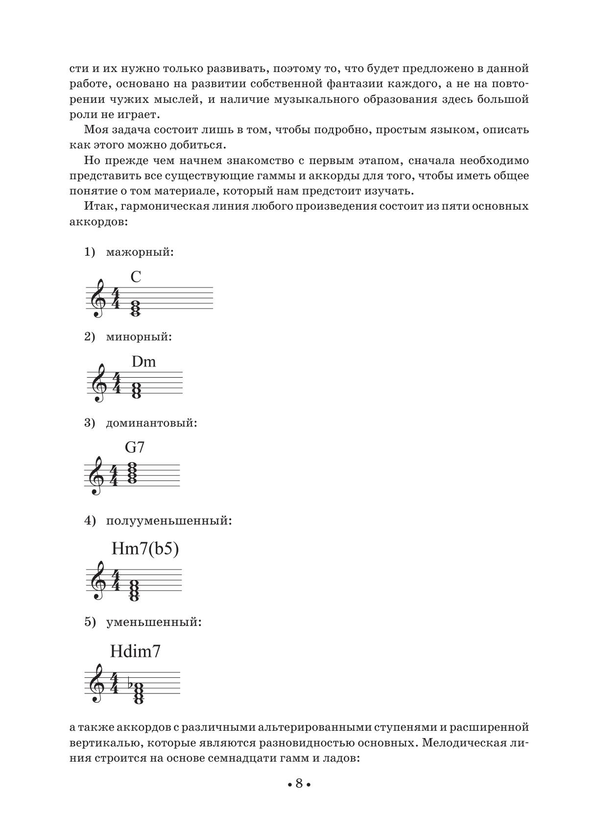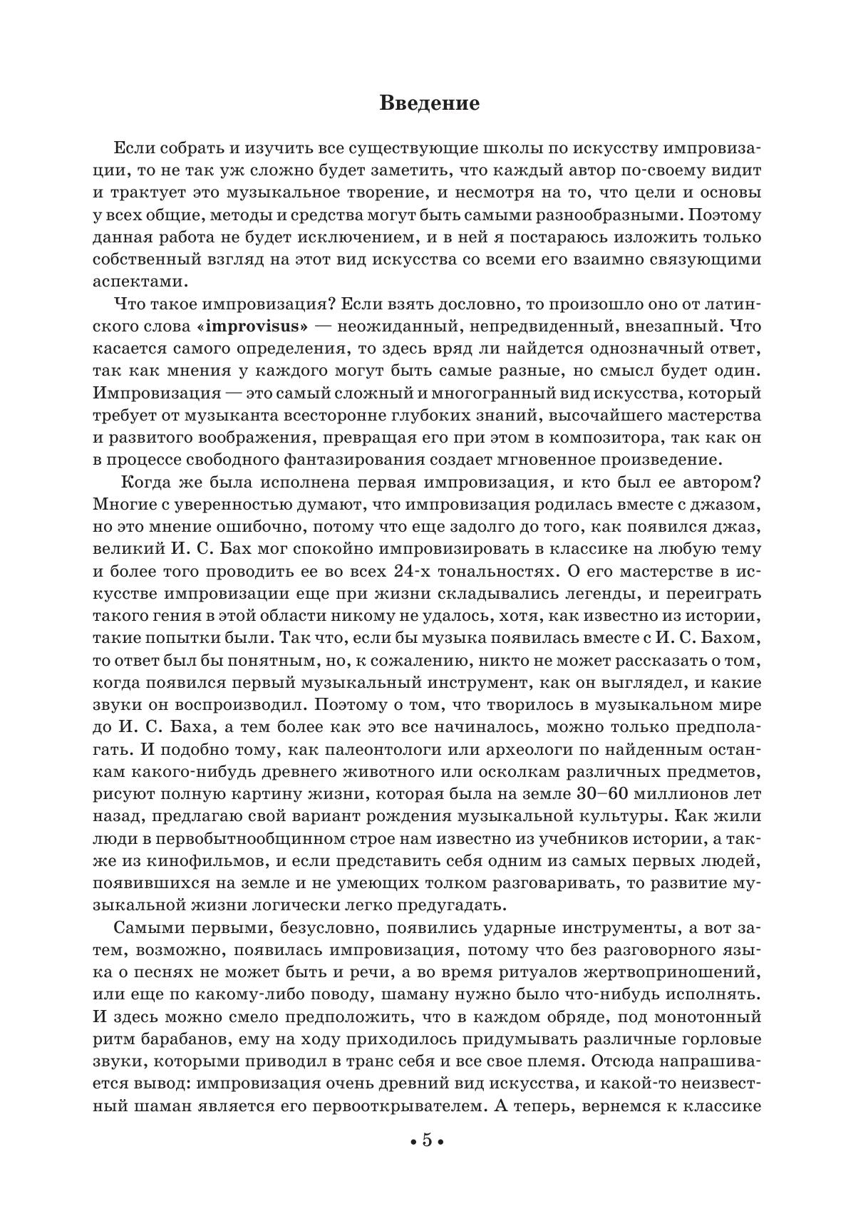 Импровизация — это совершенно отдельный вид исполнительского искусства, который можно применять во всех существующих музыкальных стилях. Автор пособия предоставляет свою уникальную методику — опыт 20-летней педагогической деятельности, описывая один из самых легких способов в освоении импровизации, который может быть доступен абсолютно всем. Учебное пособие рассчитано на широкий круг музыкантов: и начинающих, и уже играющих. Improvisation is a special type of performing art which can be used in all existing music styles. The author of the manual provides his unique methods, resulting from the experience of 20 years of teaching, describing one of the easiest ways to master improvisation, which can be practised by anyone. The textbook is intended for a wide range of musicians: both beginners and performers.