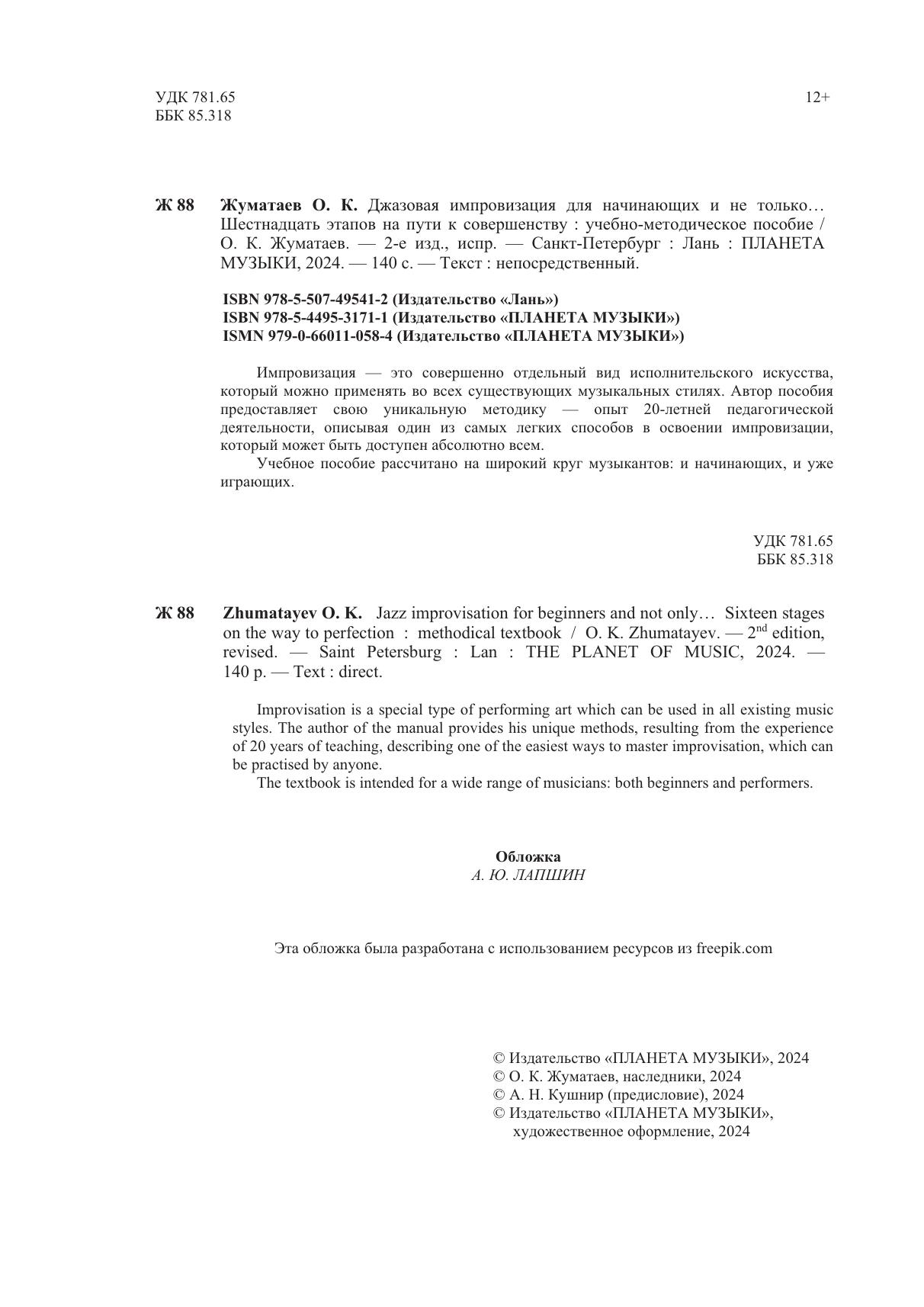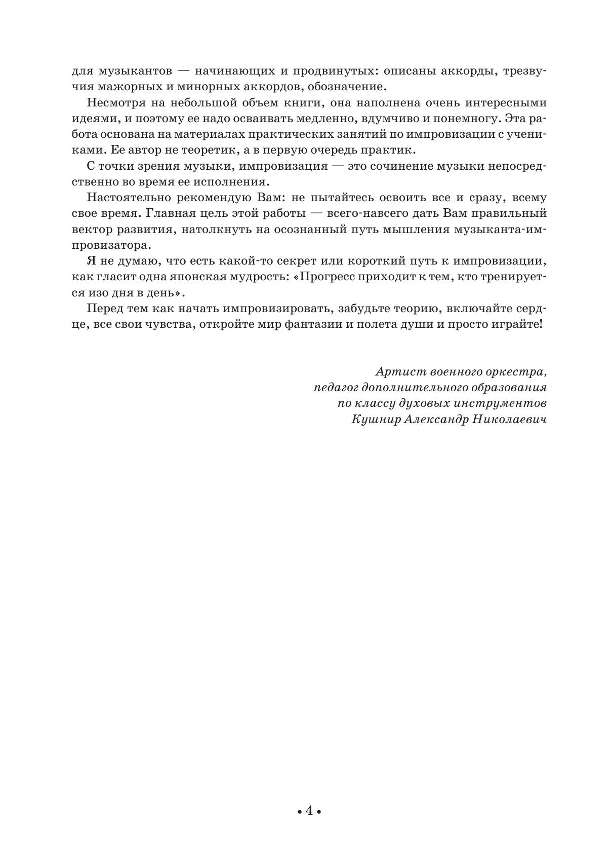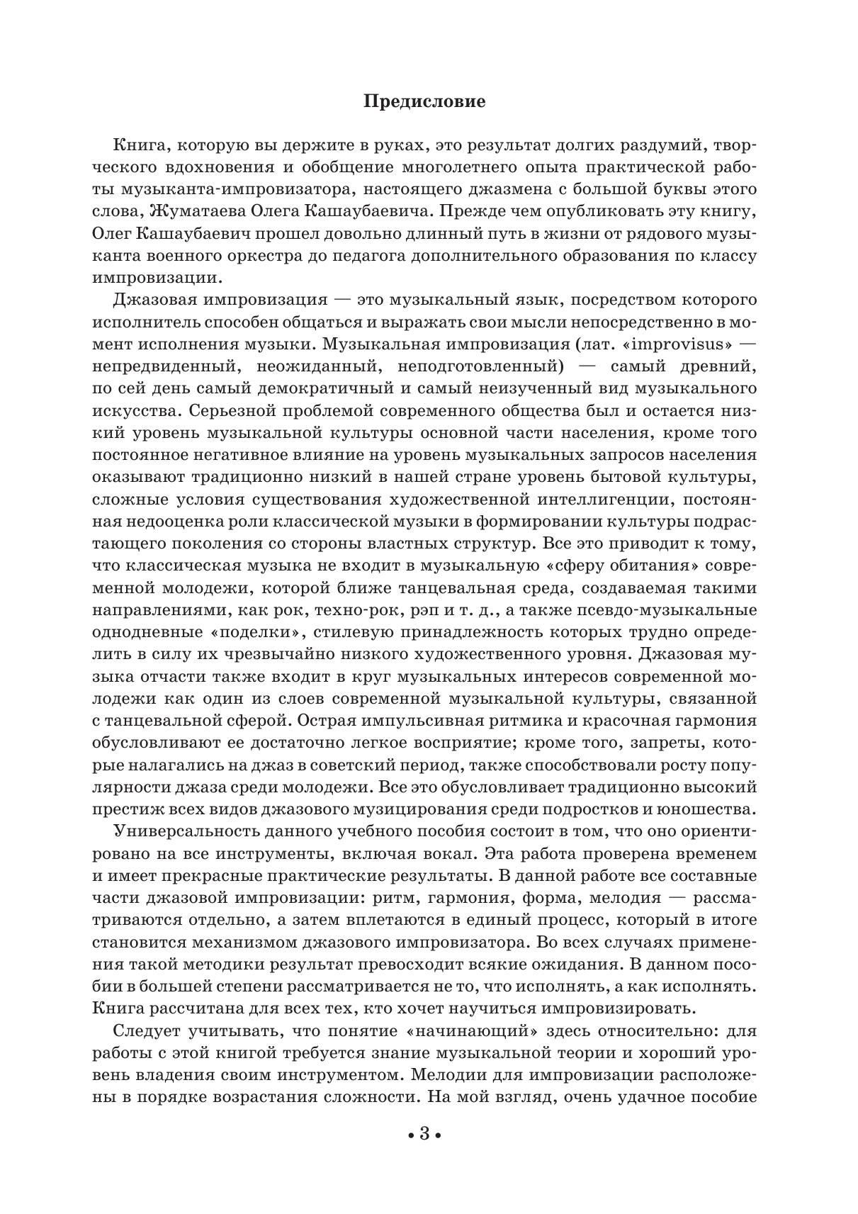 Импровизация — это совершенно отдельный вид исполнительского искусства, который можно применять во всех существующих музыкальных стилях. Автор пособия предоставляет свою уникальную методику — опыт 20-летней педагогической деятельности, описывая один из самых легких способов в освоении импровизации, который может быть доступен абсолютно всем. Учебное пособие рассчитано на широкий круг музыкантов: и начинающих, и уже играющих. Improvisation is a special type of performing art which can be used in all existing music styles. The author of the manual provides his unique methods, resulting from the experience of 20 years of teaching, describing one of the easiest ways to master improvisation, which can be practised by anyone. The textbook is intended for a wide range of musicians: both beginners and performers.
