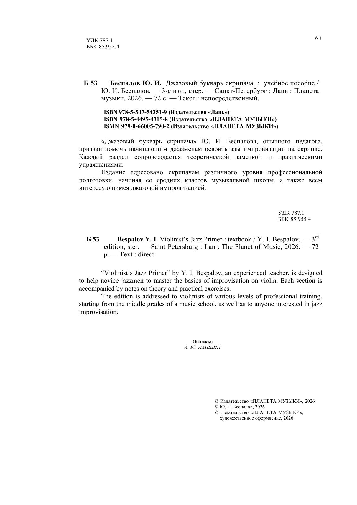 «Джазовый букварь скрипача» Ю. И. Беспалова, опытного педагога, призван помочь начинающим джазменам освоить азы импровизации на скрипке. Каждый раздел сопровождается теоретической заметкой и практическими упражнениями. Издание адресовано скрипачам различного уровня профессиональной подготовки, начиная со средних классов музыкальной школы, а также всем интересующимся джазовой импровизацией.