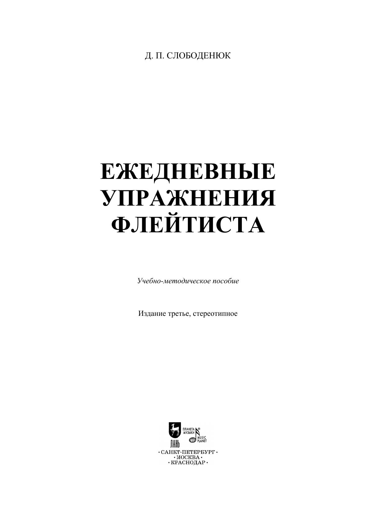 В процессе обучения и совершенствования исполнительского мастерства важную роль играют ежедневные упражнения. В данном сборнике затрагиваются основные моменты развития исполнительской техники. Все главы и многие упражнения содержат простые практические советы и пожелания, помогающие избежать ошибок. Этот сборник упражнений хорошо подойдет для учащихся старших классов ДМШ и студентов музыкальных колледжей. Цель создания данного учебного пособия — наметить пути правильной организации самостоятельных занятий по специальности. Daily exercises are important for training routine and improving performance skills. This collection deals with the main points of the training of the performing technique. All chapters and many exercises contain simple practical tips and suggestions to help you avoid mistakes. This collection of exercises is well suited for senior grades students of music schools and students of music colleges. This textbook is aimed to outline the ways of the right organization of a flutist’s self-study.
