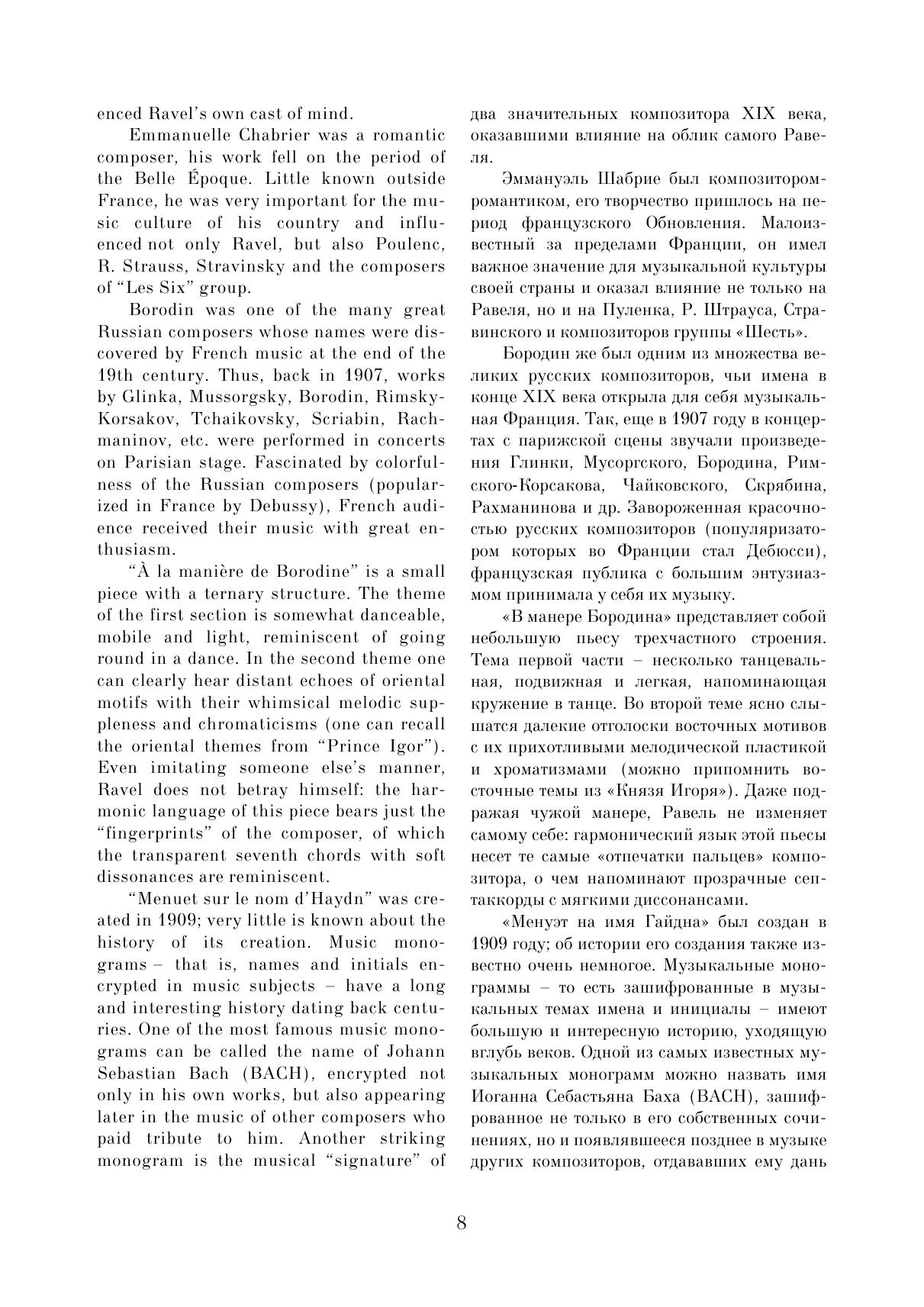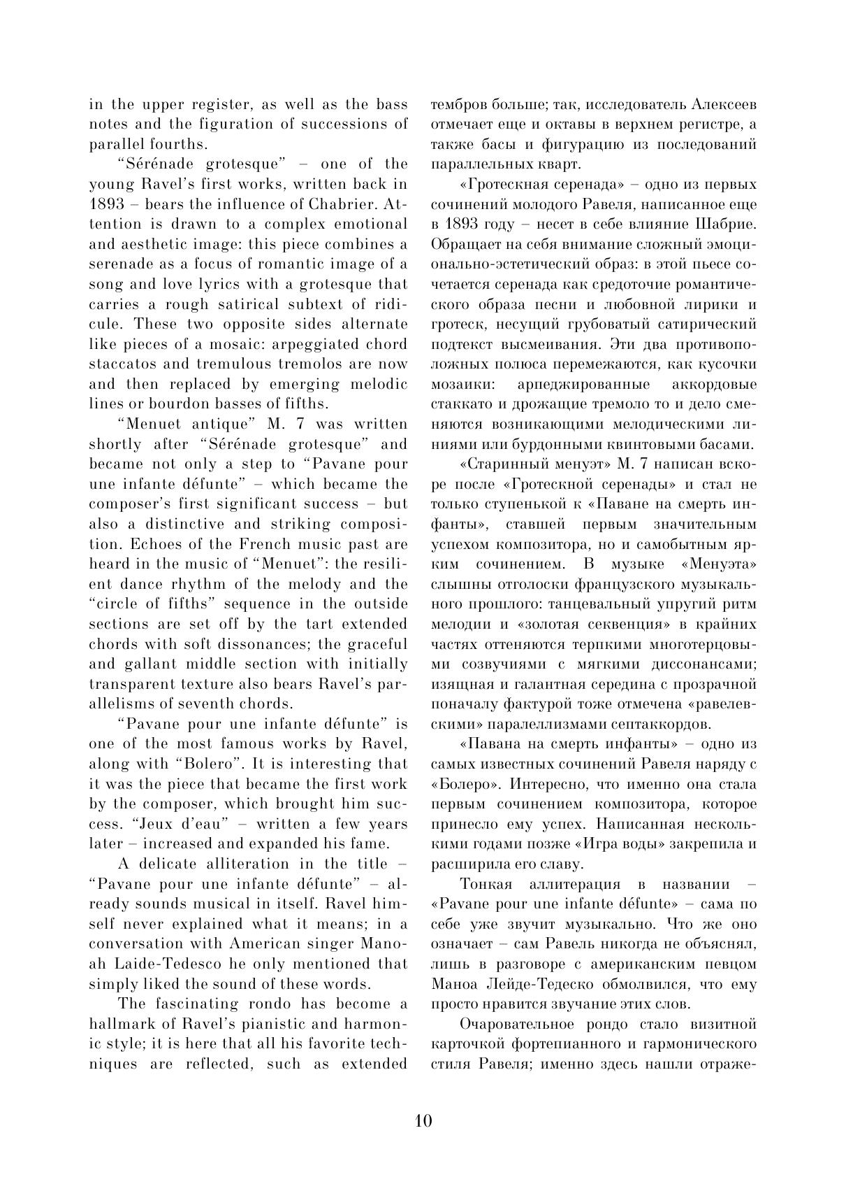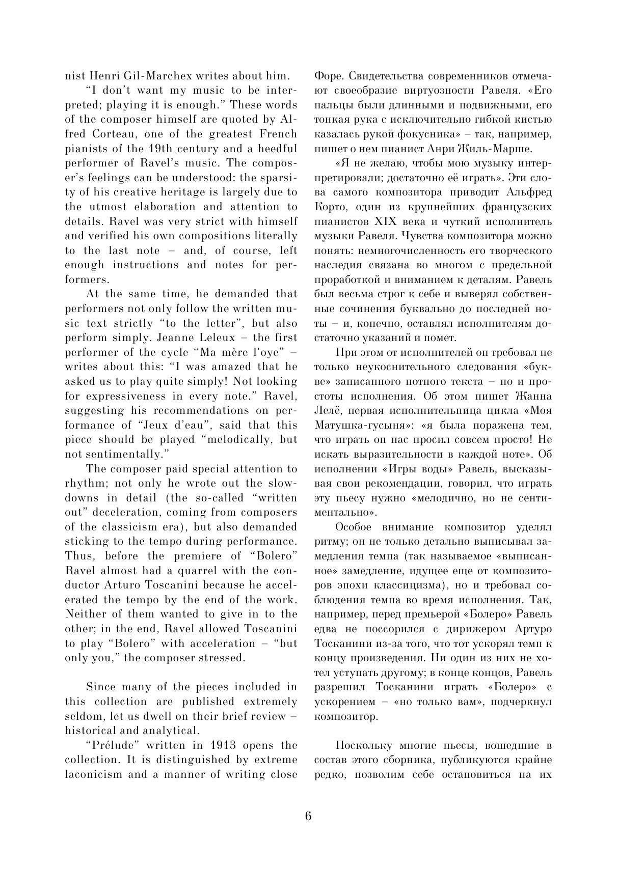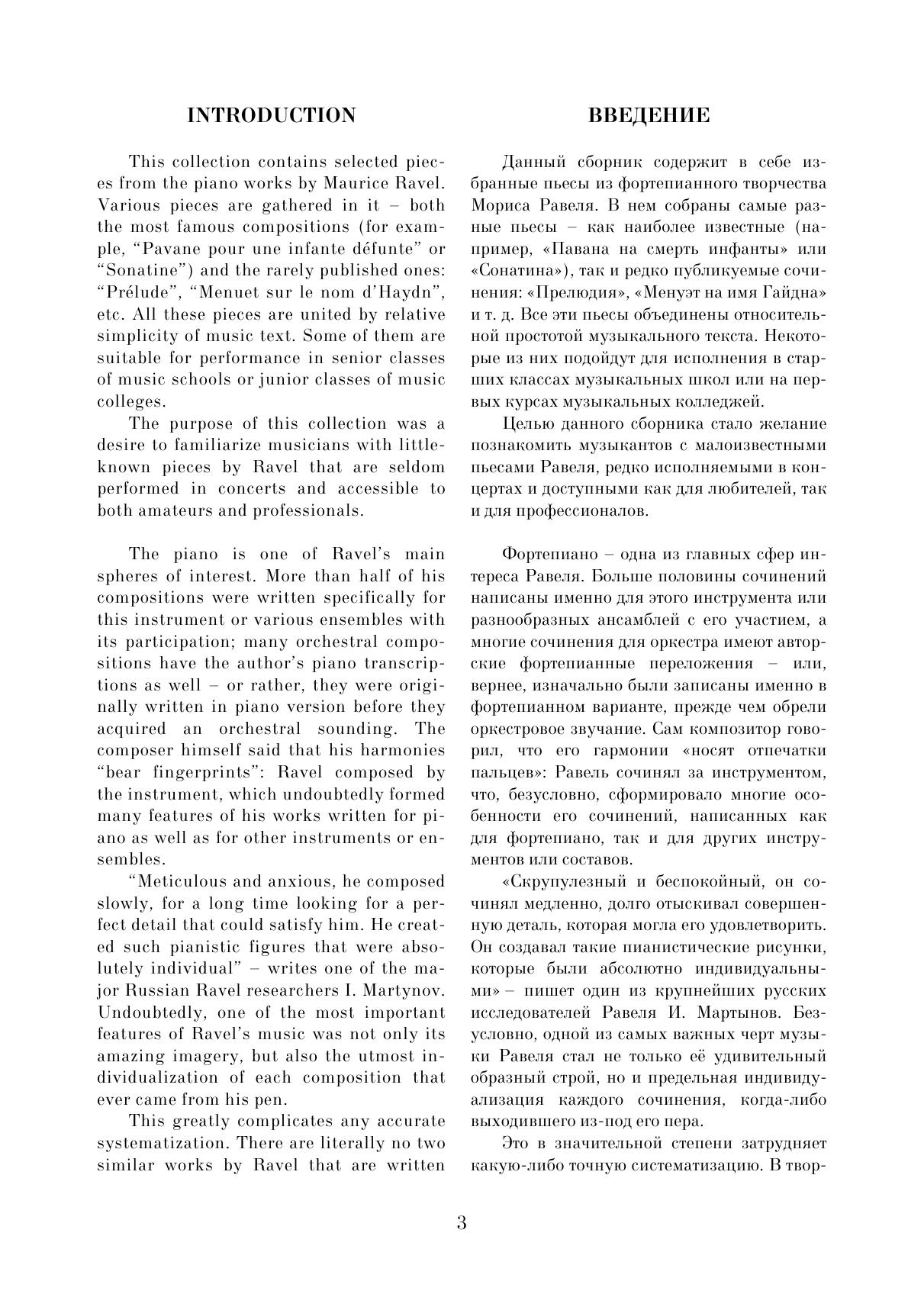 Данный сборник содержит избранные пьесы из фортепианного творчества Мориса Равеля. Целью сборника стало желание познакомить музыкантов с малоизвестными пьесами Равеля, редко исполняемыми в концертах и доступными как для любителей, так и для профессионалов. В нём собраны самые разные произведения — как наиболее известные (например, «Павана на смерть инфанты» или «Сонатина»), так и редко публикуемые — «Прелюдия», «Менуэт на имя Гайдна» и т. д. Все эти пьесы объединены относительной простотой музыкального текста и могут подойти для исполнения в старших классах музыкальных школ или на первых курсах музыкальных колледжей. This collection contains selected pieces from piano work of Maurice Ravel. The collection is intended to familiarize musicians with Ravel's little-known pieces, seldom performed in concerts and aссessible to both amateurs and professionals. It contains a variety of works – both the most famous (for example, “Pavane for a Dead Princess” or “Sonatine”), and rarely published, like "Prelude", "Minuet on the name of Haydn", etc. All these pieces are characterized by the relative simplicity of the musical text, and can be suitable for performance by senior grades’ pupils at music schools or by students of first years at music colleges.