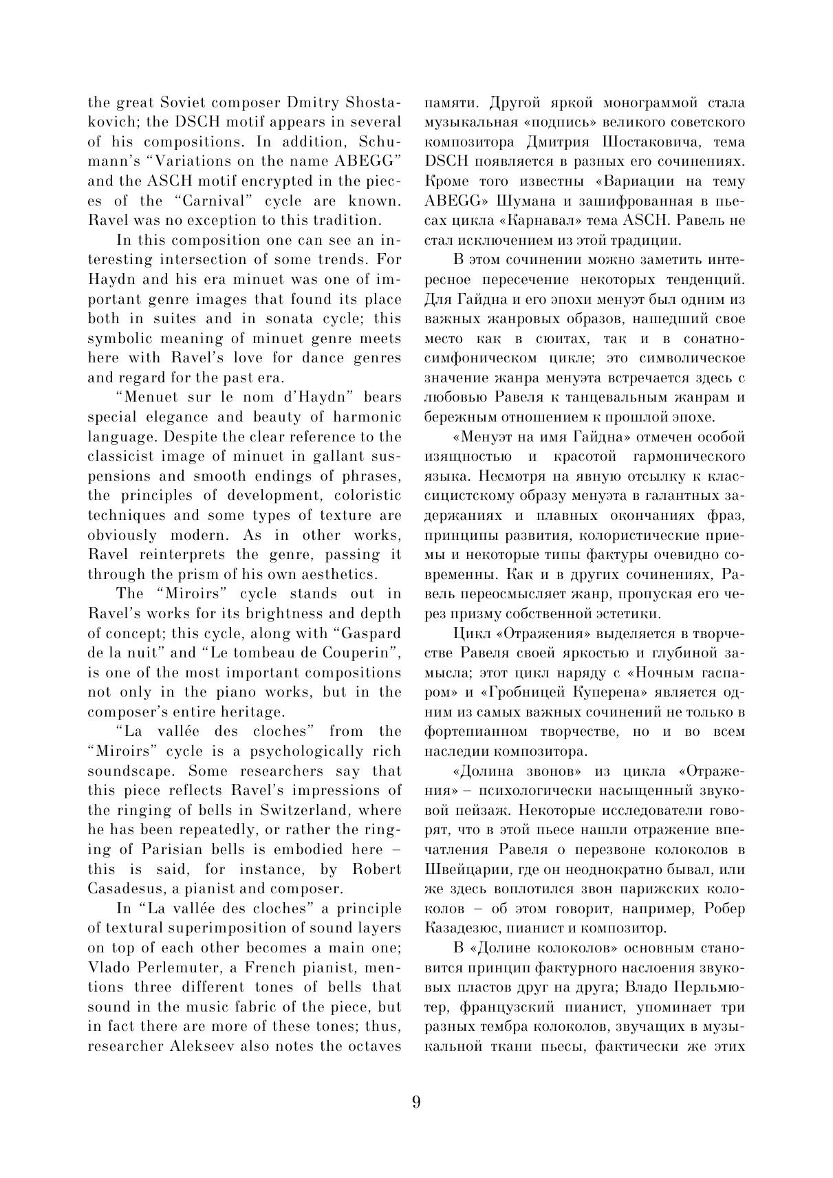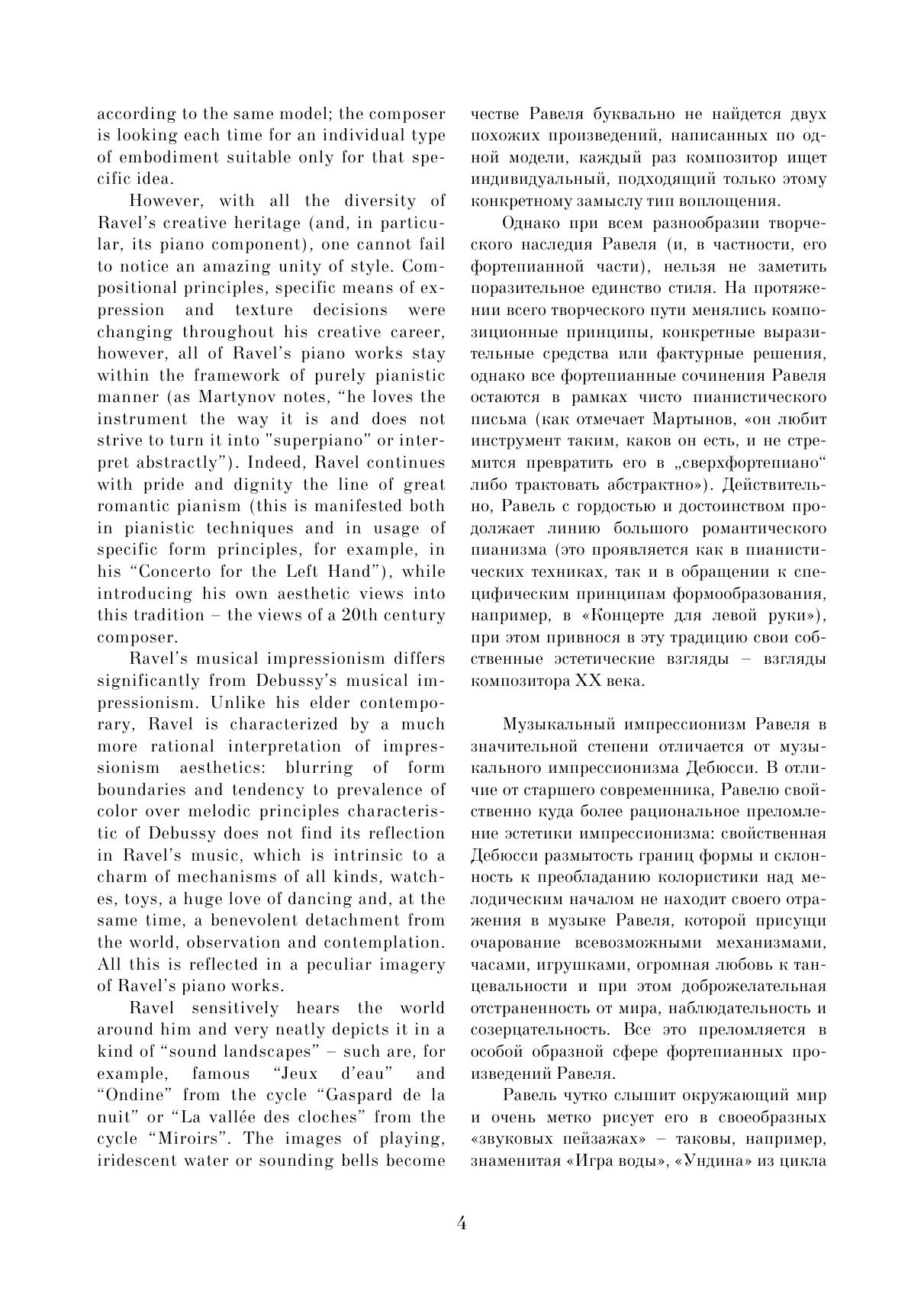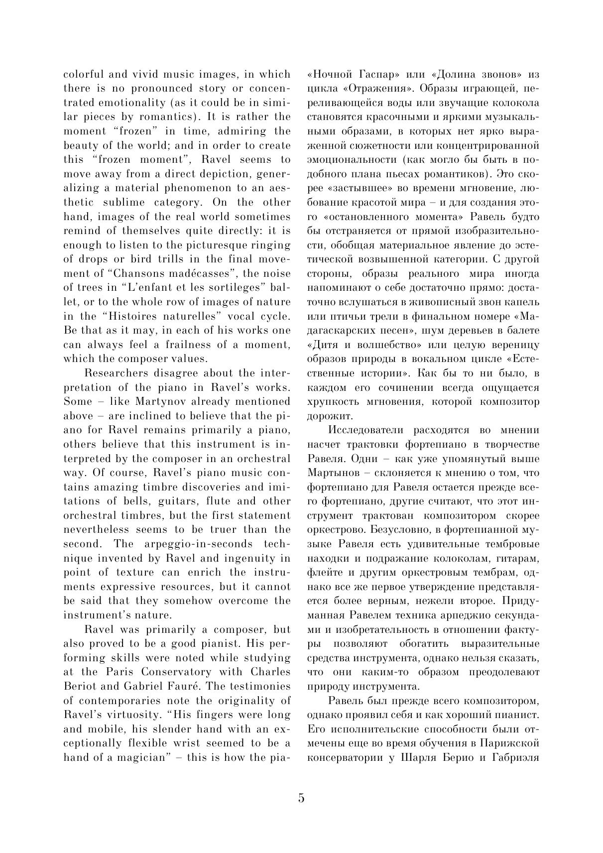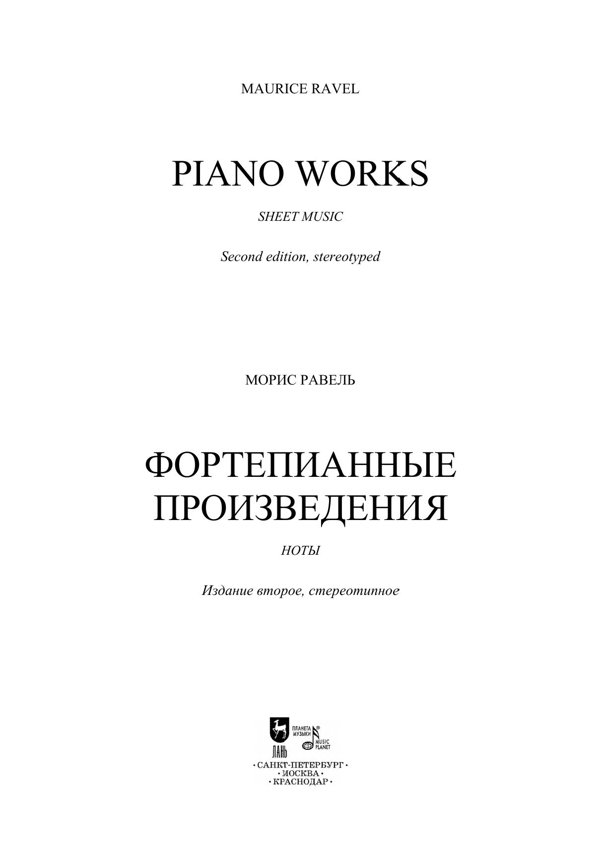 Данный сборник содержит избранные пьесы из фортепианного творчества Мориса Равеля. Целью сборника стало желание познакомить музыкантов с малоизвестными пьесами Равеля, редко исполняемыми в концертах и доступными как для любителей, так и для профессионалов. В нём собраны самые разные произведения — как наиболее известные (например, «Павана на смерть инфанты» или «Сонатина»), так и редко публикуемые — «Прелюдия», «Менуэт на имя Гайдна» и т. д. Все эти пьесы объединены относительной простотой музыкального текста и могут подойти для исполнения в старших классах музыкальных школ или на первых курсах музыкальных колледжей. This collection contains selected pieces from piano work of Maurice Ravel. The collection is intended to familiarize musicians with Ravel's little-known pieces, seldom performed in concerts and aссessible to both amateurs and professionals. It contains a variety of works – both the most famous (for example, “Pavane for a Dead Princess” or “Sonatine”), and rarely published, like "Prelude", "Minuet on the name of Haydn", etc. All these pieces are characterized by the relative simplicity of the musical text, and can be suitable for performance by senior grades’ pupils at music schools or by students of first years at music colleges.
