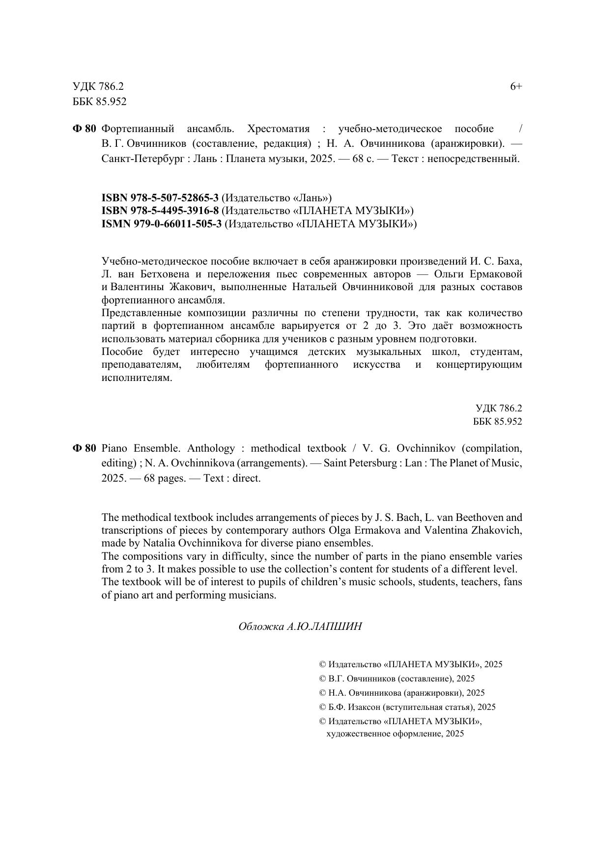 Учебно-методическое пособие включает в себя аранжировки произведений И. С. Баха, Л. ван Бетховена и переложения пьес современных авторов — Ольги Ермаковой и Валентины Жакович, выполненные Натальей Овчинниковой для разных составов фортепианного ансамбля. Представленные композиции различны по степени трудности, так как количество партий в фортепианном ансамбле варьируется от 2 до 3. Это даёт возможность использовать материал сборника для учеников с разным уровнем подготовки. Пособие будет интересно учащимся детских музыкальных школ, студентам, преподавателям, любителям фортепианного искусства и концертирующим исполнителям. The methodical textbook includes arrangements of pieces by J. S. Bach, L. van Beethoven and transcriptions of pieces by contemporary authors Olga Ermakova and Valentina Zhakovich, made by Natalia Ovchinnikova for diverse piano ensembles. The compositions vary in difficulty, since the number of parts in the piano ensemble varies from 2 to 3. It makes possible to use the collection’s content for students of a different level. The textbook will be of interest to pupils of children’s music schools, students, teachers, fans of piano art and performing musicians.