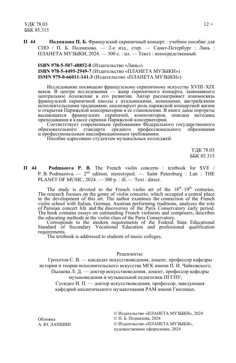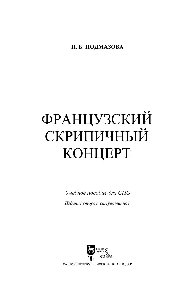 Исследование посвящено французскому скрипичному искусству XVIII–XIX веков. В центре исследования – жанр скрипичного концерта, занимавшего центральное положение в его развитии. Автор рассматривает взаимосвязь французской скрипичной школы с итальянской, немецкой, австрийской исполнительскими традициями, анализирует роль парижской концертной жизни и открытия Парижской консерватории в ее становлении. В книге даны портреты выдающихся французских скрипачей, композиторов, описана методика преподавания в классе скрипки Парижской консерватории. Соответствует современным требованиям Федерального государственного образовательного стандарта среднего профессионального образования и профессиональным квалификационным требованиям. Пособие адресовано преподавателям и студентам музыкальных колледжей. The study is devoted to the French violin art of the 18th–19th centuries. The research focuses on the genre of violin concerto, which occupied a central place in the development of this art. The author examines the connection of the French violin school with Italian, German, Austrian performing traditions, analyzes the role of Parisian concert life and the discoveries of the Paris Conservatory early period. The book contains essays on outstanding French violinists and composers, describes the educating methods at the violin class of the Paris Conservatory. Corresponds to the modern requirements of the Federal State Educational Standard of Secondary Vocational Education and professional qualification requirements. The textbook is addressed to students of music colleges.
