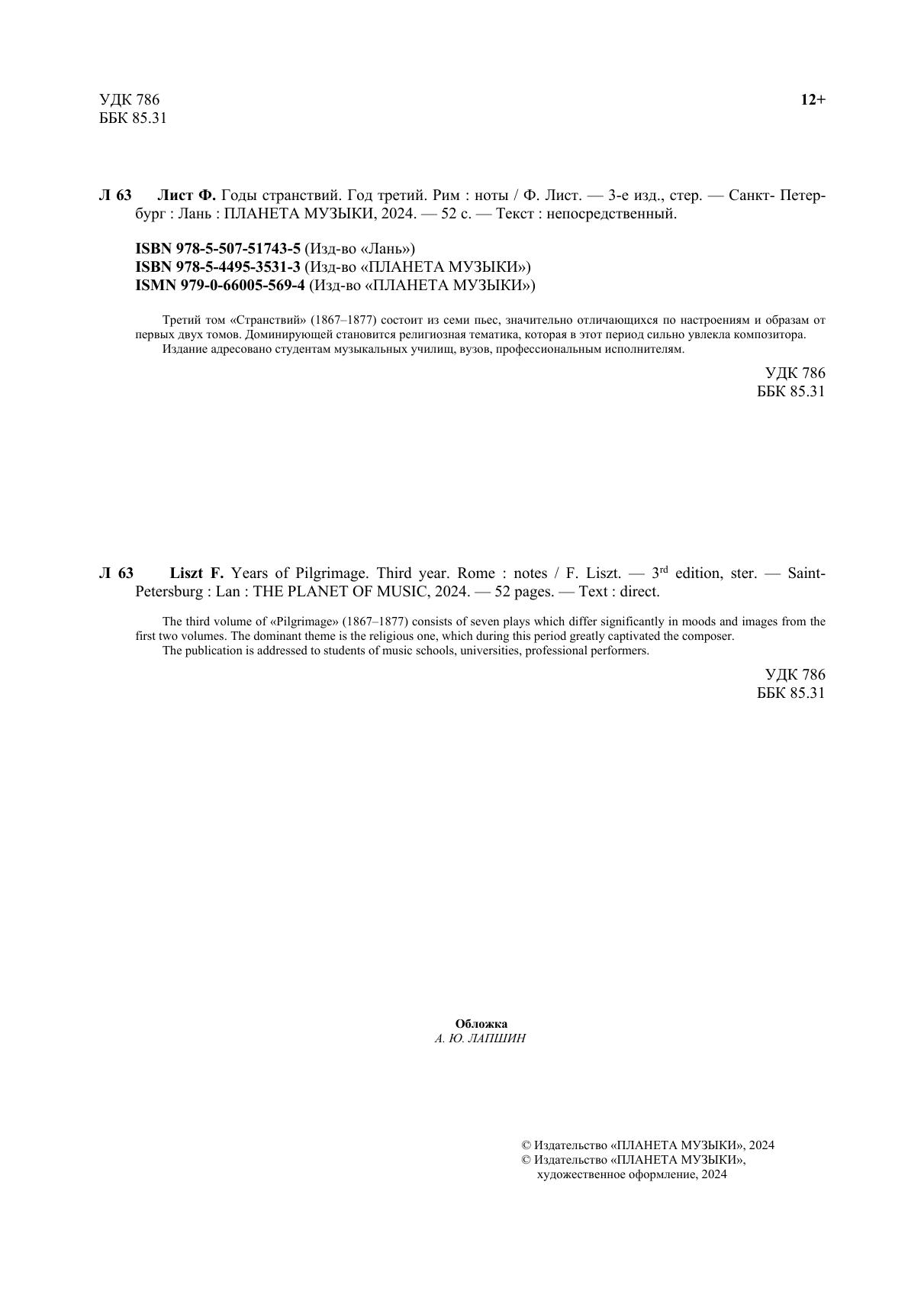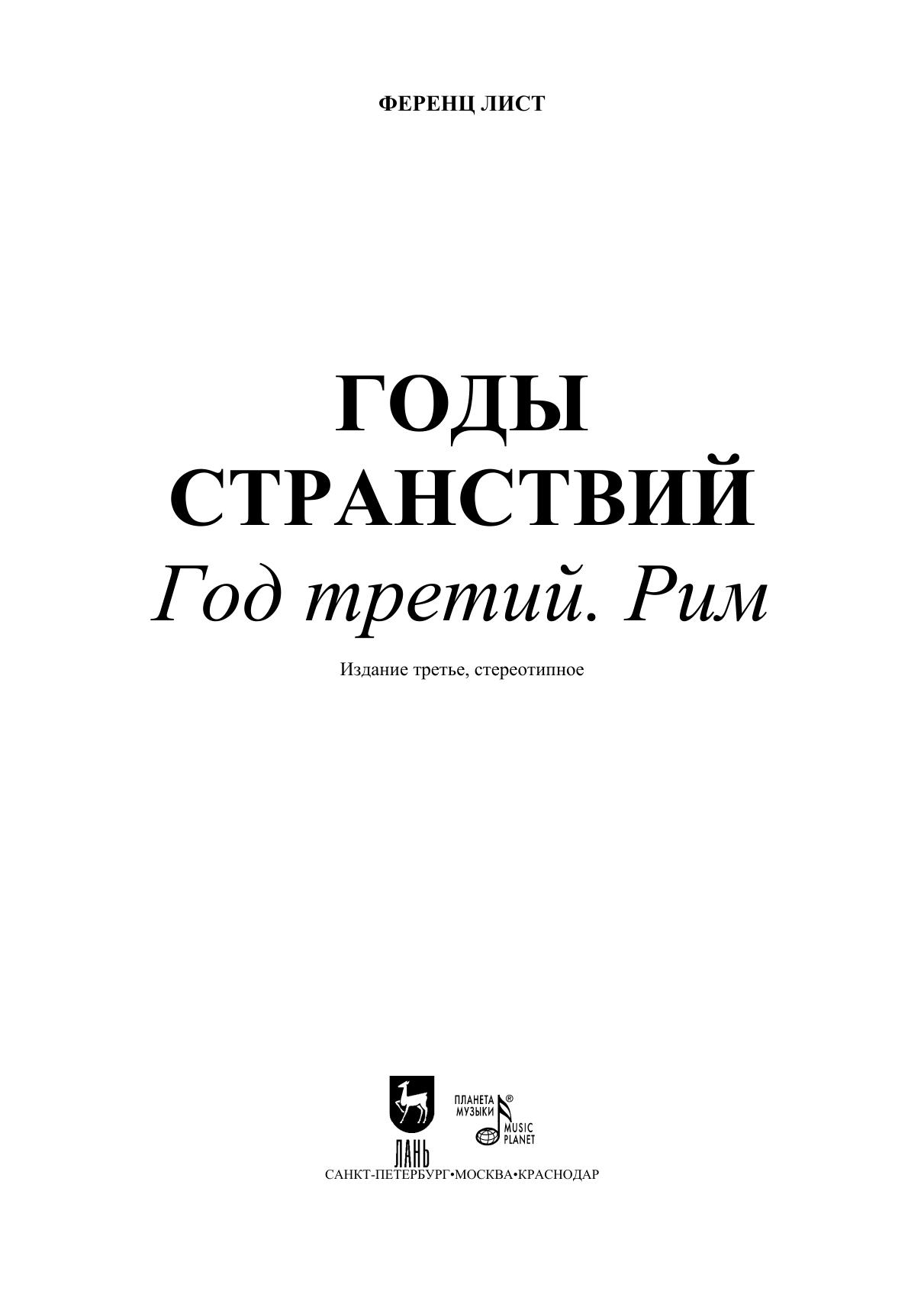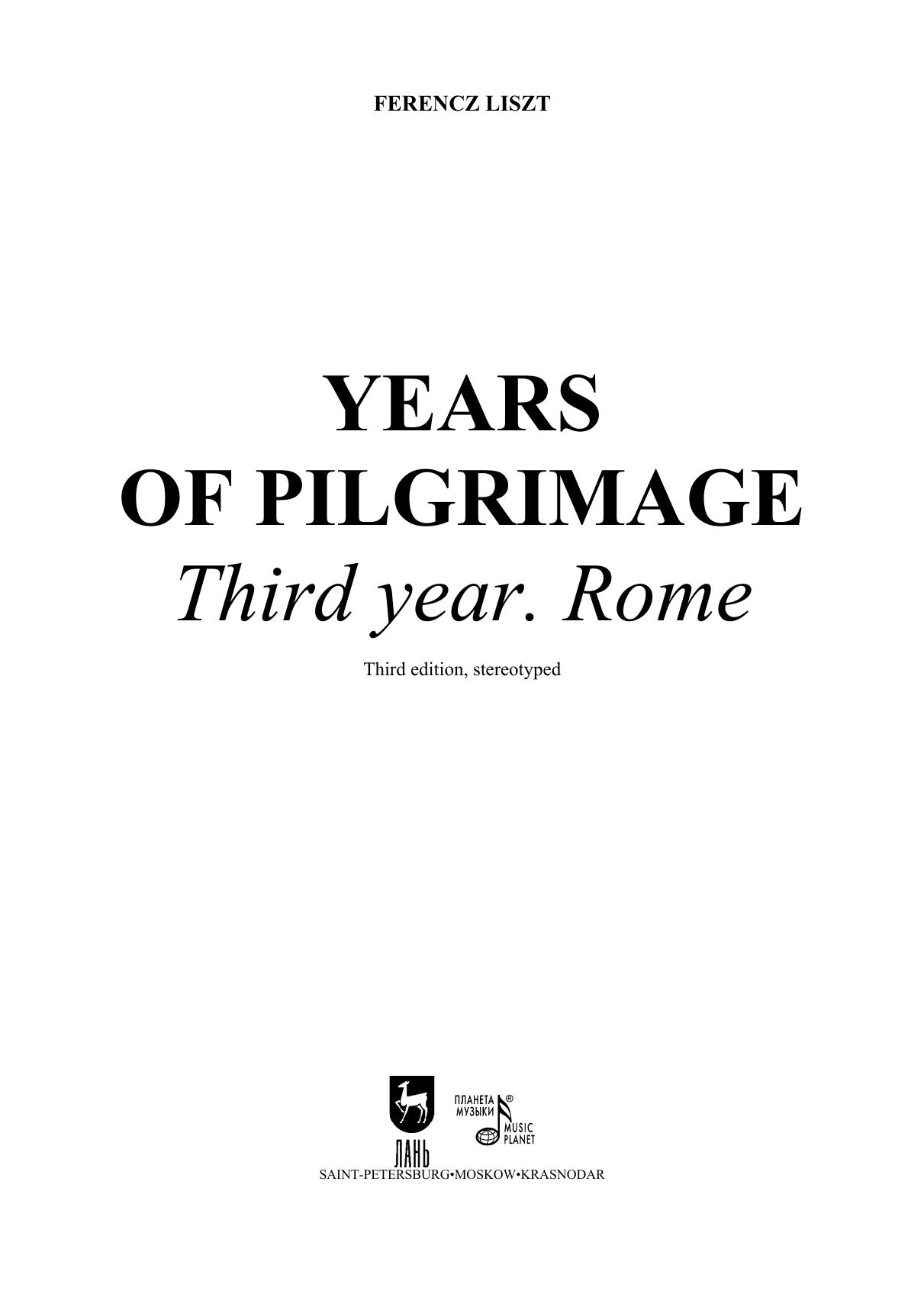 Третий том «Странствий» (1867–1877) состоит из семи пьес, значительно отличающихся по настроениям и образам от первых двух томов. Доминирующей становится религиозная тематика, которая в этот период сильно увлекла композитора. Издание адресовано студентам музыкальных училищ, вузов, профессиональным исполнителям.