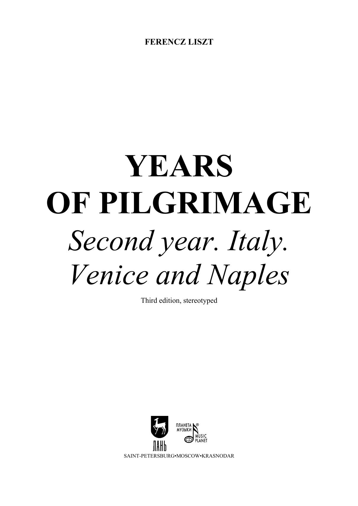 Второй том Странствий, 1838-1858 был создан Листом под впечатлением от произведений итальянского искусства — живописи, литературы, скульптуры. Толчком к его созданию стало путешествие Листа по Италии в 1837-1839 годах. Пьесы второго тома глубже по настроению и образам и технически сложнее пьес первого тома. Издание адресовано студентам музыкальных училищ, вузов, профессиональным исполнителям.