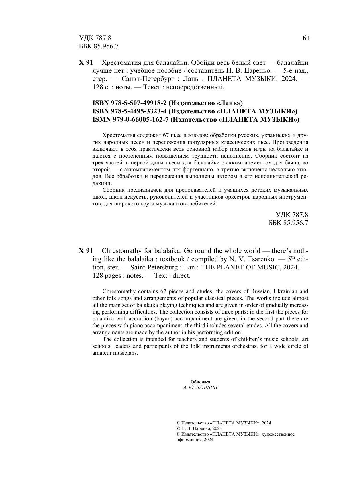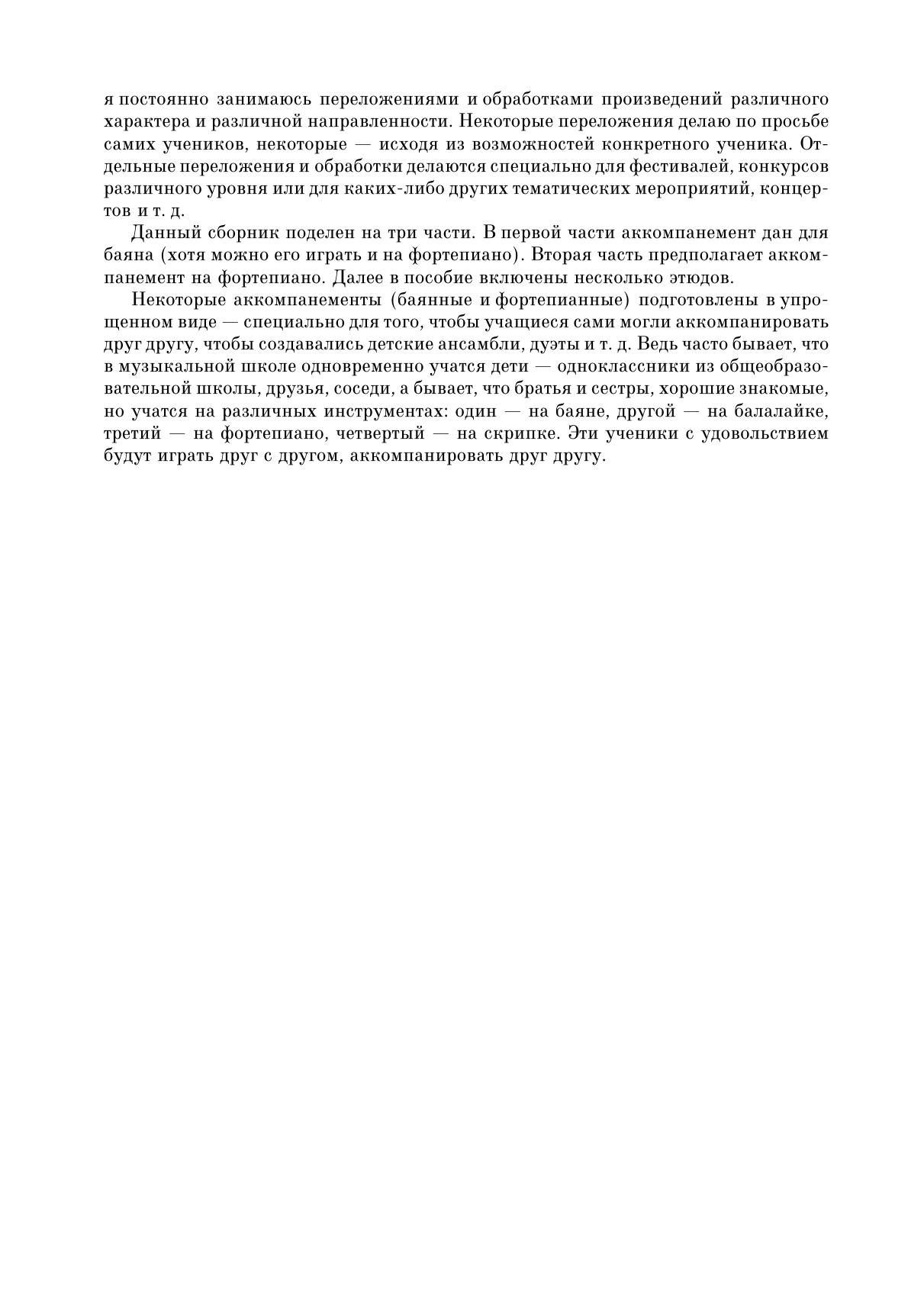 Хрестоматия содержит 65 пьес и этюдов: обработки русских, украинских и других народных песен и переложения популярных классических пьес. Произведения включают в себя практически весь основной набор приёмов игры на балалайки и даются с постепенным повышением трудностей в исполнении. Сборник состоит из трех частей: в первой даны пьесы для балалайки с аккомпанементом для баяна, во второй – с аккомпанементом для фортепиано, в третью включены несколько этюдов. Все обработки и переложения выполнены автором в его исполнительской редакции. Сборник предназначен для преподавателей и учащихся детских музыкальных школ, школ искусств, руководителей и участников оркестров народных инструментов, для широкого круга музыкантов-любителей. Chrestomathy contains 65 pieces and etudes: the covers of Russian, Ukrainian and other folk songs and arrangements of popular classical pieces. The works include almost all the main set of balalaika playing techniques and are given in order of gradually increasing performing difficulties. The collection consists of three parts: in the first the pieces for balalaika with accordion (bayan) accompaniment are given, in the second part are the pieces with piano accompaniment, the third includes several etudes. All the covers and arrangements are made by the author in his performing edition. The collection is intended for teachers and students of children’s music schools, art schools, leaders and participants of the folk instruments orchestras, for a wide variety of amateur musicians.