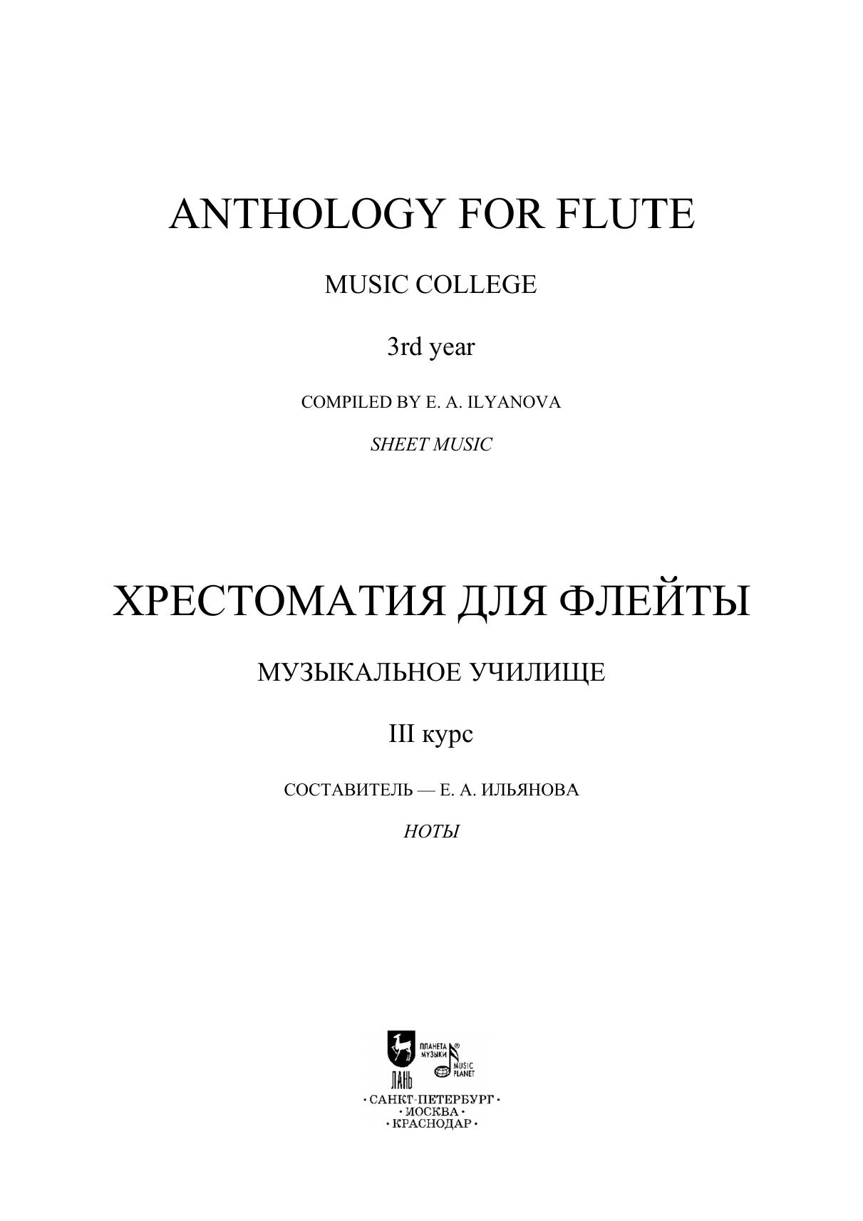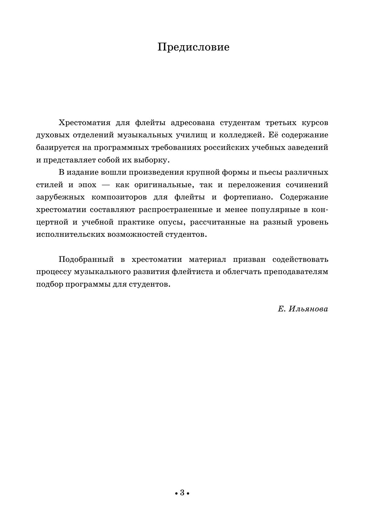 Хрестоматия для флейты составлена на основе программ российских музыкальных училищ и включает сочинения композиторов различных стилей и эпох. В сборник вошли произведения крупной формы и пьесы. Издание адресовано студентам третьих курсов и педагогам музыкальных училищ и колледжей. The anthology for flute is compiled basing on curriculums of music colleges in Russia and includes works by composers of different styles and times. The collection includes works of a sonata form and pieces. The edition is addressed to third-year students and teachers of music colleges.