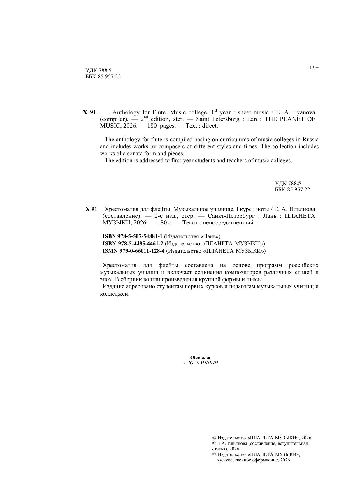 Хрестоматия для флейты составлена на основе программ российских музыкальных училищ и включает сочинения композиторов различных стилей и эпох. В сборник вошли произведения крупной формы и пьесы. Издание адресовано студентам первых курсов и педагогам музыкальных училищ и колледжей. The anthology for flute is compiled basing on curriculums of music colleges in Russia and includes works by composers of different styles and times. The edition is addressed to first-year students and teachers of music colleges.