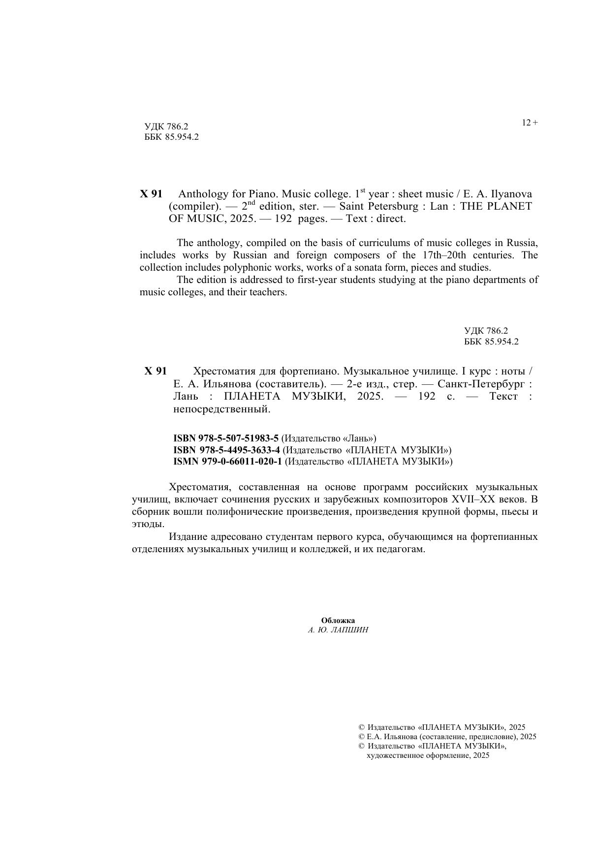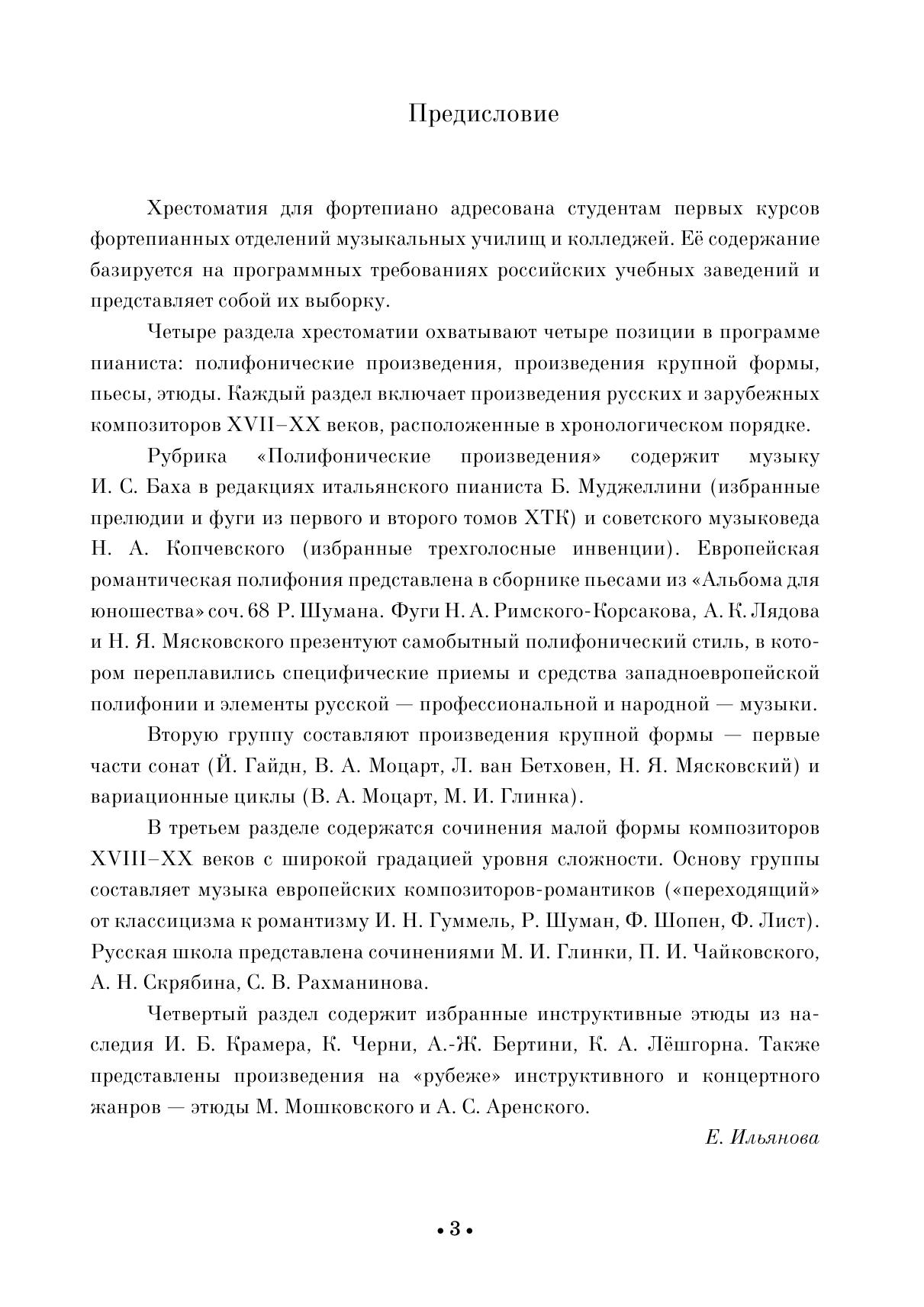 Хрестоматия, составленная на основе программ российских музыкальных училищ, включает сочинения русских и зарубежных композиторов XVII-XX веков. В сборник вошли полифонические произведения, произведения крупной формы, пьесы и этюды. Издание адресовано студентам первого курса, обучающимся на фортепианных отделениях музыкальных училищ и колледжей, и их педагогам. The anthology, compiled on the basis of curriculums of music colleges in Russia, includes works by Russian and foreign composers of the 17th–20th centuries. The collection includes polyphonic works, works of a sonata form, pieces and studies. The edition is addressed to first-year students studying at the piano departments of music colleges, and their teachers.