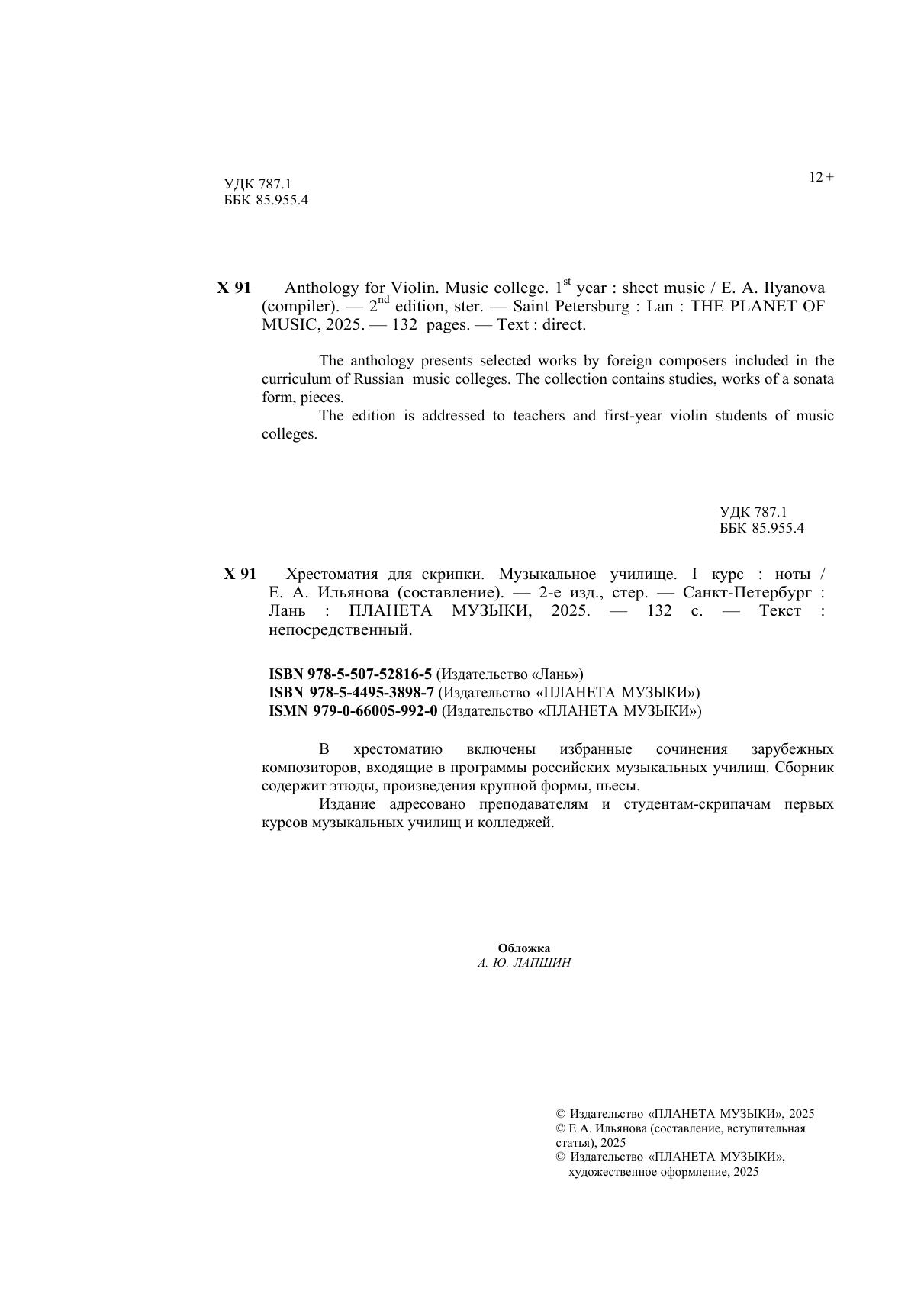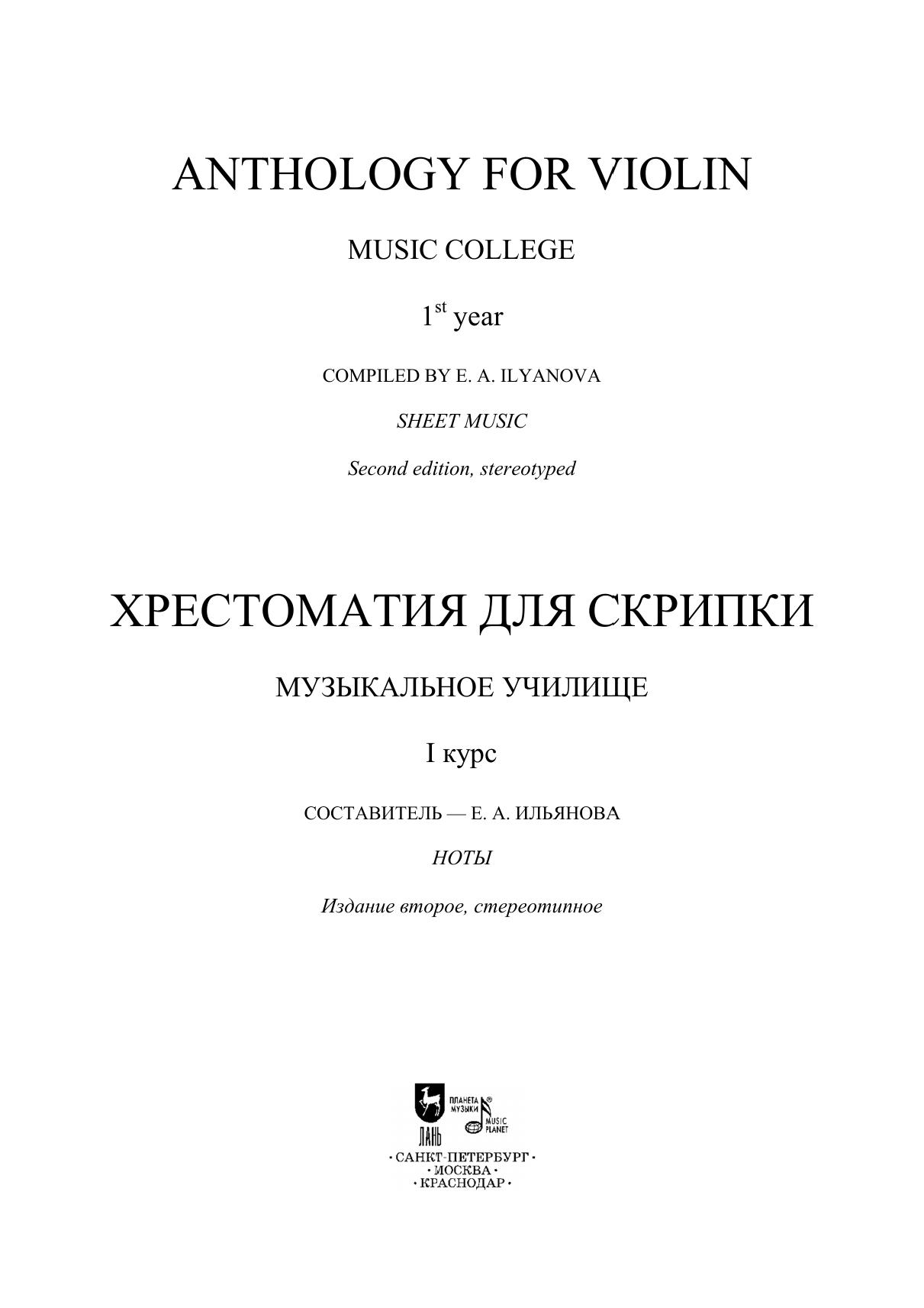 В хрестоматию включены избранные сочинения зарубежных композиторов, входящие в программы российских музыкальных училищ. Сборник содержит этюды, произведения крупной формы, пьесы. Издание адресовано преподавателям и студентам-скрипачам первых курсов музыкальных училищ и колледжей. The anthology presents selected works by foreign composers included in the curriculum of Russian music colleges. The collection contains studies, works of a sonata form, pieces. The edition is addressed to teachers and first-year violin students of music colleges.