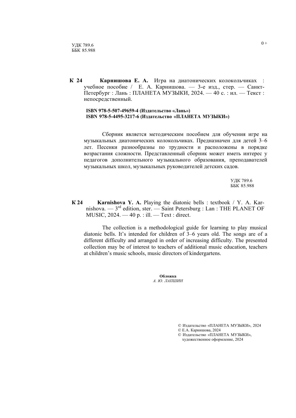 Сборник является методическим пособием для обучения игре на музыкальных диатонических колокольчиках. Предназначен для детей 3-6 лет. Песенки разнообразны по трудности и расположены в порядке возрастания сложности. Представленный сборник может иметь интерес у педагогов дополнительного музыкального образования, преподавателей музыкальных школ, музыкальных руководителей детских садов. The collection is a methodological guide for learning to play musical diatonic bells. It’s intended for children of 3–6 years old. The songs are of a different difficulty and arranged in order of increasing difficulty. The presented collection may be of interest to teachers of additional music education, teachers at children’s music schools, music directors of kindergartens.