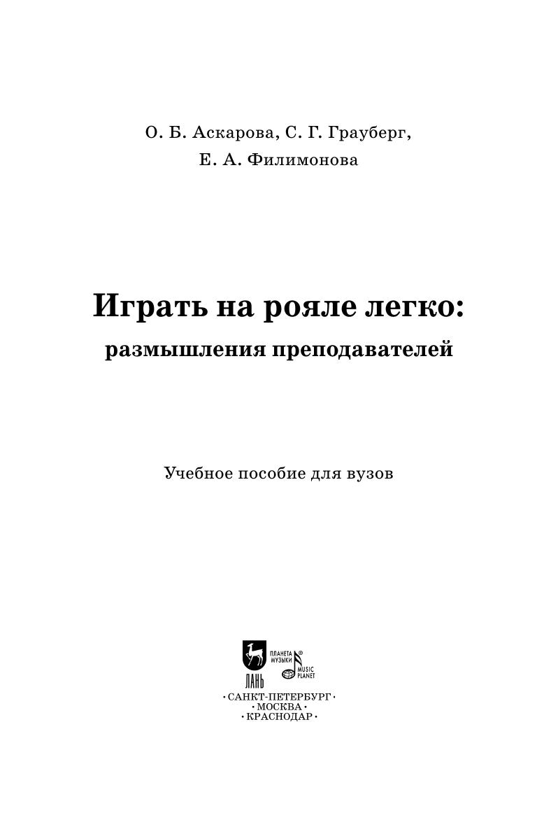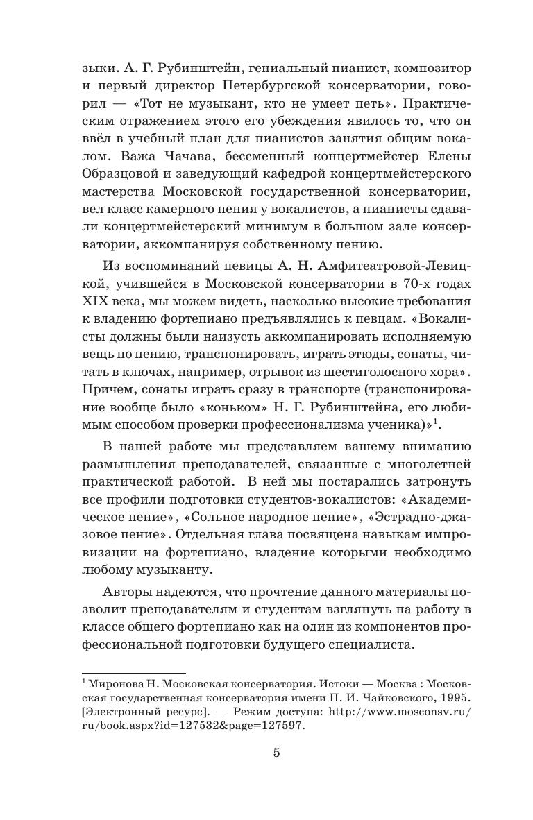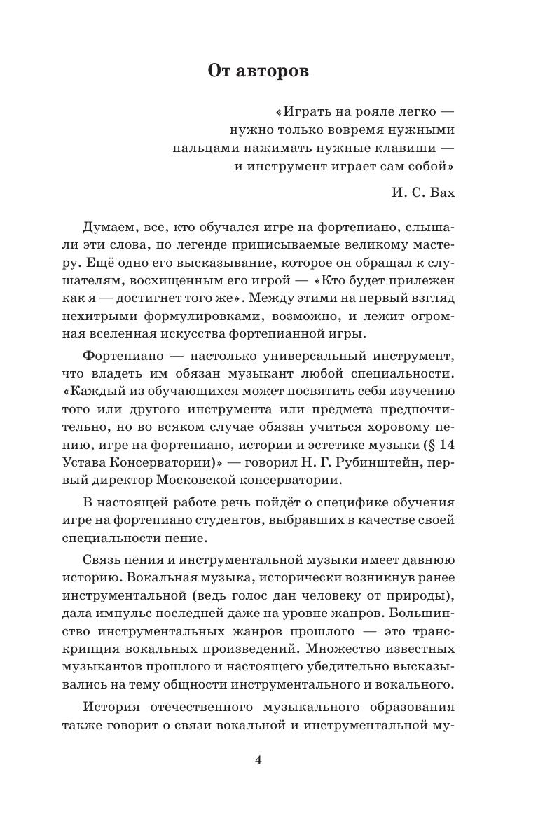 В данной работе преподаватели-практики рассказывают об опыте работы в классе фортепиано со студентами-вокалистами по программе бакалавриата. Речь идет о каждом направлении и профиле подготовки в области вокального искусства и содержит как обращение к истории данного вопроса, так и способы работы на инструменте. Глава об импровизации на фортепиано предоставляет методы обучения игре без нот, необходимые всем музыкантам. In the current work, practicing teachers talk about their experience of working in the piano class with vocalists studying in the undergraduate program. It concerns each direction and profile of training in the field of vocal arts and contains both an appeal to the history of this issue, and ways to master the instrument. The chapter on improvisation on piano provides methods for learning to play without notes, which are necessary for any musician.
