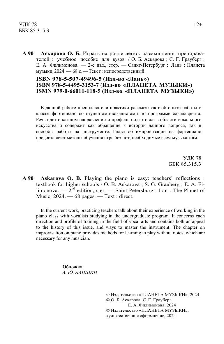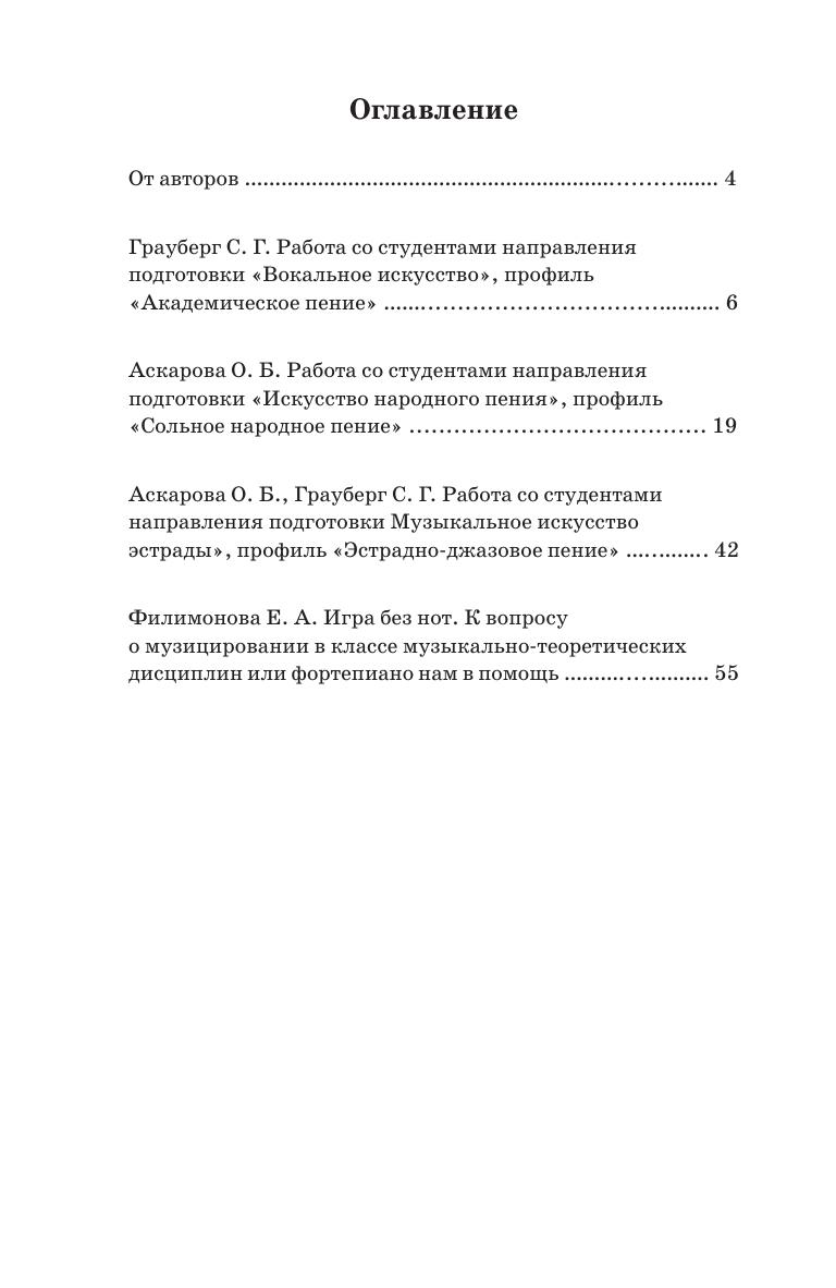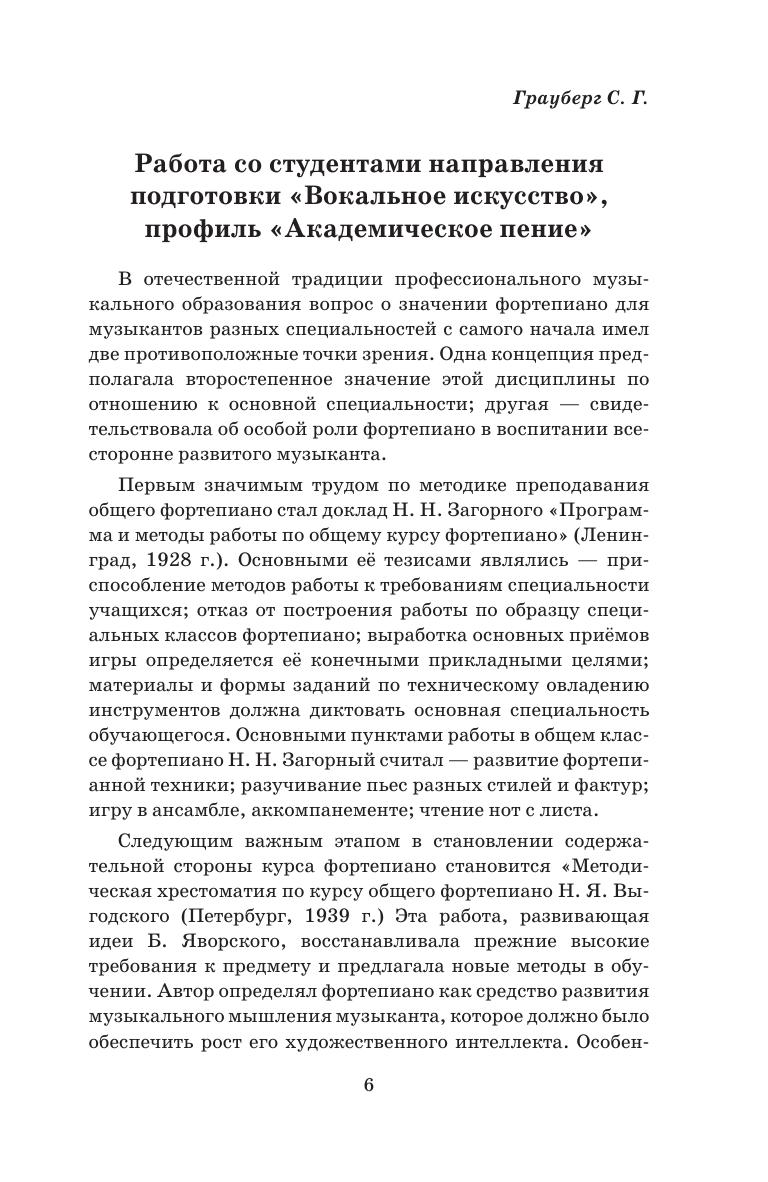 В данной работе преподаватели-практики рассказывают об опыте работы в классе фортепиано со студентами-вокалистами по программе бакалавриата. Речь идет о каждом направлении и профиле подготовки в области вокального искусства и содержит как обращение к истории данного вопроса, так и способы работы на инструменте. Глава об импровизации на фортепиано предоставляет методы обучения игре без нот, необходимые всем музыкантам. In the current work, practicing teachers talk about their experience of working in the piano class with vocalists studying in the undergraduate program. It concerns each direction and profile of training in the field of vocal arts and contains both an appeal to the history of this issue, and ways to master the instrument. The chapter on improvisation on piano provides methods for learning to play without notes, which are necessary for any musician.