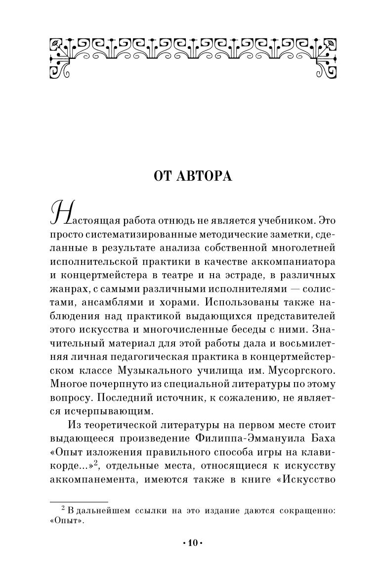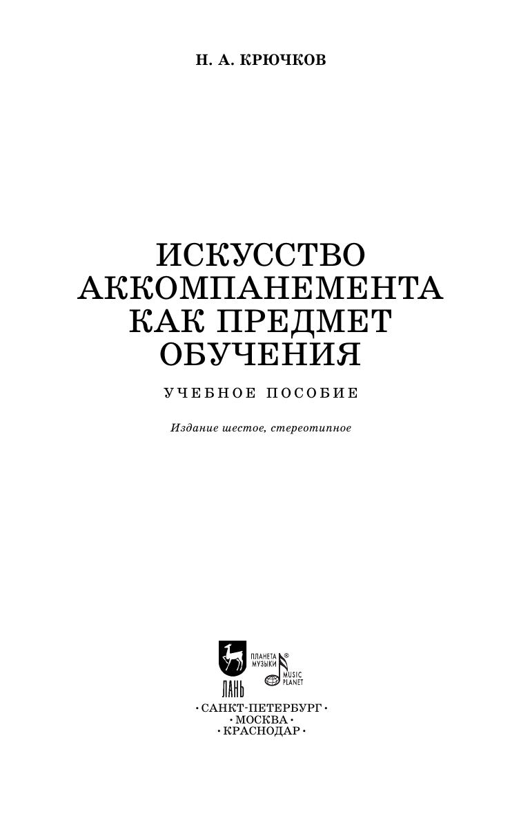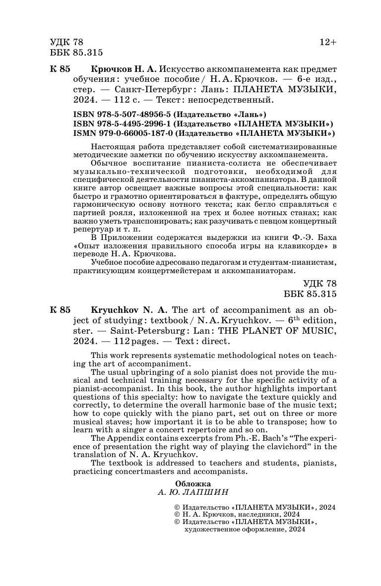 Настоящая работа Н. А. Крючкова представляет собой систематизированные методические заметки по обучению искусству аккомпанемента. Обычное воспитание пианиста-солиста не обеспечивает музыкально-технической подготовки, необходимой для специфической деятельности пианиста-аккомпаниатора. В данной книге автор освещает важные вопросы этой специальности: как быстро и грамотно ориентироваться в фактуре, определять общую гармоническую основу нотного текста, как бегло справляться с партией рояля, изложенной на трех и более нотных станах, как важно уметь транспонировать, как разучивать с певцом концертный репертуар и т.п. В Приложении содержатся выдержки из книги Ф.-Э. Баха «Опыт изложения правильного способа игры на клавикорде» в переводе Н. А. Крючкова. Издание адресовано педагогам и студентам-пианистам, практикующим концертмейстерам и аккомпаниаторам