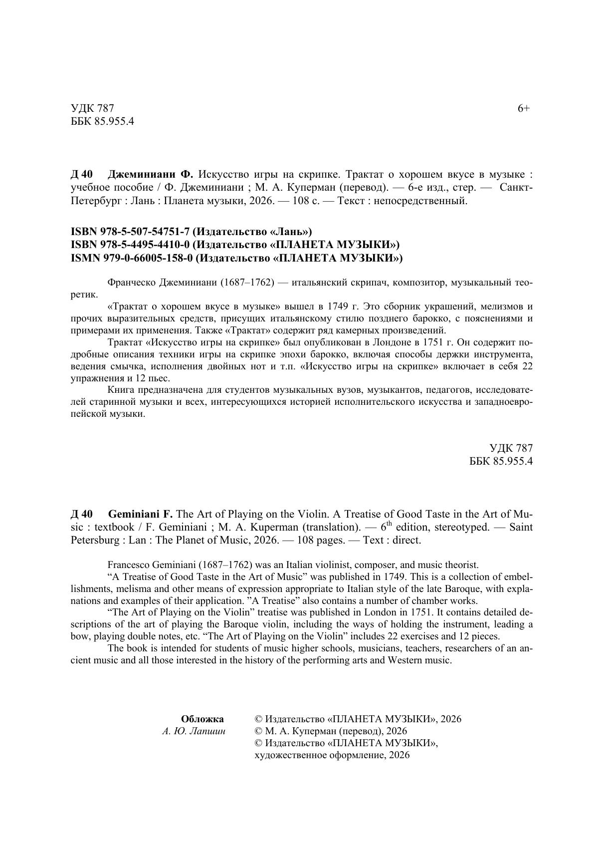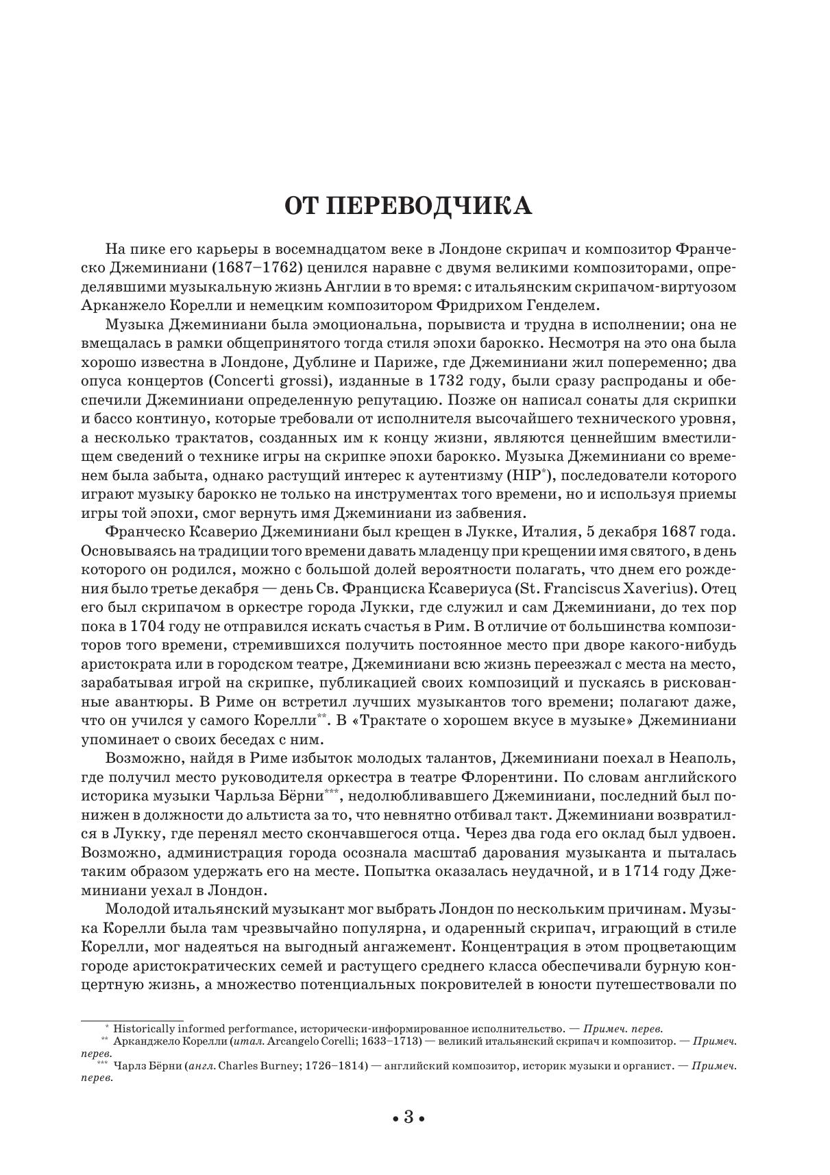 Франческо Джеминиани (1687-1762) – итальянский скрипач, композитор, музыкальный теоретик. «Трактат о хорошем вкусе в музыке» вышел в 1749 г. Это сборник украшений, мелизмов и прочих выразительных средств, присущих итальянскому стилю позднего барокко, с пояснениями и примерами их применения. Также «Трактат» содержит ряд камерных произведений. Трактат «Искусство игры на скрипке» был опубликован в Лондоне в 1751 г. Он содержит подробные описания техники игры на скрипке эпохи барокко, включая способы держки инструмента, ведения смычка, исполнения двойных нот и т.п. «Искусство игры на скрипке» включает в себя 22 упражнения и 12 пьес. Книга предназначена для студентов музыкальных вузов, музыкантов, педагогов, исследователей старинной музыки и всех, интересующихся историей исполнительского искусства и западноевропейской музыки.