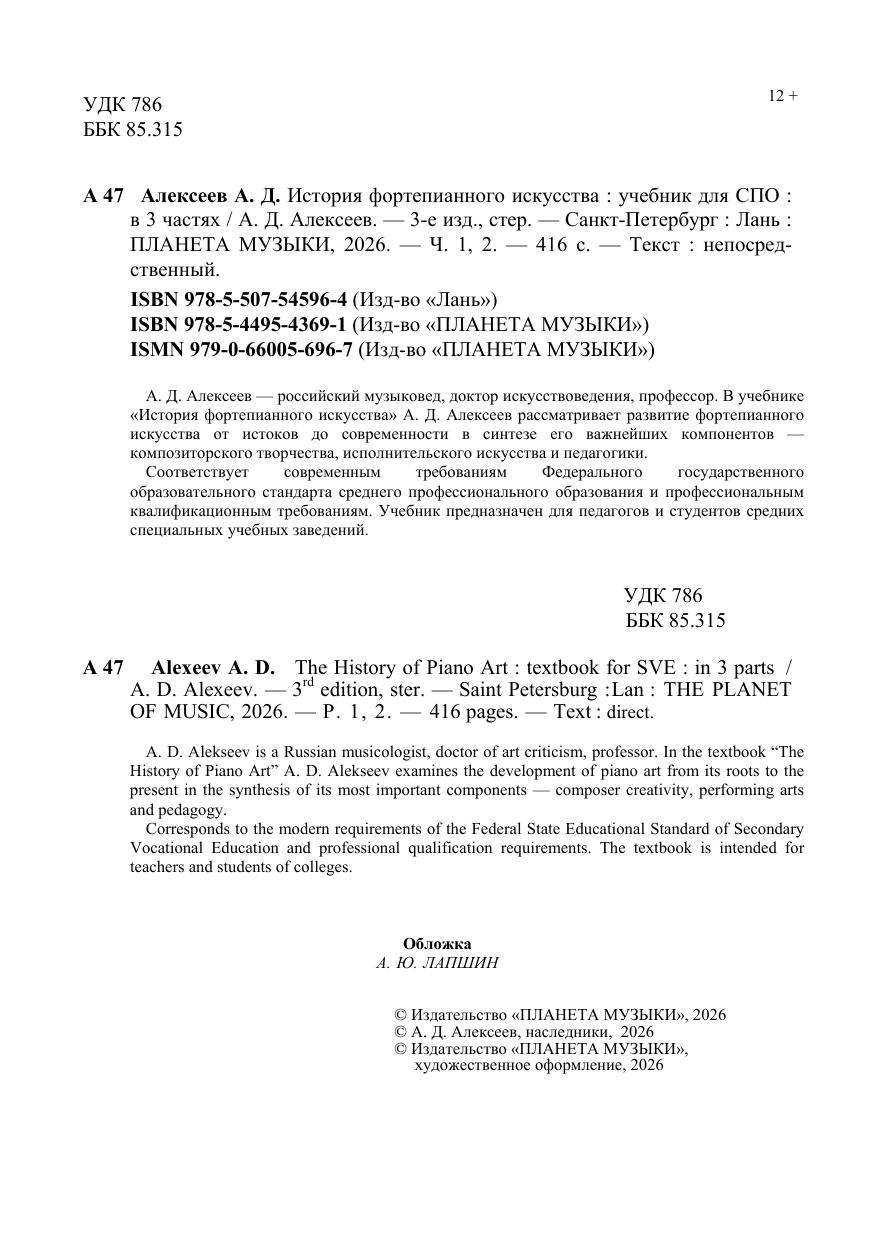 А. Д. Алексеев — российский музыковед, доктор искусствоведения, профессор. В учебнике «История фортепианного искусства» А. Д. Алексеев рассматривает развитие фортепианного искусства от истоков до современности в синтезе его важнейших компонентов — композиторского творчества, исполнительского искусства и педагогики. Учебник предназначен для педагогов и студентов средних специальных учебных заведений. A. D. Alekseev is a Russian musicologist, doctor of art criticism, professor. In the textbook "The History of Piano Art" A. D. Alekseev examines the development of piano art from its roots to the present in the synthesis of its most important components — composer creativity, performing arts and pedagogy. The textbook is intended for teachers and students of colleges.