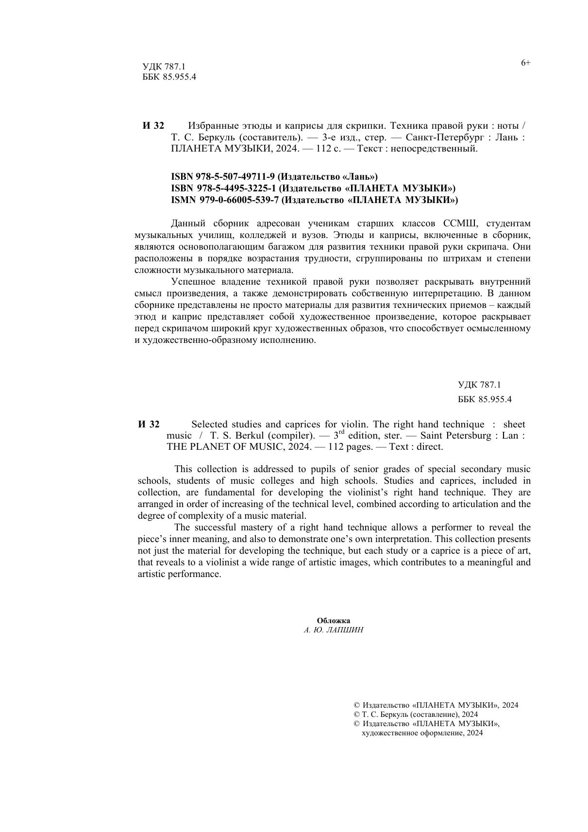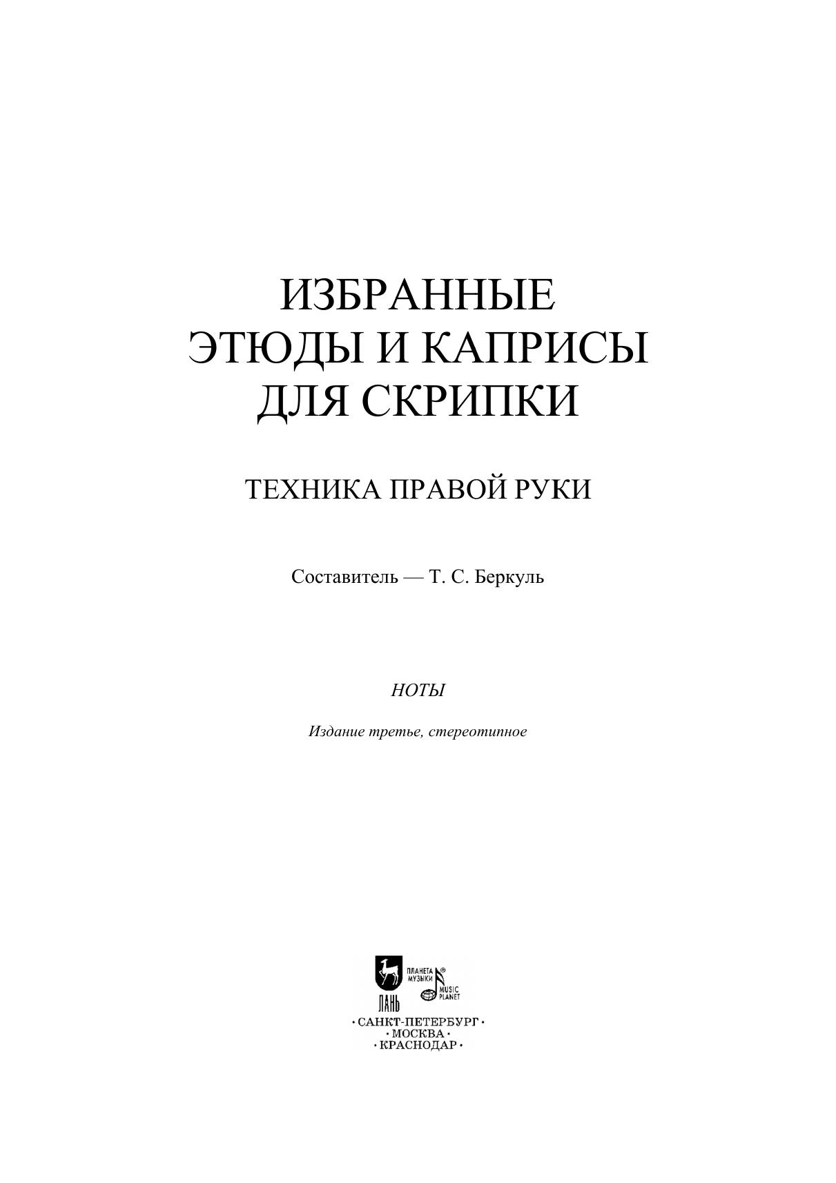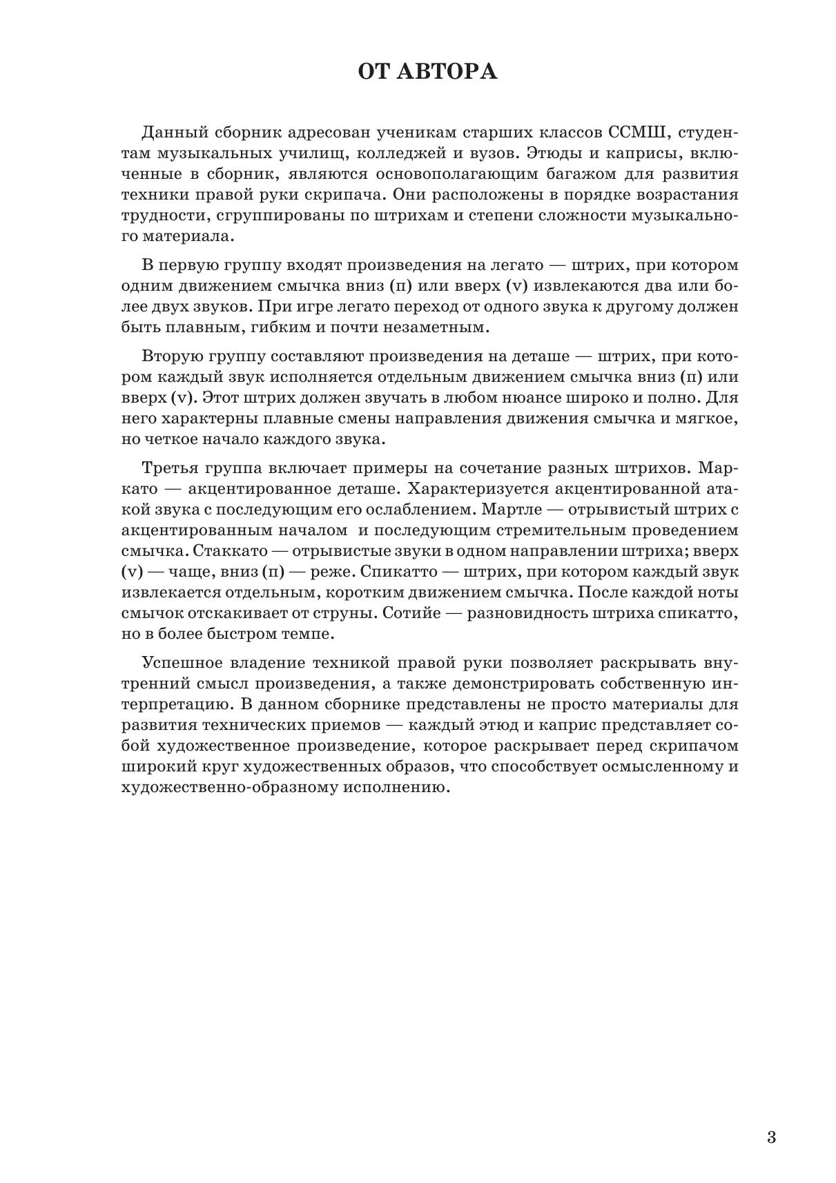 Данный сборник адресован ученикам старших классов ССМШ, студентам музыкальных училищ, колледжей и вузов. Этюды и каприсы, включенные в сборник, являются основополагающим багажом для развития техники правой руки скрипача. Они расположены в порядке возрастания трудности, сгруппированы по штрихам и степени сложности музыкального материала. Успешное владение техникой правой руки позволяет раскрывать внутренний смысл произведения, а также демонстрировать собственную интерпретацию. В данном сборнике представлены не просто материалы для развития технических приемов – каждый этюд и каприс представляет собой художественное произведение, которое раскрывает перед скрипачом широкий круг художественных образов, что способствует осмысленному и художественно-образному исполнению. This collection is addressed to pupils of senior grades of special secondary music schools, students of music colleges and high schools. Studies and caprices, included in collection, are fundamental for developing the violinist’s right hand technique. They are arranged in order of increasing of the technical level, combined according to shades and the degree of complexity of a music material. The successful mastery of a right hand technique allows a performer to reveal the piece’s inner meaning, and also to demonstrate one’s own interpretation. This collection presents not just the material for developing the technique, but each study or a caprice is a piece of art, that reveals to a violinist a wide range of artistic images, which contributes to a meaningful and artistic performance.