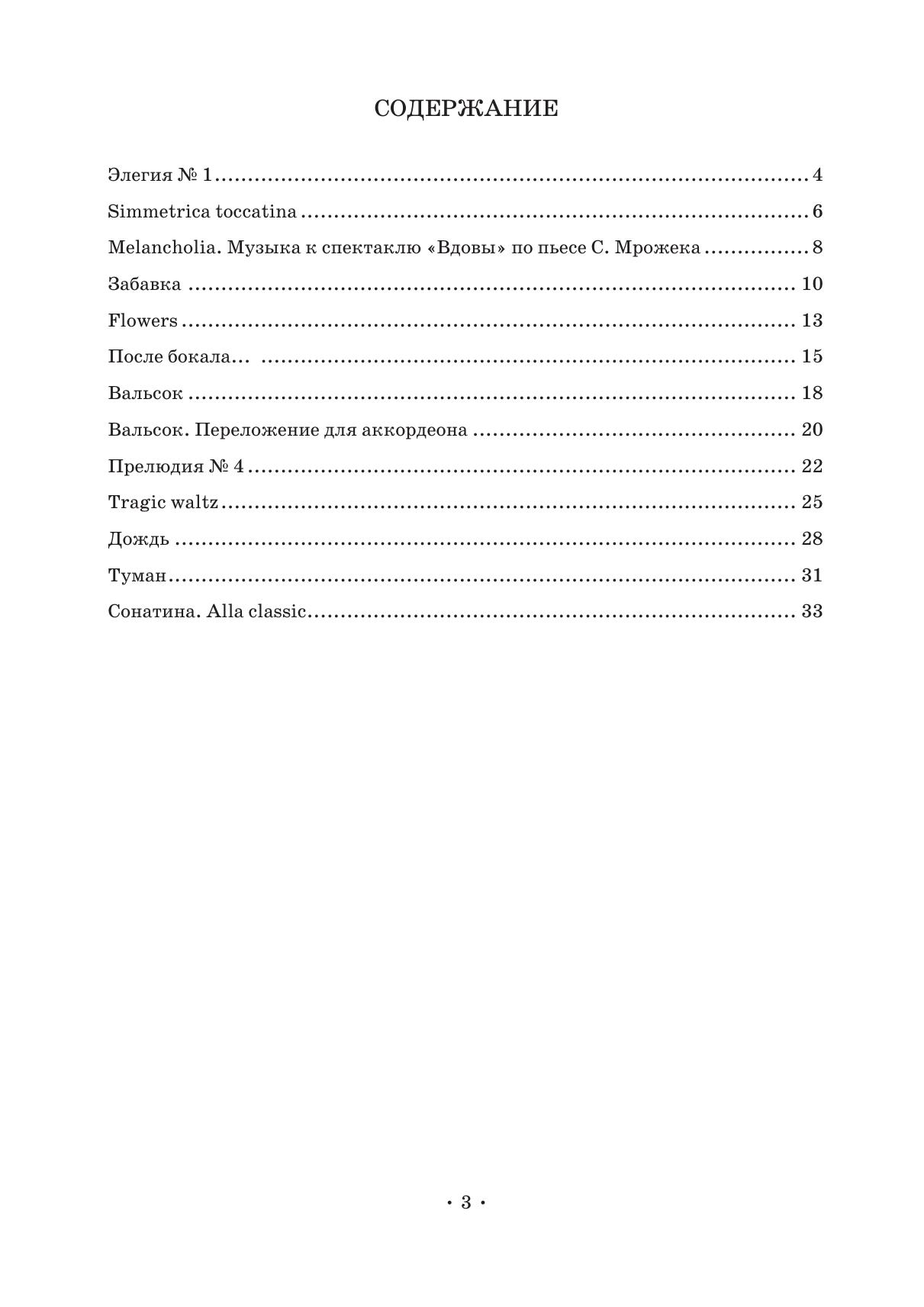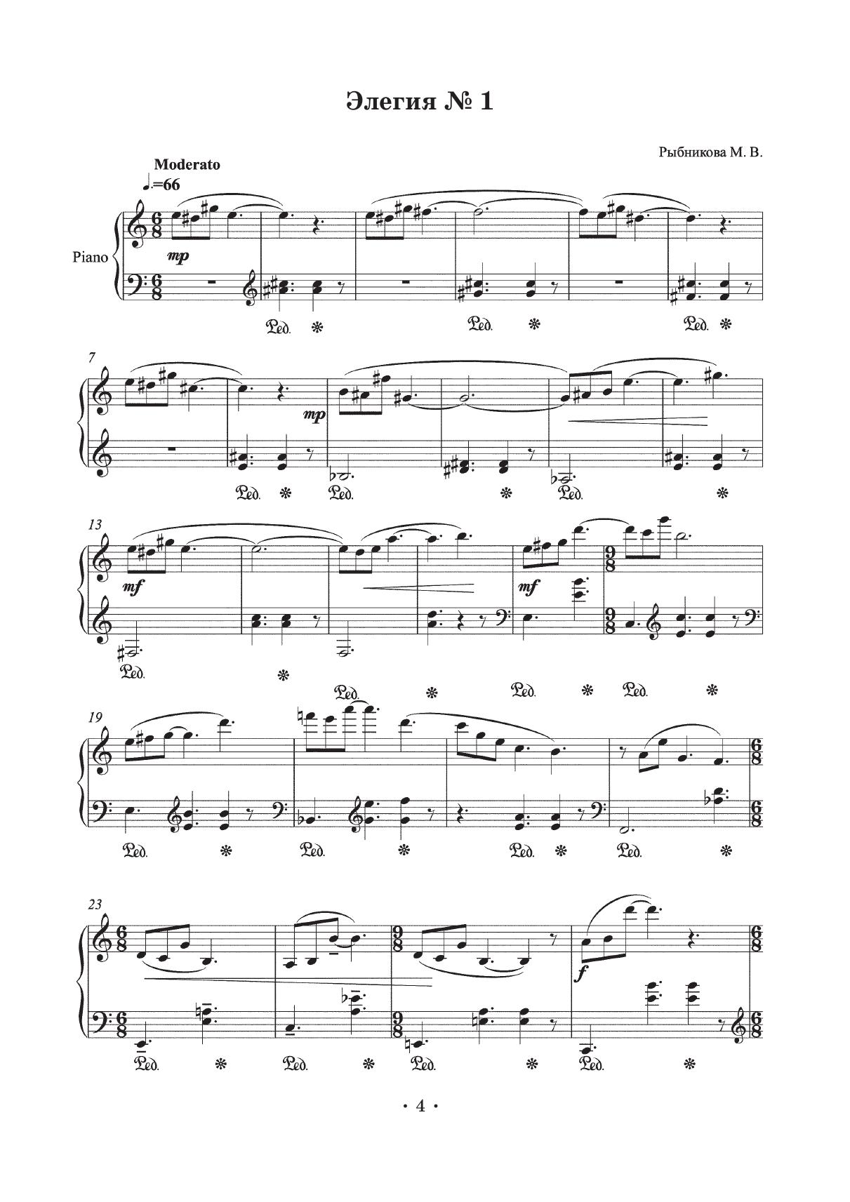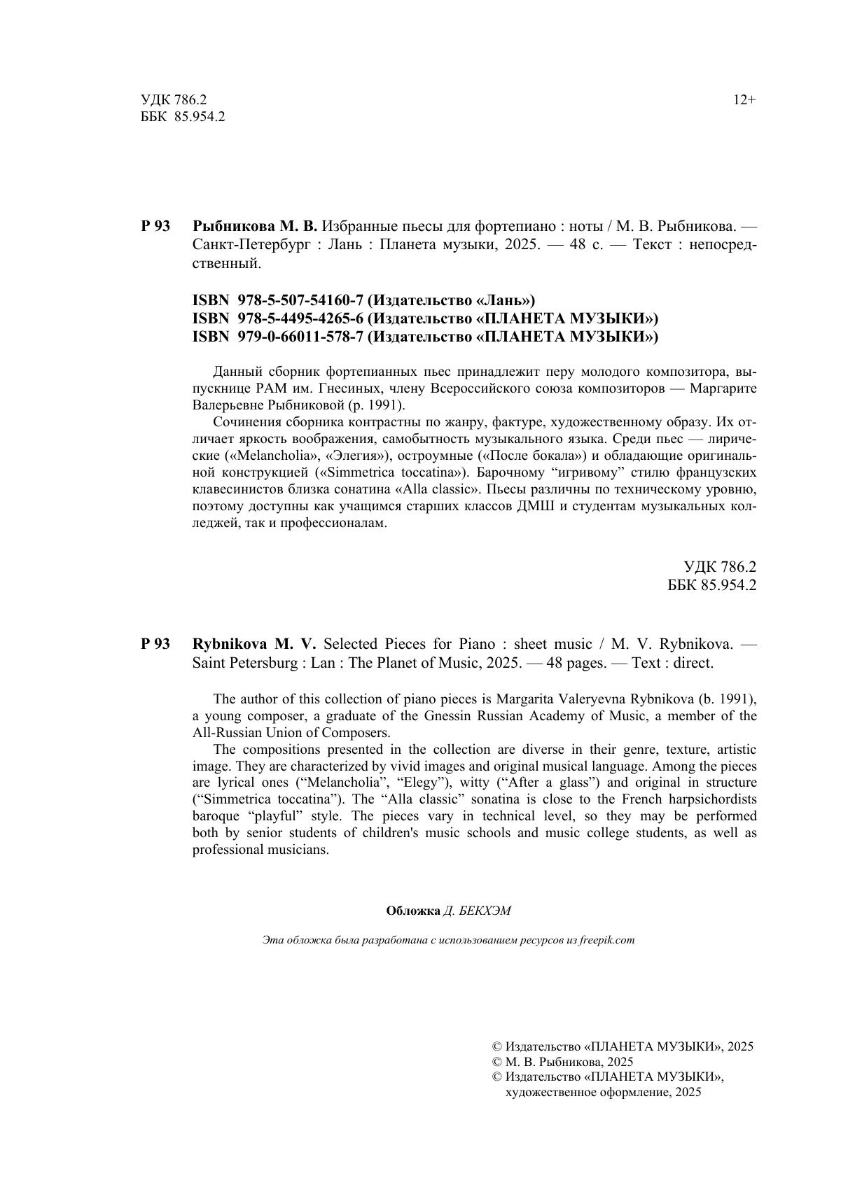 Данный сборник фортепианных пьес принадлежит перу молодого композитора, выпускнице РАМ им. Гнесиных, члену Всероссийского союза композиторов — Маргарите Валерьевне Рыбниковой (1991 г.р.). Сочинения сборника контрастны по жанру, фактуре, художественному образу. Их отличает яркость воображения, самобытность музыкального языка. Среди пьес — лирические («Melancholia», «Элегия»), остроумные («После бокала») и обладающие оригинальной конструкцией («Simmetrica toccatina»). Барочному "игривому" стилю французских клавесинистов близка сонатина «Alla classic». Пьесы различны по техническому уровню, поэтому доступны как учащимся старших классов ДМШ и студентам музыкальных колледжей, так и профессионалам. The author of this collection of piano pieces is Margarita Valeryevna Rybnikova (b. 1991), a young composer, a graduate of the Gnessin Russian Academy of Music, a member of the All-Russian Union of Composers. The compositions presented in the collection are diverse in their genre, texture, artistic image. They are characterized by vivid images and original musical language. Among the pieces are lyrical ones (“Melancholia”, “Elegy”), witty (“After a glass”) and original in structure (“Simmetrica toccatina”). The “Alla classic” sonatina is close to the French harpsichordistsтbaroque “playful” style. The pieces vary in technical level, so they may be performed both by senior students of children's music schools and music college students, as well as professional musicians.