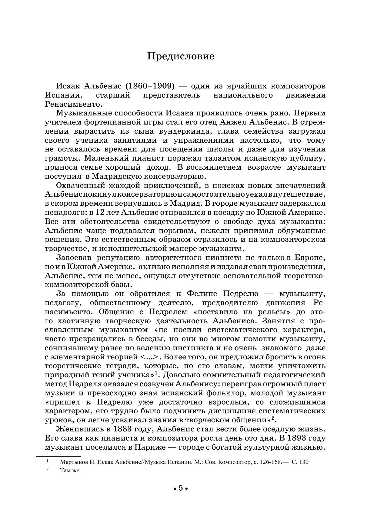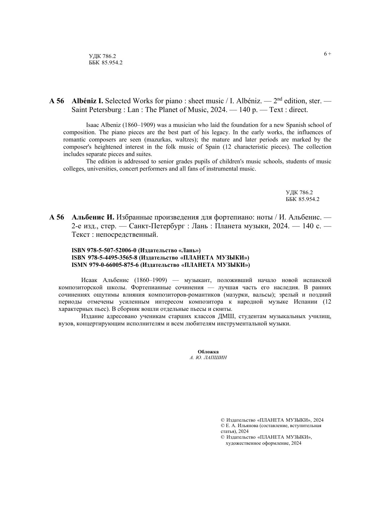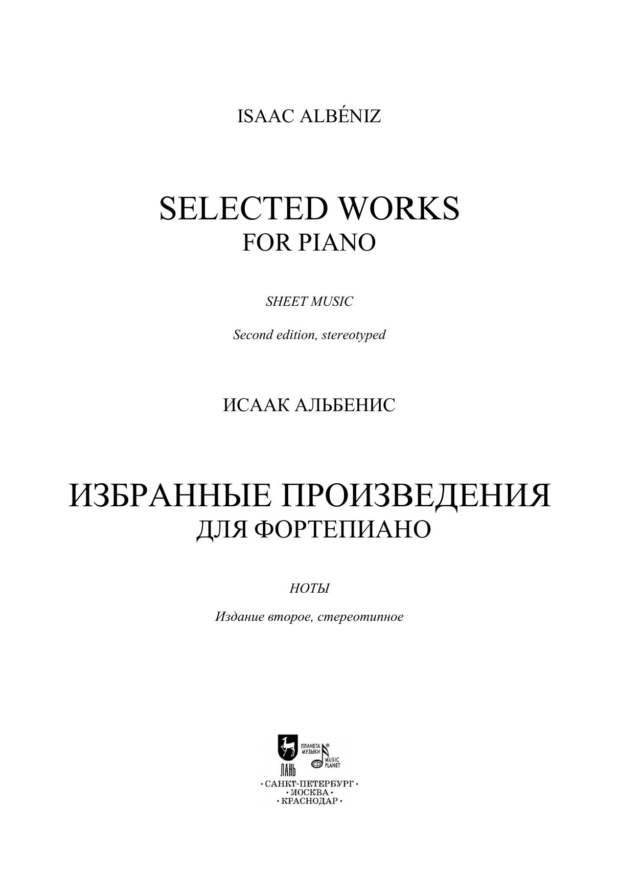 Исаак Альбенис (1860-1909) — музыкант, положивший начало новой испанской композиторской школы. Фортепианные сочинения — лучшая часть его наследия. В ранних сочинениях ощутимы влияния композиторов-романтиков (мазурки, вальсы), зрелый и поздний периоды отмечены усиленным интересом композитора к народной музыке Испании (12 характерных пьес). В сборник вошли отдельные пьесы и сюиты. Издание адресовано ученикам старших классов ДМШ, студентам музыкальных училищ, ВУЗов, концертирующим исполнителям и всем любителям инструментальной музыки. Isaac Albеniz (1860–1909) was a musician who laid the foundation for a new Spanish school of composition. The piano pieces are the best part of his legacy. In the early works, the influences of romantic composers are seen (mazurkas, waltzes), the mature and later periods are marked by the composer's heightened interest in the folk music of Spain (12 characteristic pieces). The collection includes separate pieces and suites. The edition is addressed to senior grades pupils of children's music schools, students of music colleges, universities, concert performers and all fans of instrumental music.