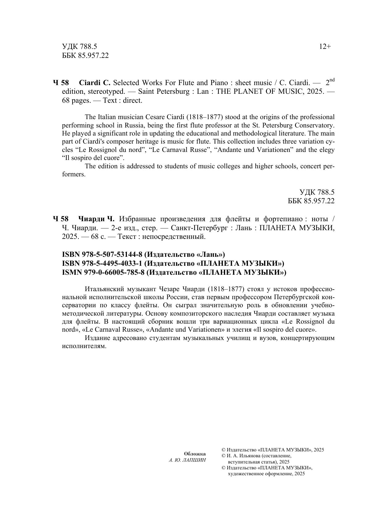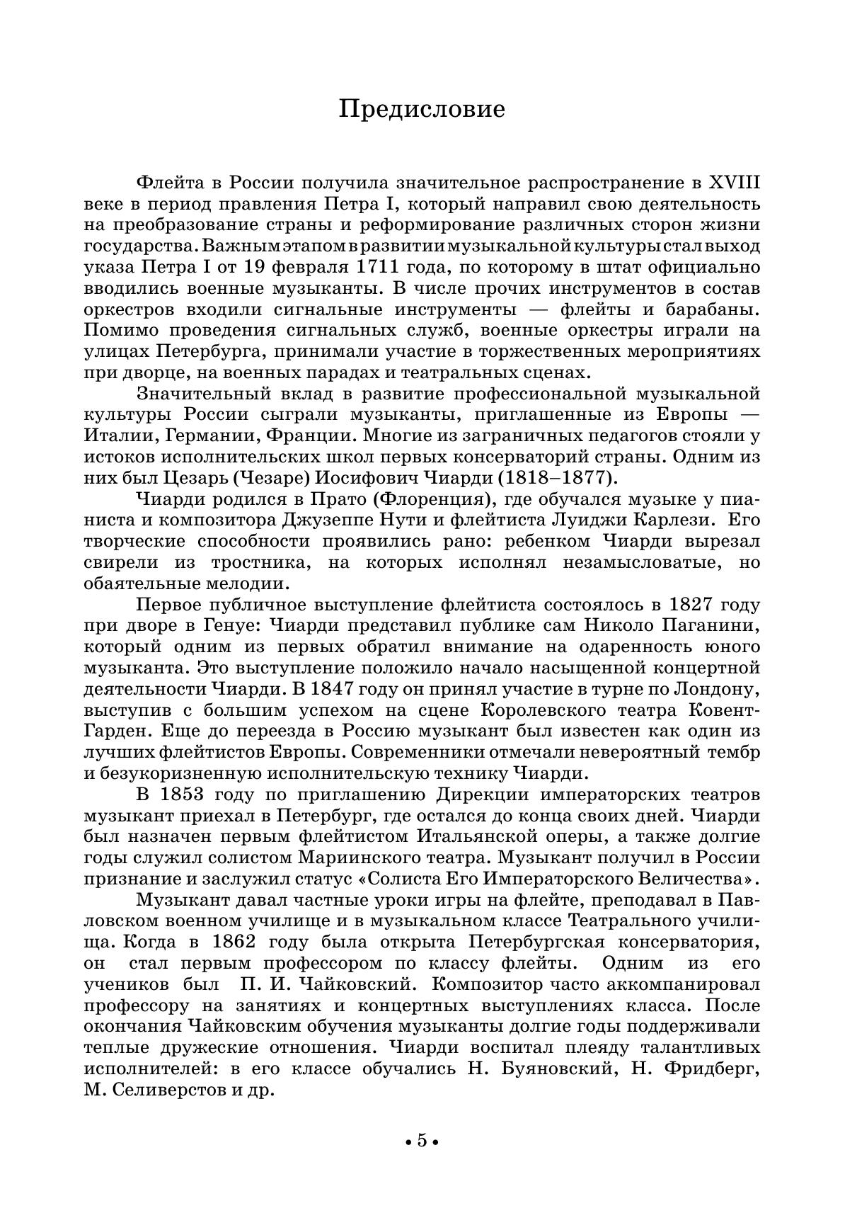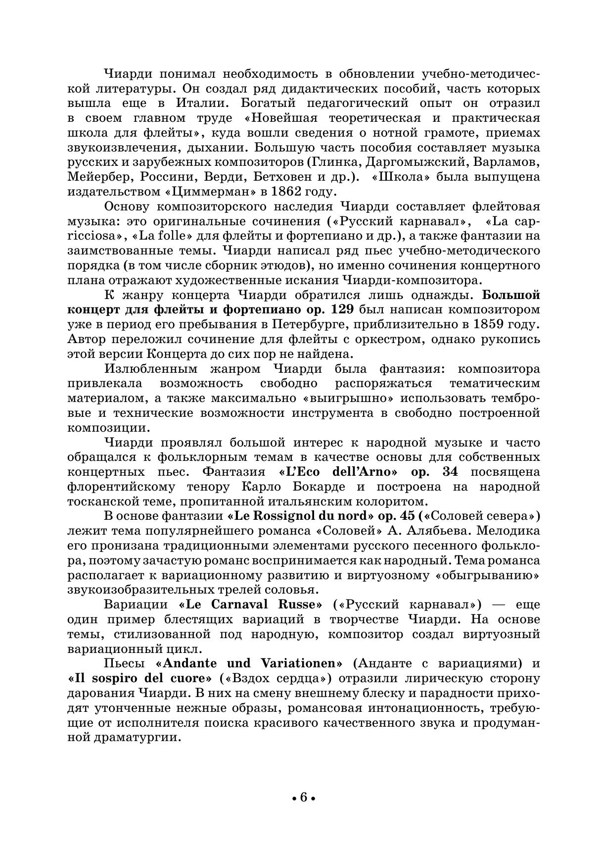 Итальянский музыкант Чезаре Чиарди (1818-1877) стоял у истоков профессиональной исполнительской школы России, став первым профессором Петербургской консерватории по классу флейты. Он сыграл значительную роль в обновлении учебно-методической литературы. Основу композиторского наследия Чиарди составляет музыка для флейты. В настоящий сборник вошли три вариационных цикла «Le Rossignol du nord», «Le Carnaval Russe», «Andante und Variationen» и элегия «Il sospiro del cuore». Издание адресовано студентам музыкальных училищ и ВУЗов, концертирующим исполнителям.