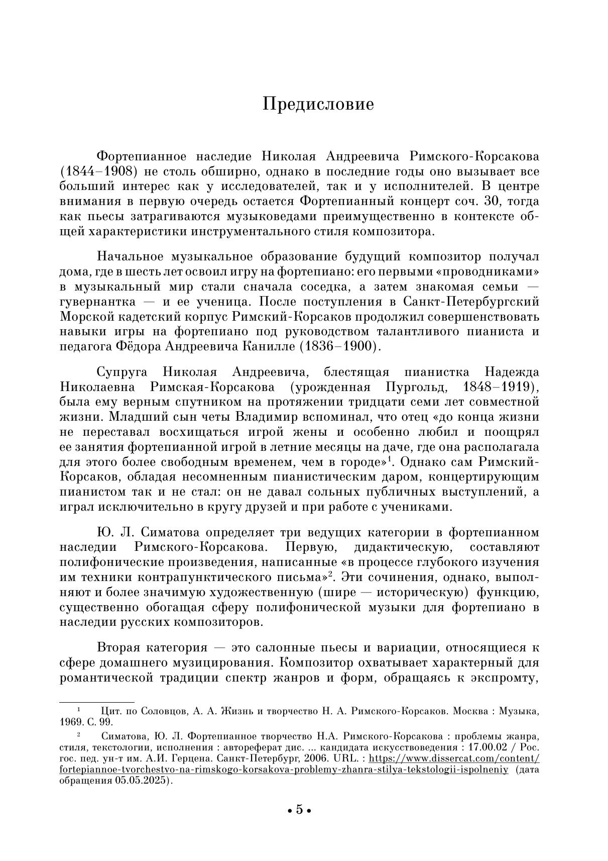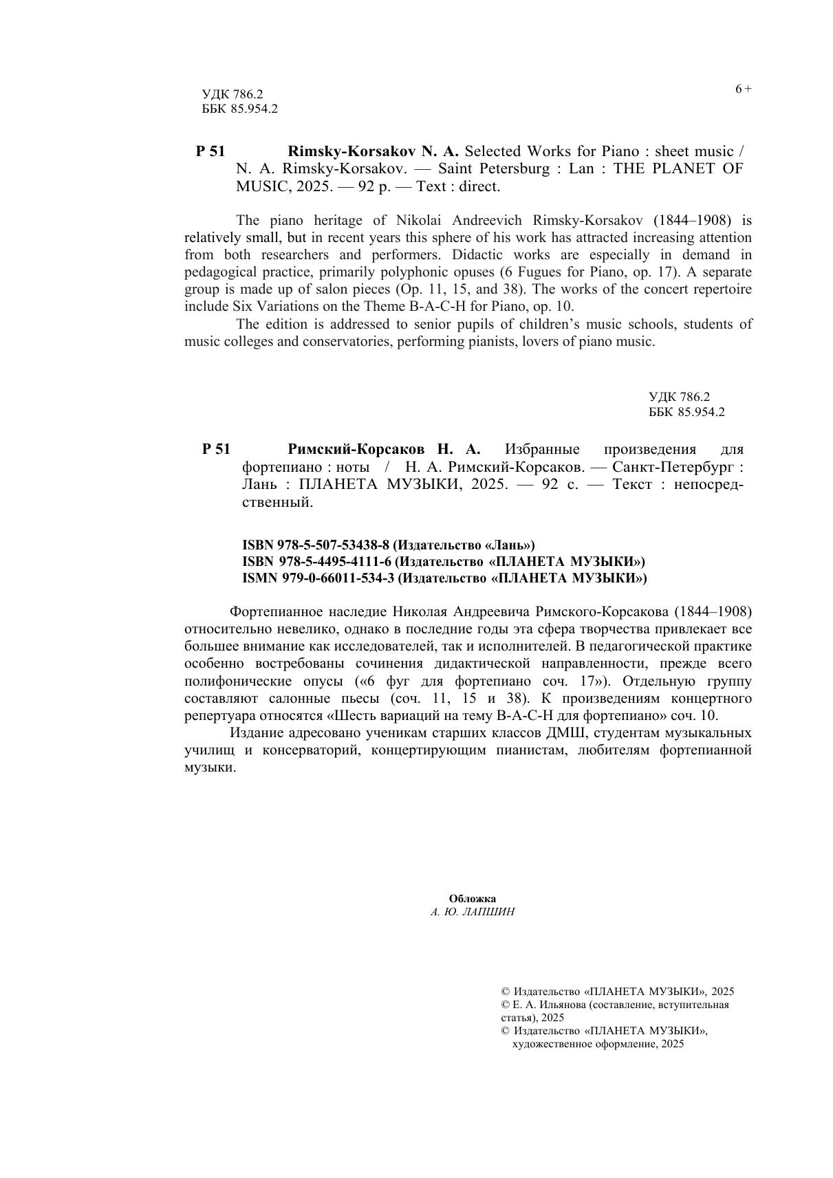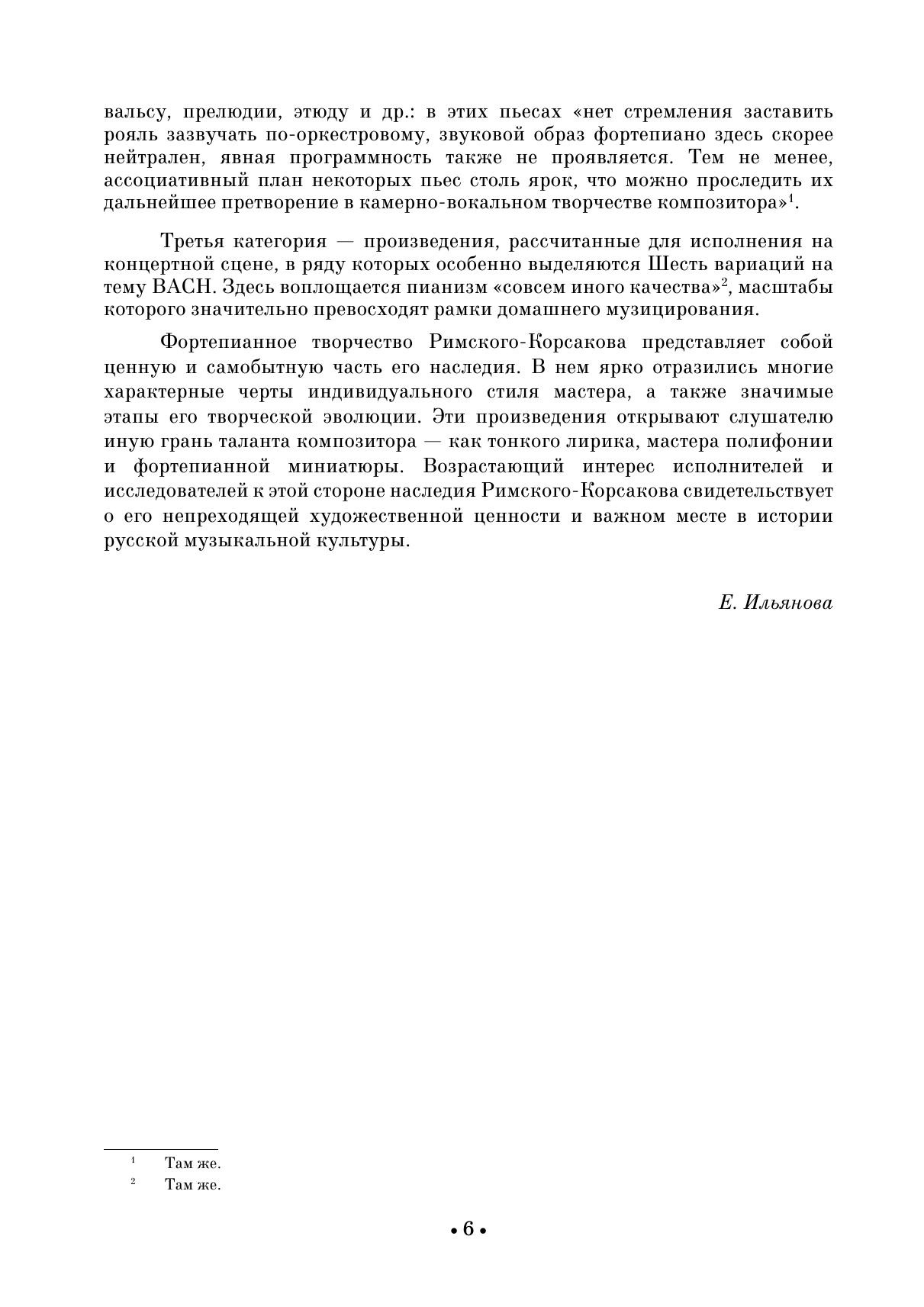 Фортепианное наследие Николая Андреевича Римского-Корсакова (1844–1908) относительно невелико, однако в последние годы эта сфера творчества привлекает все большее внимание как исследователей, так и исполнителей. В педагогической практике особенно востребованы сочинения дидактической направленности, прежде всего полифонические опусы («6 фуг для фортепиано соч. 17»). Отдельную группу составляют салонные пьесы (соч. 11, 15 и 38). К произведениям концертного репертуара относятся «Шесть вариаций на тему B-A-C-H для фортепиано» соч. 10. Издание адресовано ученикам старших классов ДМШ, студентам музыкальных училищ и консерваторий, концертирующим пианистам, любителям фортепианной музыки. The piano heritage of Nikolai Andreevich Rimsky-Korsakov (1844–1908) is relatively small, but in recent years this sphere of his work has attracted increasing attention from both researchers and performers. Didactic works are especially in demand in pedagogical practice, primarily polyphonic opuses (6 Fugues for Piano, op. 17). A separate group is made up of salon pieces (Op. 11, 15, and 38). The works of the concert repertoire include Six Variations on the Theme B-A-C-H for Piano, op. 10. The edition is addressed to senior pupils of children’s music schools, students of music colleges and conservatories, performing pianists, lovers of piano music.
