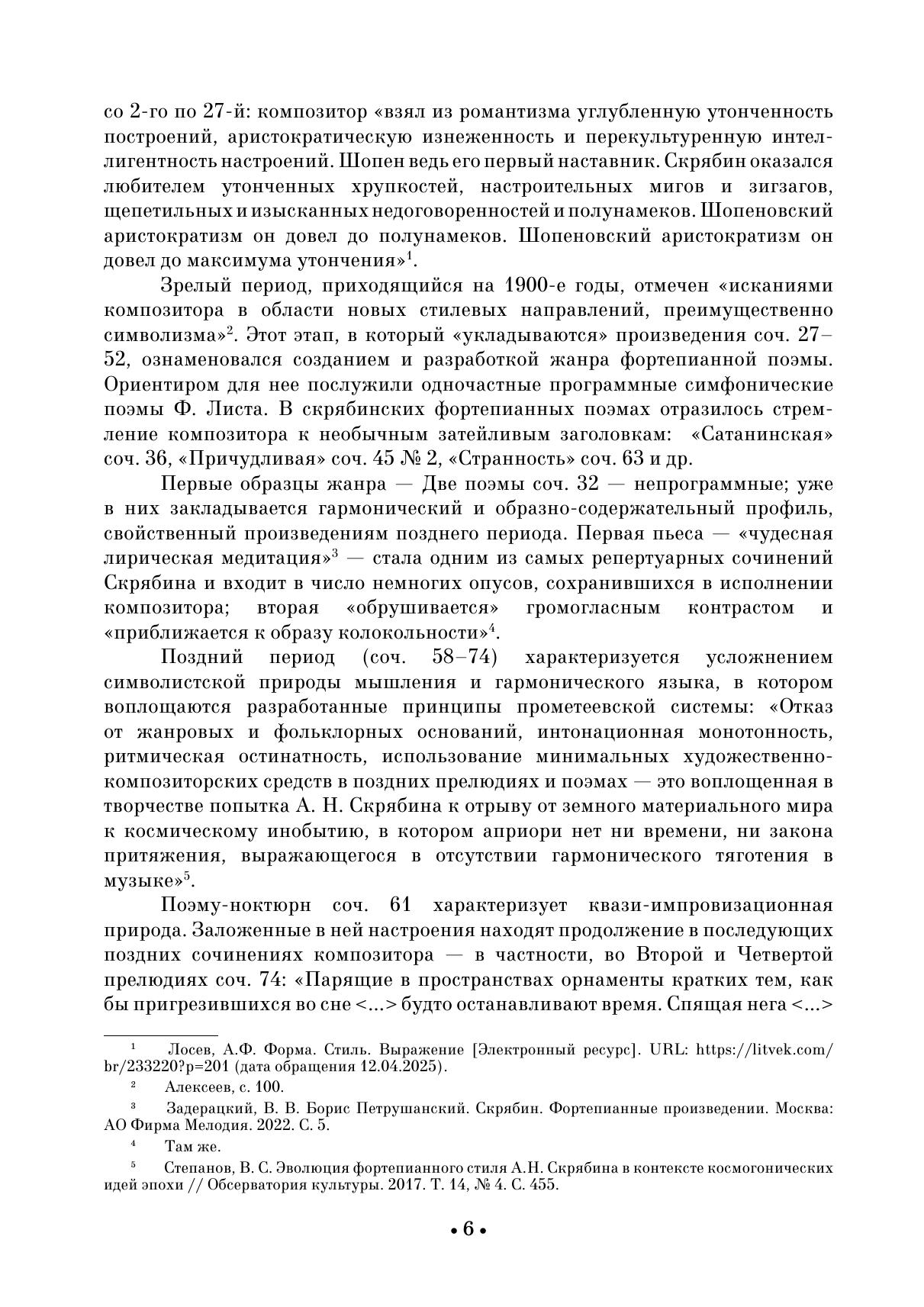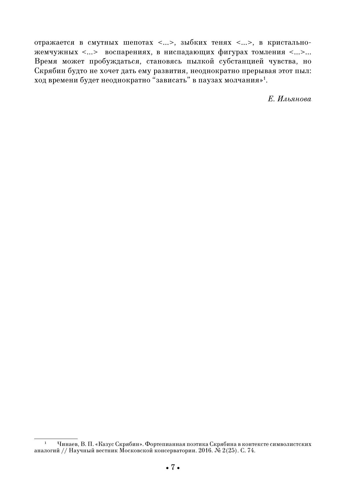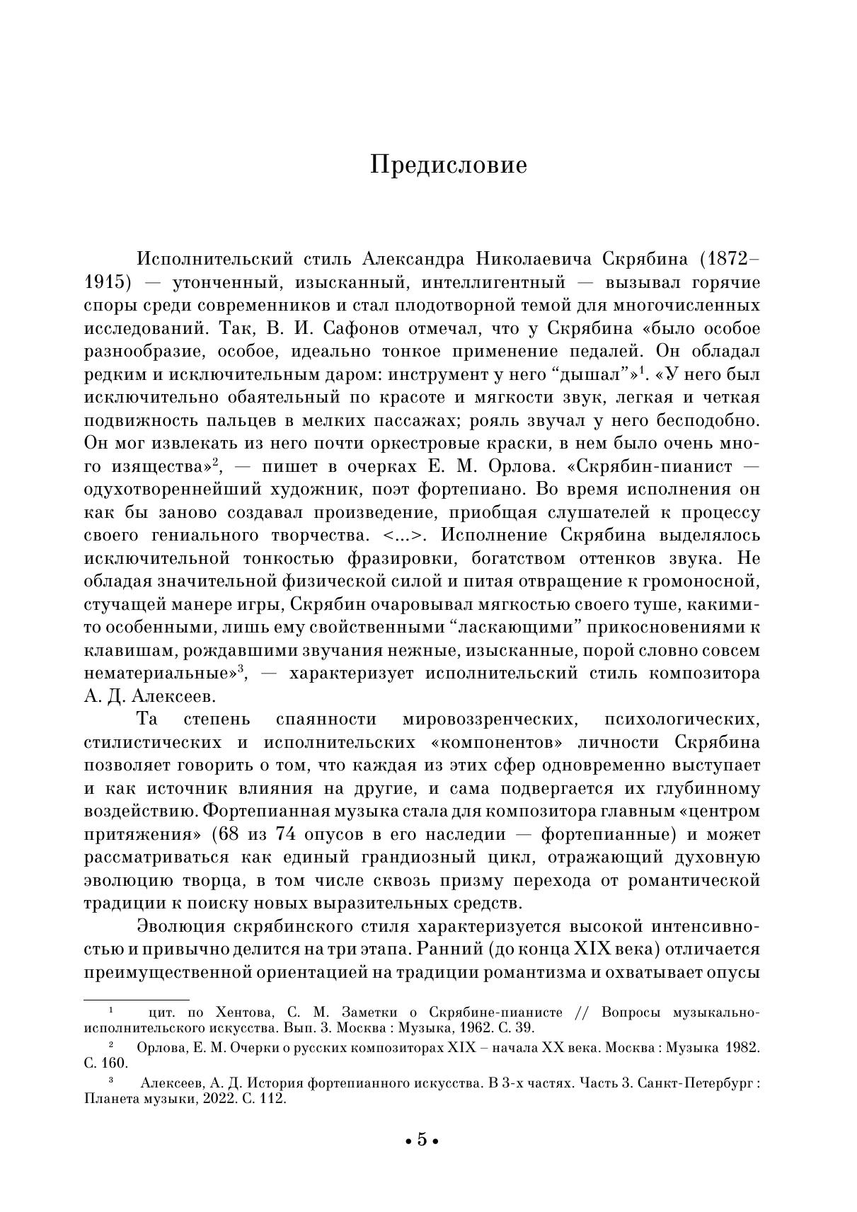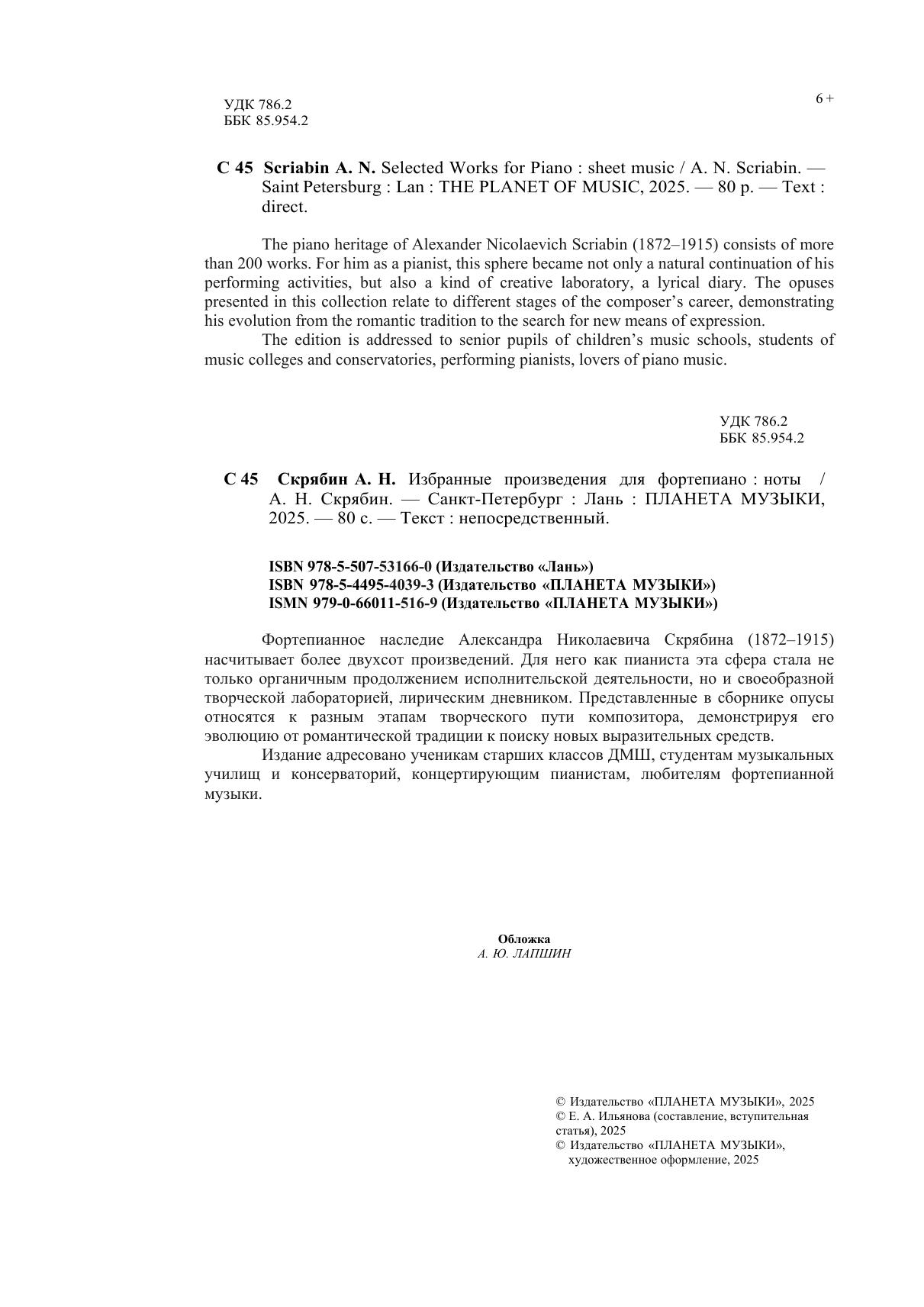 Фортепианное наследие Александра Николаевича Скрябина (1872–1915) насчитывает более двухсот произведений. Для него как пианиста эта сфера стала не только органичным продолжением исполнительской деятельности, но и своеобразной творческой лабораторией, лирическим дневником. Представленные в сборнике опусы относятся к разным этапам творческого пути композитора, демонстрируя его эволюцию от романтической традиции к поиску новых выразительных средств. Издание адресовано ученикам старших классов ДМШ, студентам музыкальных училищ и консерваторий, концертирующим пианистам, любителям фортепианной музыки. The piano heritage of Alexander Nicolaevich Scriabin (1872–1915) consists of more than 200 works. For him as a pianist, this sphere became not only a natural continuation of his performing activities, but also a kind of creative laboratory, a lyrical diary. The opuses presented in this collection relate to different stages of the composer’s career, demonstrating his evolution from the romantic tradition to the search for new means of expression. The edition is addressed to senior pupils of children’s music schools, students of music colleges and conservatories, performing pianists, lovers of piano music.