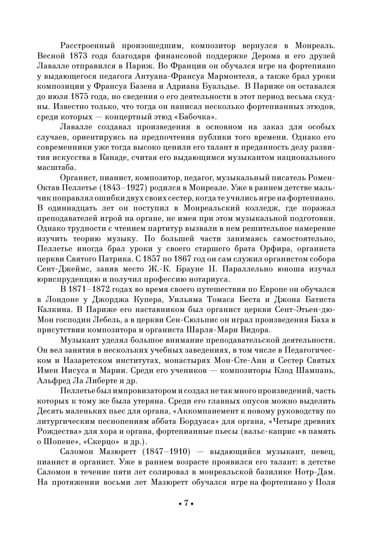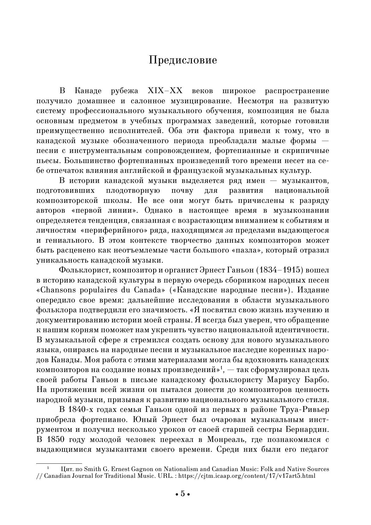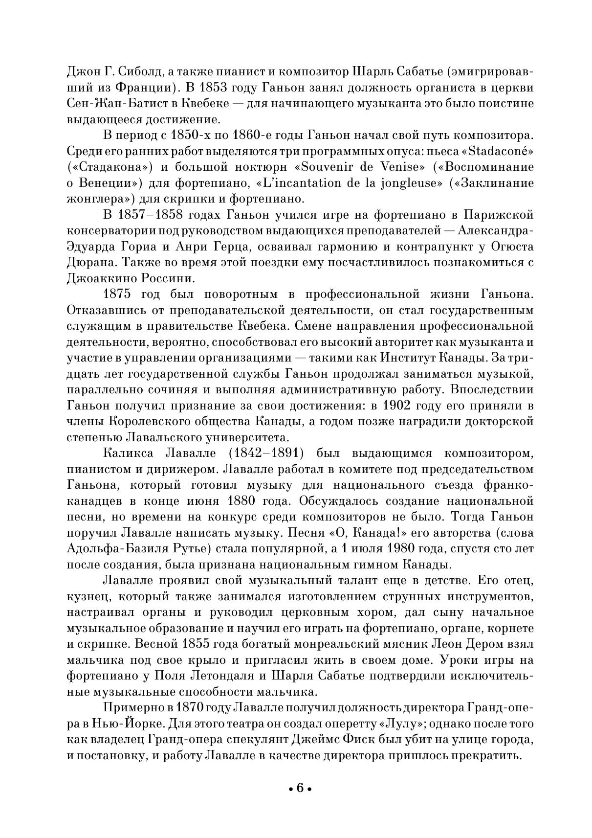 В Канаде на рубеже XIX–XX веков широкое распространение получило домашнее и салонное музицирование. В канадской музыке этого периода преобладали малые формы — песни с инструментальным сопровождением, фортепианные и скрипичные пьесы. Профессиональная композиторская школа в Канаде начала формироваться в 1920-е годы. Канадская музыка, осваивая новые веяния мирового искусства, постепенно обретала национальные особенности. В сборник вошли фортепианные опусы композиторов конца XIX — первой половины XX веков: Э. Ганьона, К. Лавалле, Р.-О. Пеллетье, С. Мазюретта, А. Контанта, А. Летондаля, Ж.-Б. Лафреньера. Издание адресовано ученикам ДМШ, студентам музыкальных училищ, вузов, любителям фортепианной музыки. The home and salon music-making became very popular in Canada at the turn of the 19th and 20th centuries. Canadian music of this period was dominated by small forms — songs with instrumental accompaniment, piano and violin pieces. The professional school of composers in Canada started to form in the 1920s. Canadian music, following the new trends in the world art, gradually acquired national features. The collection includes piano works by composers of the late 19th — the first half of the 20th centuries: E. Gagnon, C. Lavallée, R.-O. Pelletier, S. Mazurette, A. Contant, A. Letondal, J.-B. Lafrenière. The collection is addressed to students of children’s music schools, colleges and higher schools, lovers of piano music.