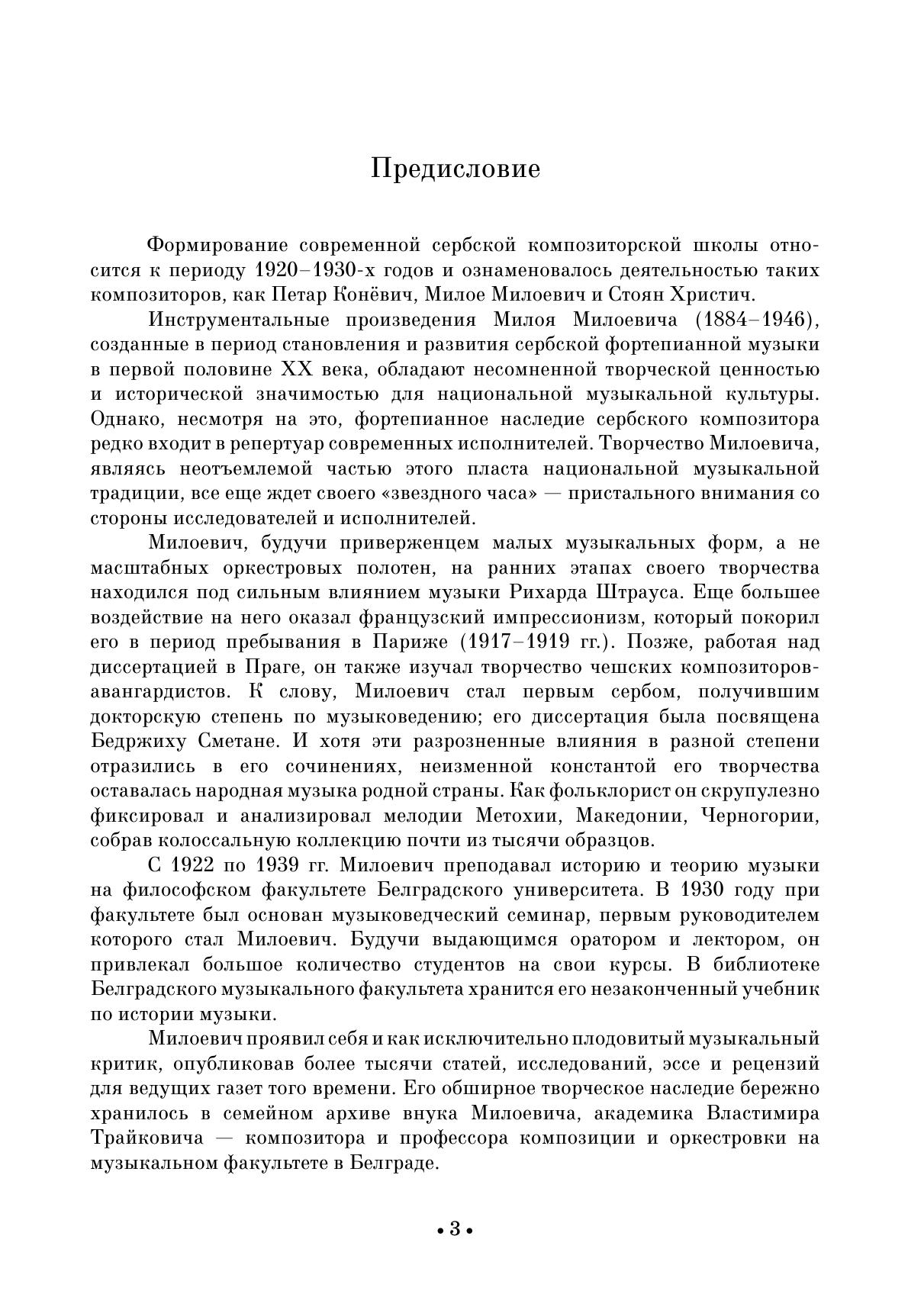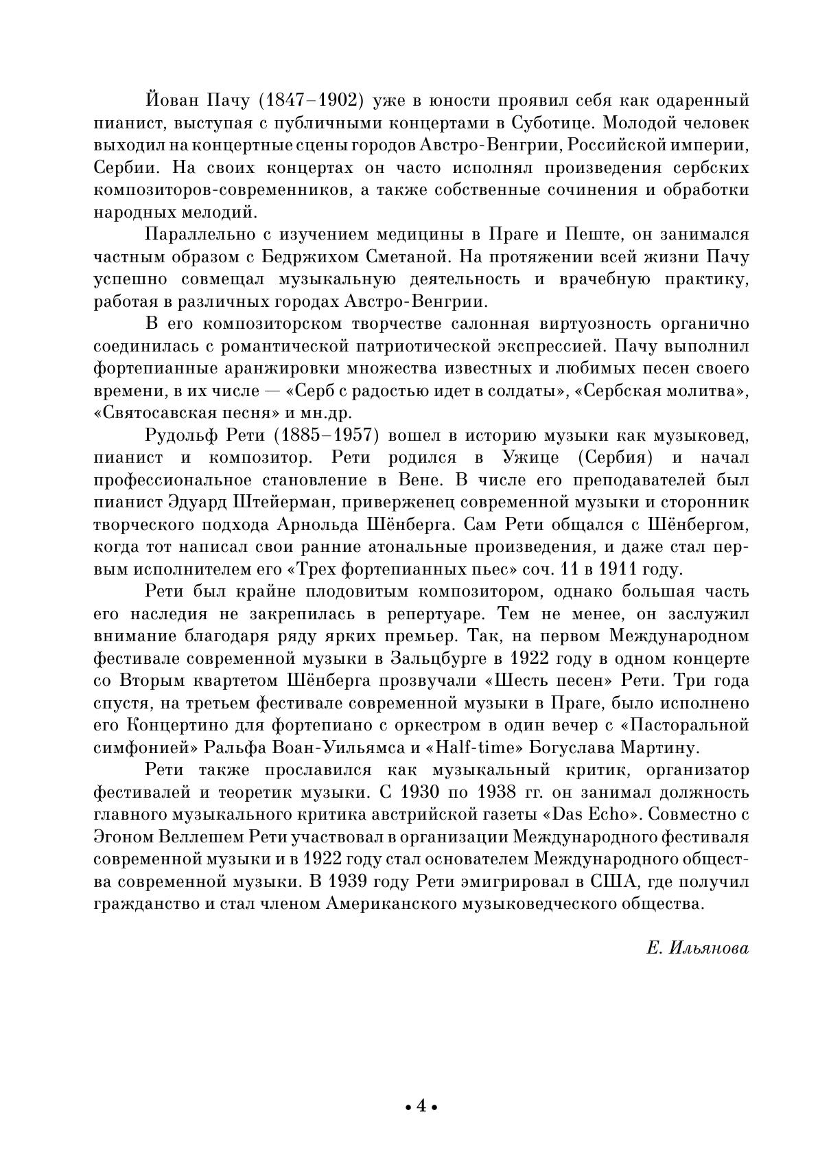 Формирование современной сербской композиторской школы относится к периоду 1920–1930-х годов и ознаменовалось деятельностью таких композиторов, как Петар Конёвич, Милое Милоевич и Стоян Христич. Милое Милоевич стал основоположником сербской камерно-инструментальной музыки и создал множество инструментальных произведений, в том числе для фортепиано. В сборник также вошли пьесы Йован Пачу и Рудольфа Рети. Издание адресовано ученикам ДМШ, студентам музыкальных училищ, вузов, любителям фортепианной музыки. The formation of the modern Serbian сomposers’ school dates back to the 1920s–1930s and is marked by the work of composers such as Petar Konjović, Miloje Milojević and Stojan Hristić. Miloje Milojević became the founder of Serbian chamber instrumental music and created many instrumental works, among them for piano. The collection also includes pieces by Jovan Paču and Rudolf Réti. The collection is addressed to students of children’s music schools, colleges and higher schools, lovers of piano music.