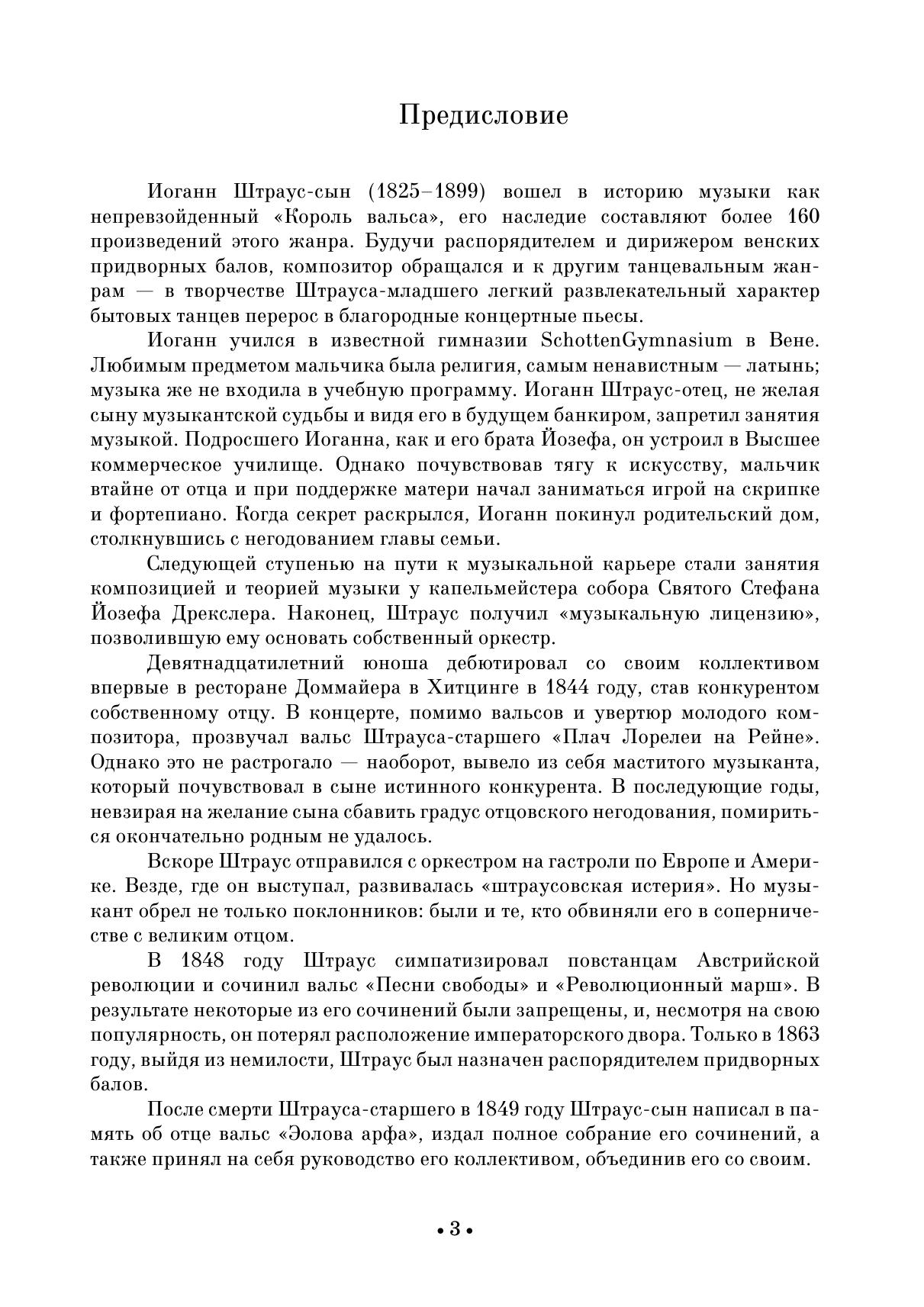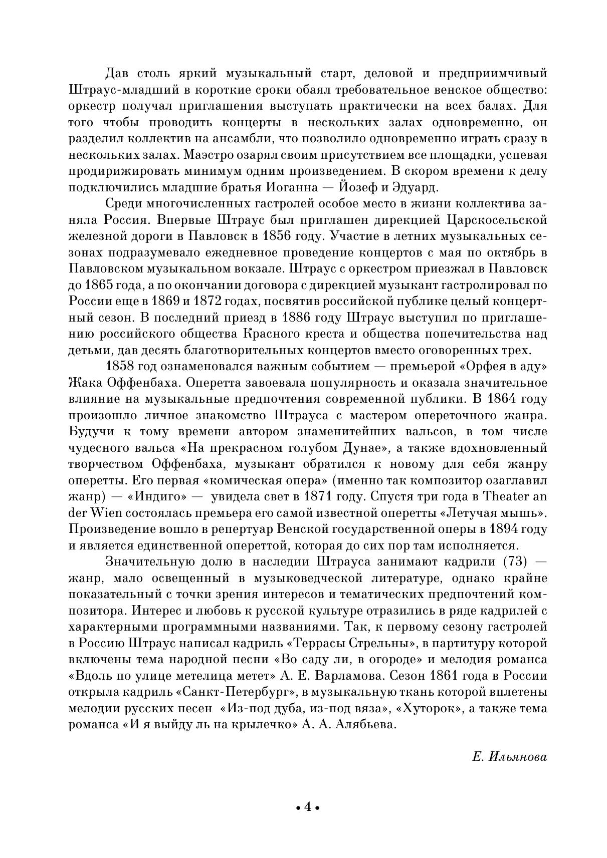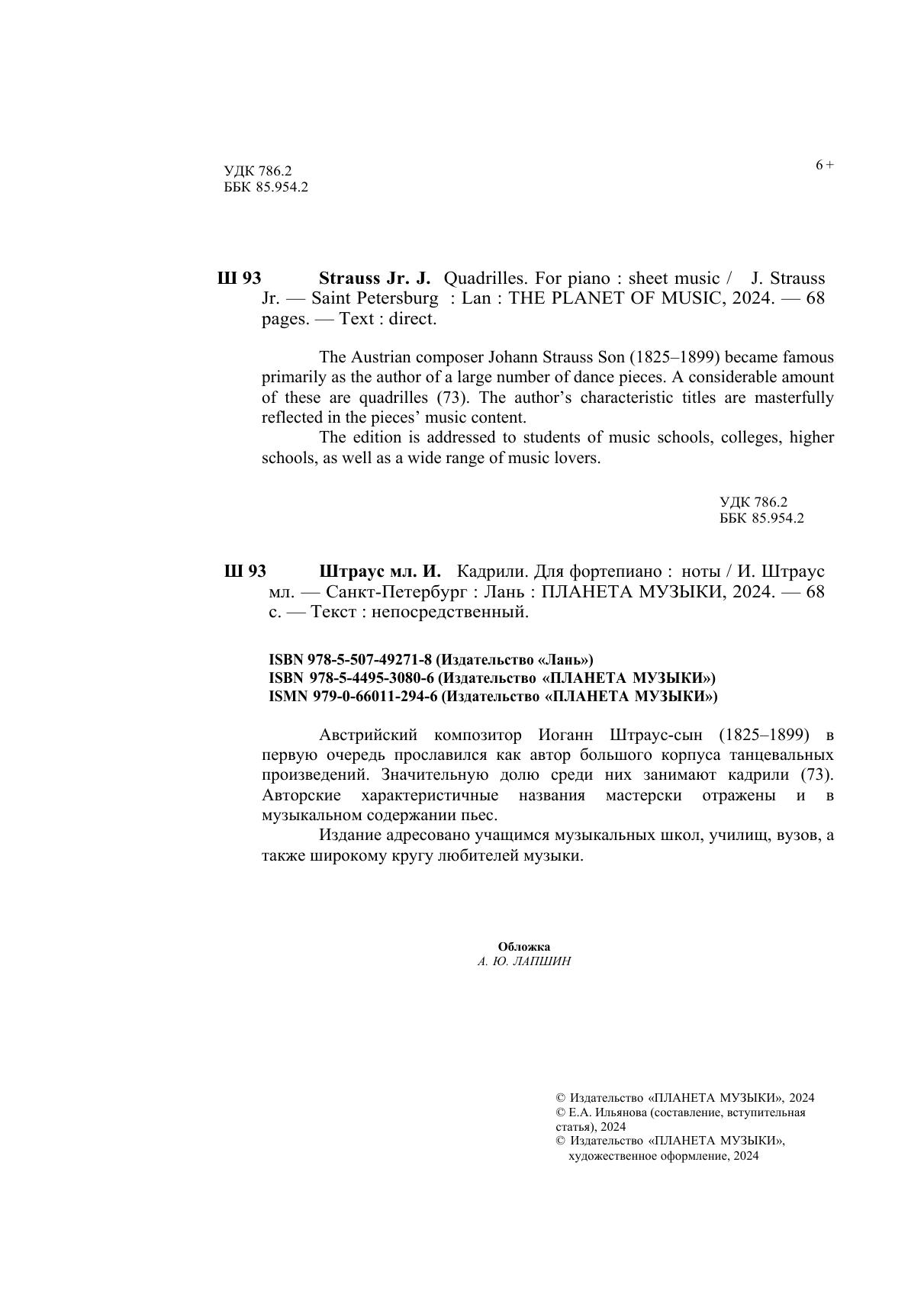 Австрийский композитор Иоганн Штраус-сын (1825-1899) в первую очередь прославился как автор большого корпуса танцевальных произведений. Значительную долю среди них занимают кадрили (73). Авторские характеристичные названия мастерски отражены и в музыкальном содержании пьес. Издание адресовано учащимся музыкальных школ, училищ, вузов, а также широкому кругу любителей музыки. The Austrian composer Johann Strauss Son (1825–1899) became famous primarily as the author of a large number of dance pieces. A considerable amount of these are quadrilles (73). The author’s characteristic titles are masterfully reflected in the pieces’ music content. The edition is addressed to students of music schools, colleges, higher schools, as well as a wide range of music lovers.