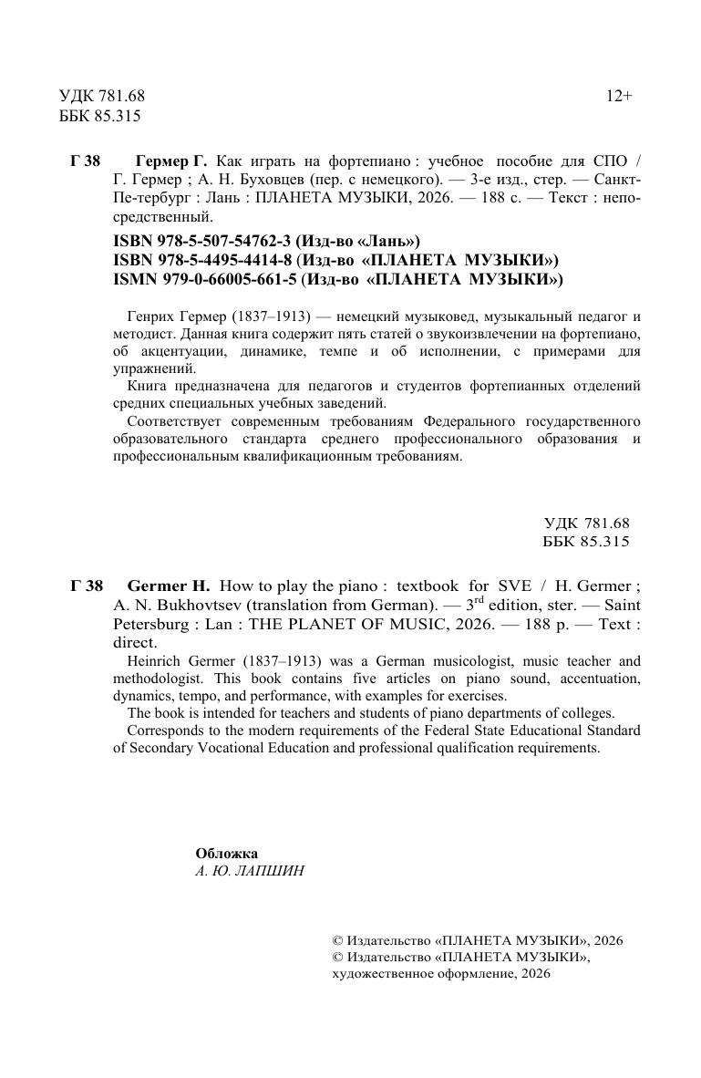 Генрих Гермер, 1837 - 1913 - немецкий музыковед, музыкальный педагог и методист. Данная книга содержит пять статей о звукоизвлечении на фортепиано, об акцентуации, динамике, темпе и об исполнении, с примерами для упражнений. Книга предназначена для педагогов и студентов фортепианных отделений средних специальных учебных заведений. Heinrich Germer, 1837–1913 was a German musicologist, music teacher and methodologist. This book contains five articles on piano sound, accentuation, dynamics, tempo, and performance, with examples for exercises. The book is intended for teachers and students of piano departments of colleges.