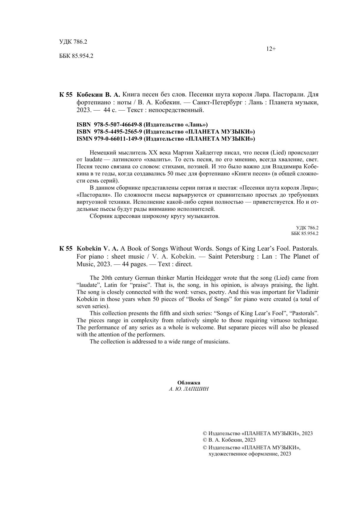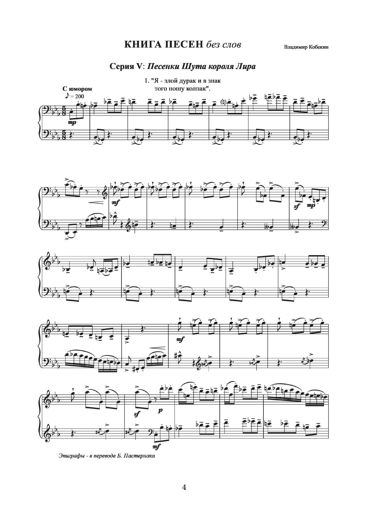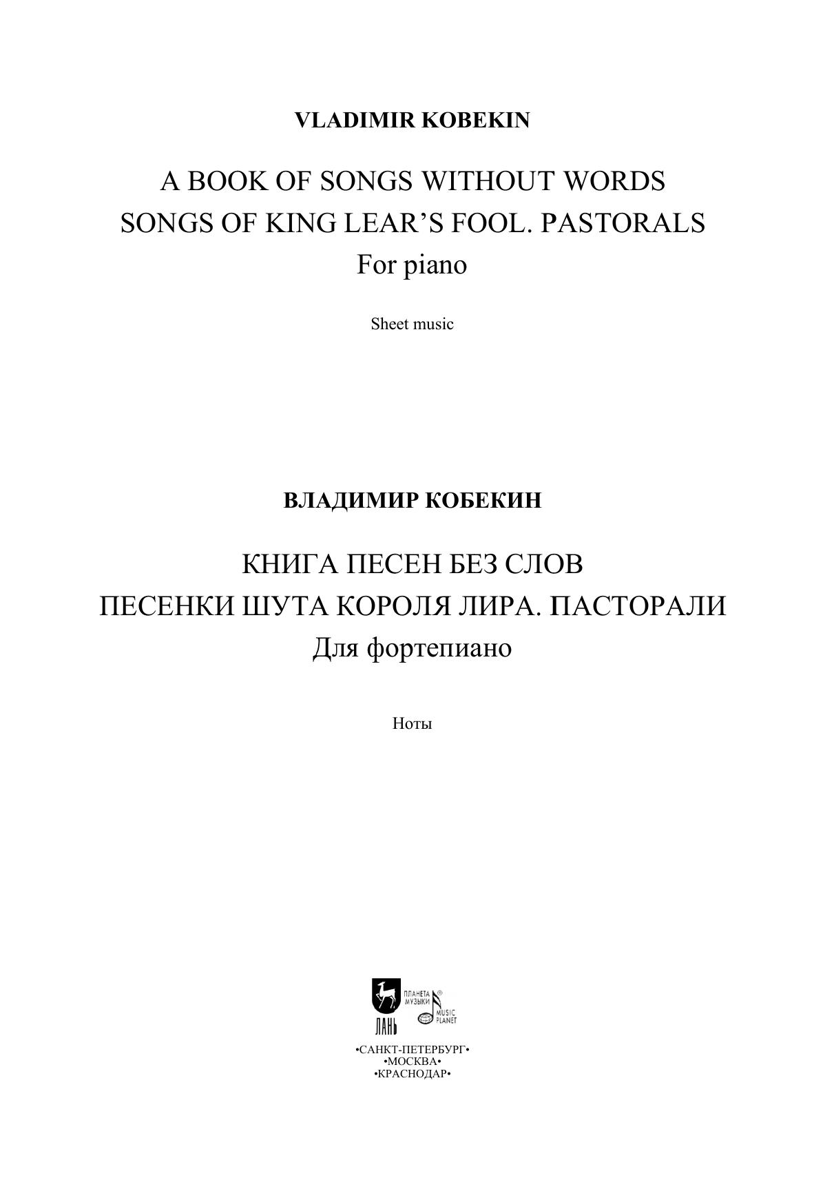 Немецкий мыслитель ХХ века Мартин Хайдеггер писал, что песня (Lied) происходит от laudate –латинского «хвалить». То есть песня, по его мнению, всегда хваление, свет. Песня тесно связана со словом: стихами, поэзией. И это было важно для Владимира Кобекина в те годы, когда создавались 50 пьес для фортепиано «Книги песен» (в общей сложности семь серий). В данном сборнике представлены серии пятая и шестая: "Песенки шута короля Лира", "Пасторали". По сложности пьесы варьируются от сравнительно простых до требующих виртуозной техники. Исполнение какой-либо серии полностью – приветствуется. Но и отдельные пьесы будут рады вниманию исполнителей. Сборник адресован широкому кругу музыкантов. The 20th century German thinker Martin Heidegger wrote that the song (Lied) came from “laudate”, Latin for “praise”. That is, the song, in his opinion, is always praising, the light. The song is closely connected with the word: verses, poetry. And this was important for Vladimir Kobekin in those years when 50 pieces of “Books of Songs” for piano were created (a total of seven series). This collection presents the fifth and sixth series: “Songs of King Lear’s Fool”, “Pastorals”. The pieces range in complexity from relatively simple to those requiring virtuoso technique. The performance of any series as a whole is welcome. But separare pieces will also be pleased with the attention of the performers. The collection is addressed to a wide range of musicians.