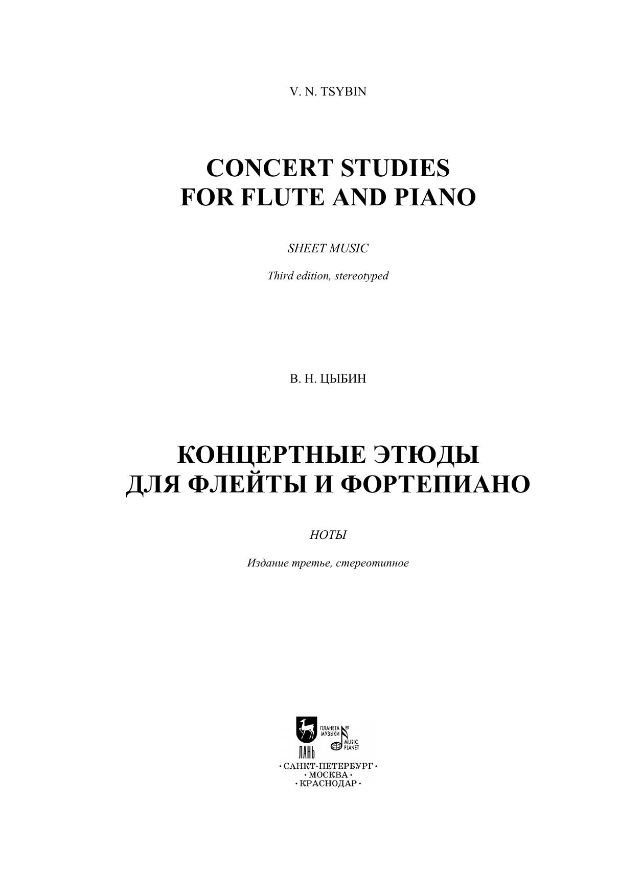 Российского и советского флейтиста и педагога Владимира Николаевича Цыбина (1877-1949) считают основоположником отечественной флейтовой школы. Обладая незаурядным композиторским талантом, Цыбин значительно обогатил современный исполнительский репертуар. В числе самых популярных его сочинений – Концертные этюды для флейты и фортепиано. Издание адресовано ученикам старших классов ДМШ и ДШИ, студентам музыкальных училищ и колледжей. Vladimir Nikolaevich Tsybin (1877–1949), Russian and Soviet flutist and teacher, is considered to be the founder of Russian flute school. A gifted composer, Tsybin significantly enriched the contemporary performing repertoire. Among his most popular works are Concert Studies for flute and piano. The edition is addressed to pupils of senior grades of children’s music schools and children’s schools of arts and students of music colleges.