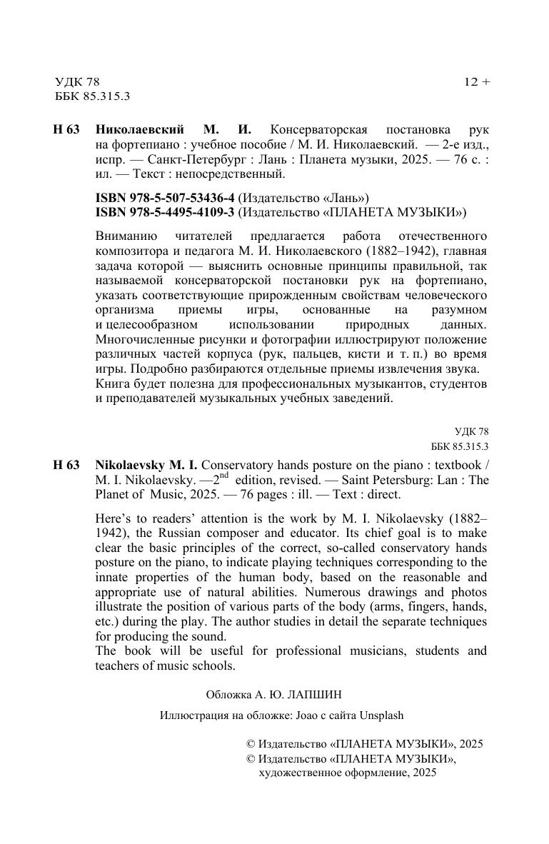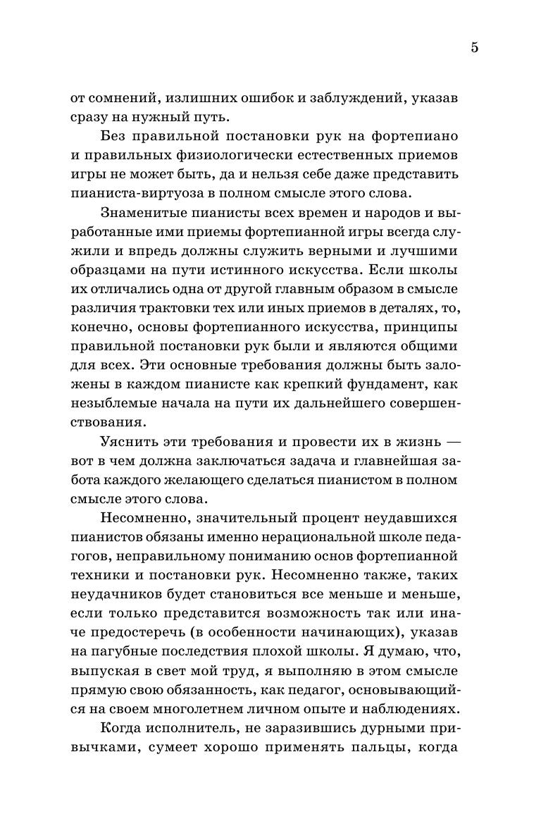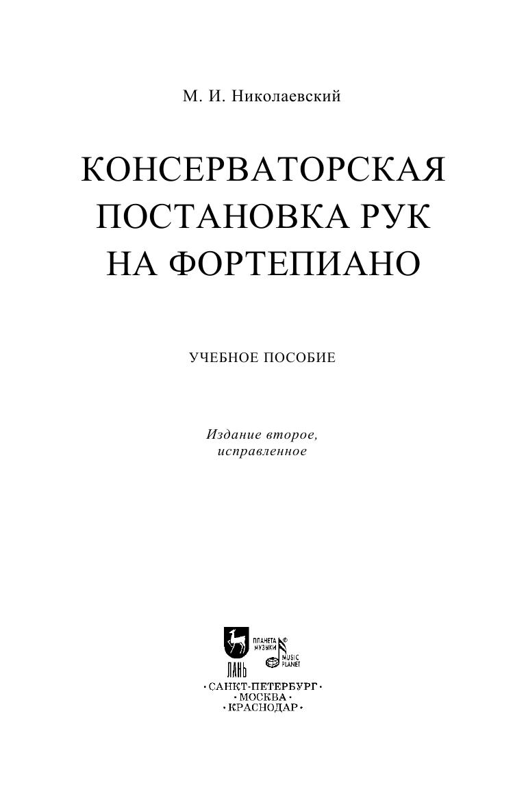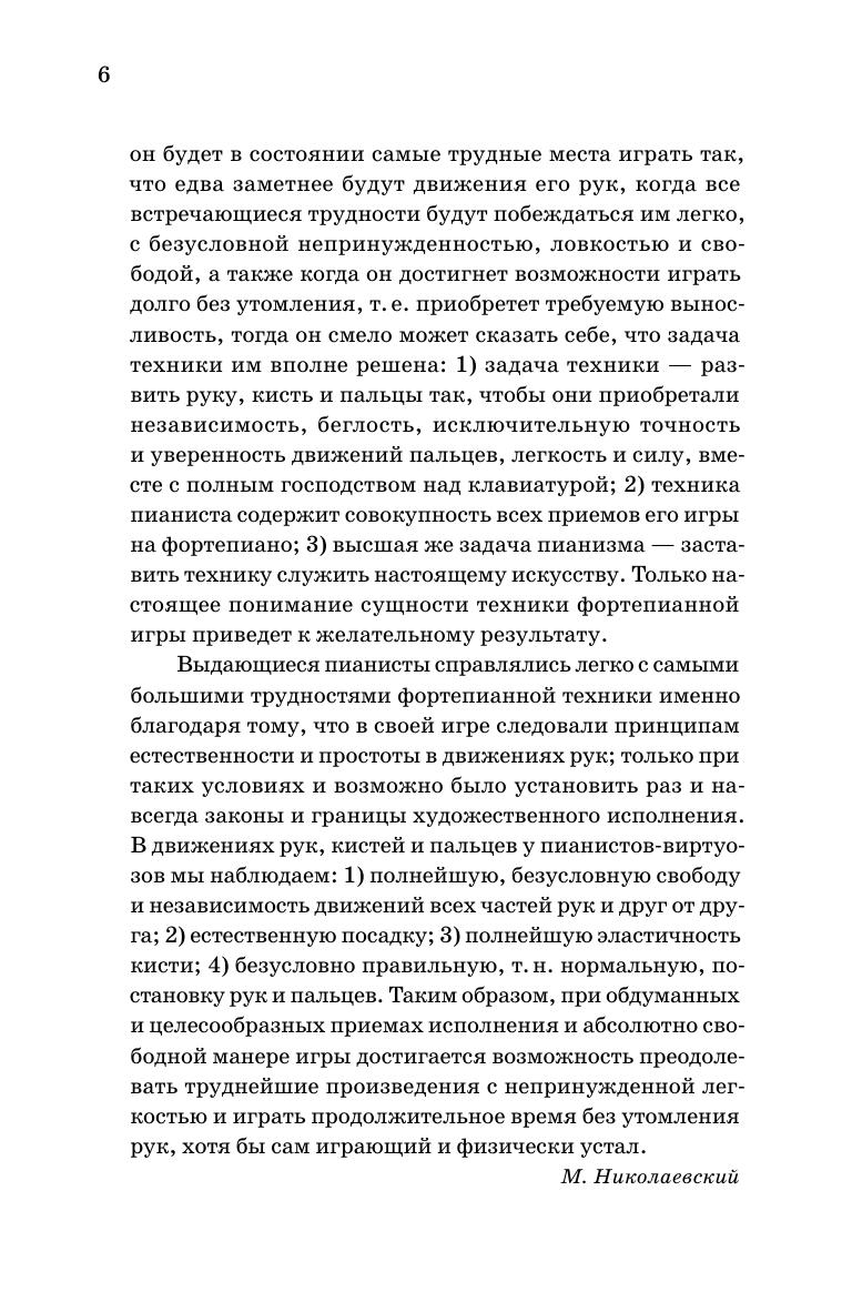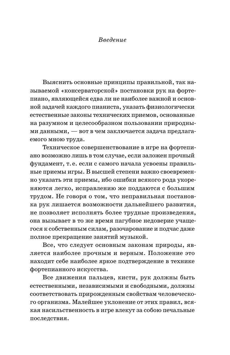 Вниманию читателей предлагается работа отечественного композитора и педагога М. И. Николаевского (1882–1942), главная задача которой --- выяснить основные принципы правильной, так называемой консерваторской постановки рук на фортепиано, указать соответствующие прирожденным свойствам человеческого организма приемы игры, основанные на разумном и целесообразном использовании природных данных. Многочисленные рисунки и фотографии иллюстрируют положение различных частей корпуса (рук, пальцев, кисти и т.п.) во время игры. Подробно разбираются отдельные приемы извлечения звука. Книга будет полезна для профессиональных музыкантов, студентов и преподавателей музыкальных учебных заведений. Here’s to readers’ attention is the work by M. I. Nikolaevsky (1882–1942), the Russian composer and educator. Its chief goal is to make clear the basic principles of the correct, so-called conservatory hands posture on the piano, to indicate playing techniques corresponding to the innate properties of the human body, based on the reasonable and appropriate use of natural abilities. Numerous drawings and photos illustrate the position of various parts of the body (arms, fingers, hands, etc.) during the play. The author studies in detail the separate techniques for producing the sound. The book will be useful for professional musicians, students and teachers of music schools.